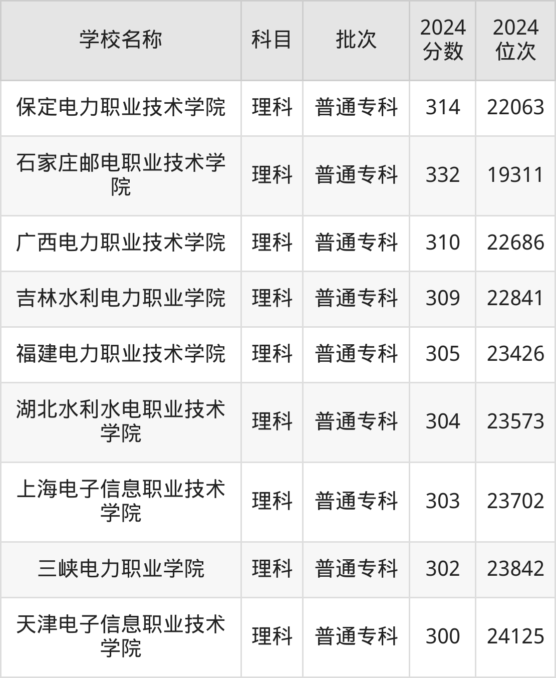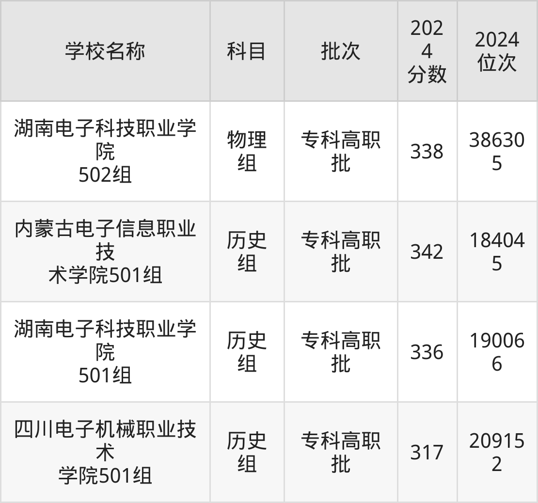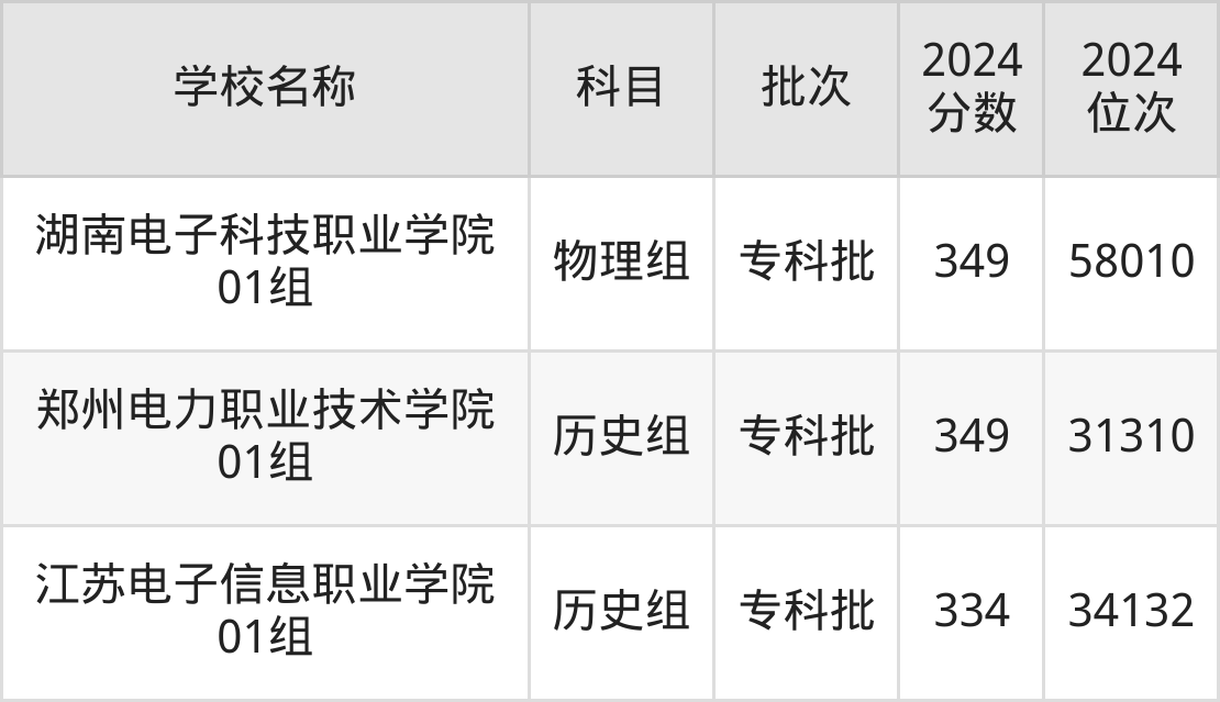 广东高考历史组共有3所电力大学在300到350分之间录取,包含内蒙古电子信息职业技术学院、湖南电子科技职业学院、四川电子机械职业技术学院。