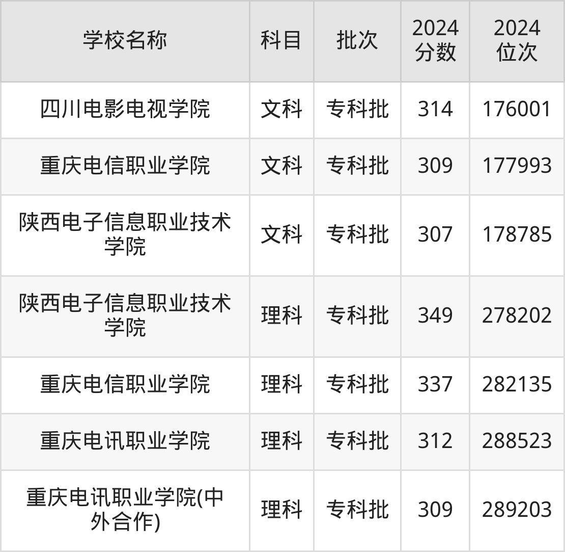 四川高考文科共有3所电力大学在300到350分之间录取,包含四川电影电视学院、重庆电信职业学院、陕西电子信息职业技术学院。