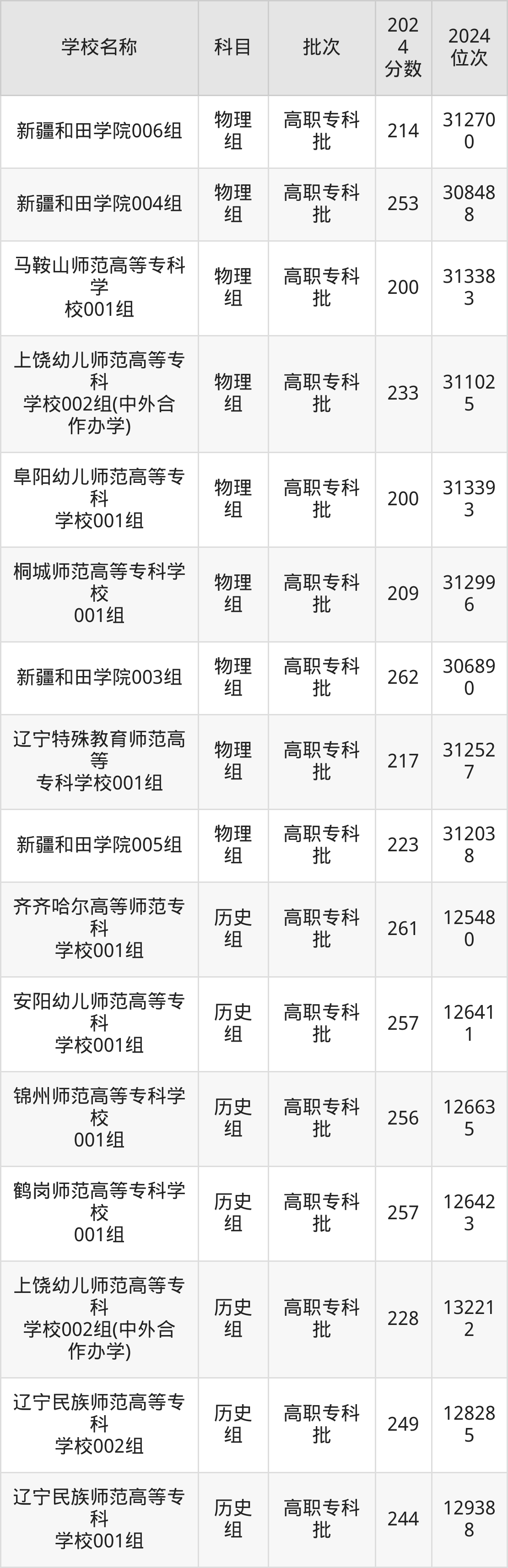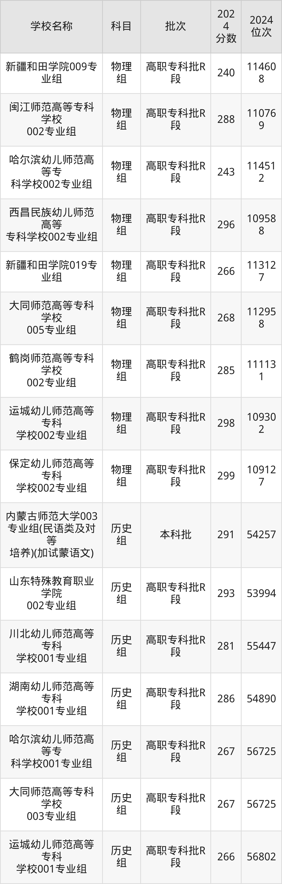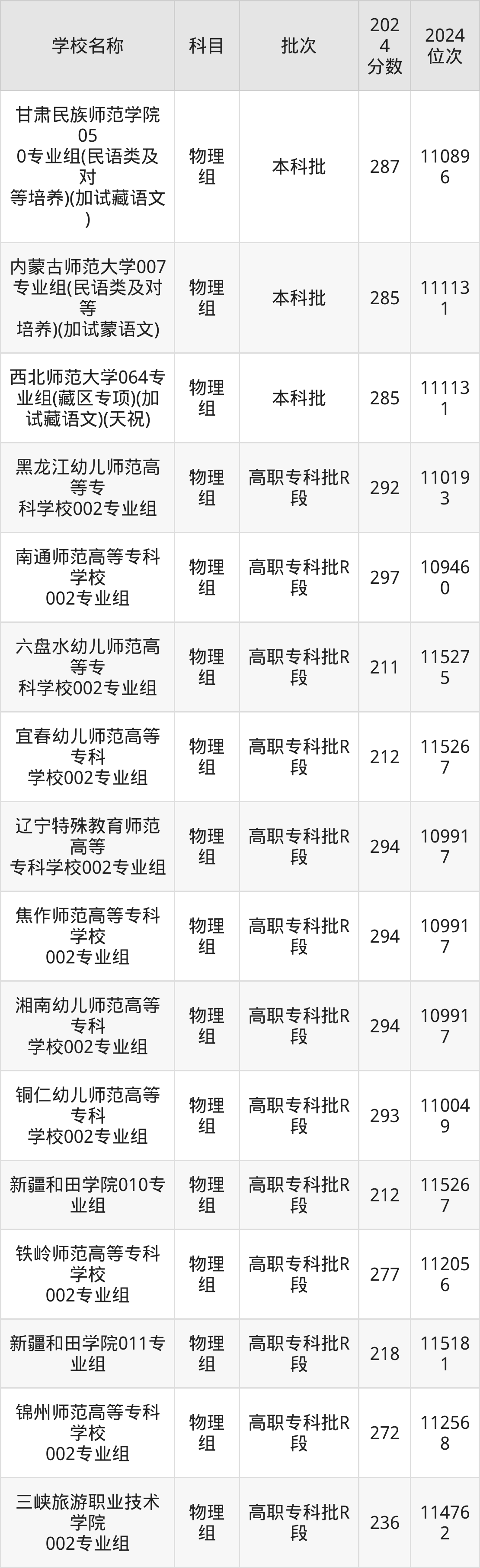 安徽高考物理组共有6所师范大学在200到300分之间录取,包含新疆和田学院、上饶幼儿师范高等专科学校、辽宁特殊教育师范高等专科学校、桐城师范高等专科学校、阜阳幼儿师范高等专科学校、马鞍山师范高等专科学校。