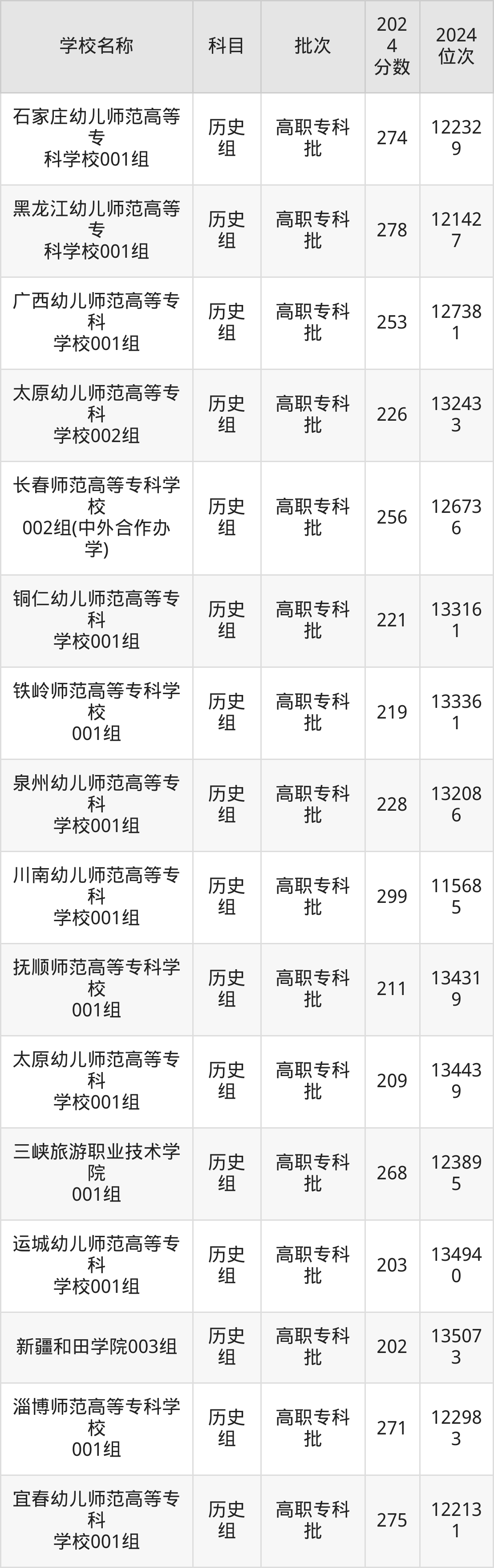 安徽高考历史组共有22所师范大学在200到300分之间录取,包含川南幼儿师范高等专科学校、黑龙江幼儿师范高等专科学校、宜春幼儿师范高等专科学校、石家庄幼儿师范高等专科学校、淄博师范高等专科学校、三峡旅游职业技术学院、齐齐哈尔高等师范专科学校、安阳幼儿师范高等专科学校、鹤岗师范高等专科学校、长春师范高等专科学校。