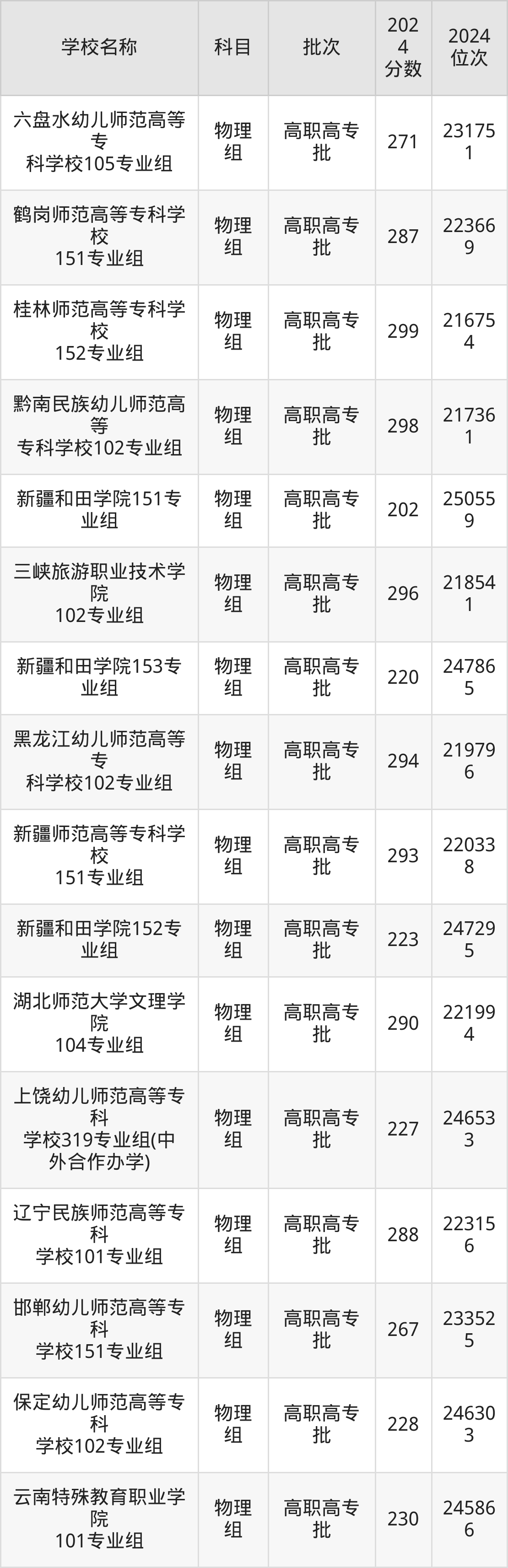 广西高考物理组共有24所师范大学在200到300分之间录取,包含石家庄幼儿师范高等专科学校、桂林师范高等专科学校、黔南民族幼儿师范高等专科学校、三峡旅游职业技术学院、齐齐哈尔高等师范专科学校、黑龙江幼儿师范高等专科学校、新疆师范高等专科学校、湖北师范大学文理学院、辽宁民族师范高等专科学校、鹤岗师范高等专科学校。