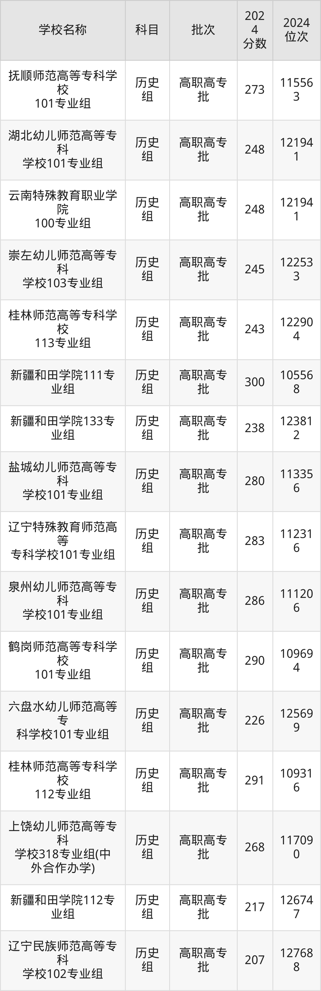 广西高考历史组共有21所师范大学在200到300分之间录取,包含新疆和田学院、三峡旅游职业技术学院、桂林师范高等专科学校、鹤岗师范高等专科学校、泉州幼儿师范高等专科学校、辽宁特殊教育师范高等专科学校、盐城幼儿师范高等专科学校、黑龙江幼儿师范高等专科学校、抚顺师范高等专科学校、上饶幼儿师范高等专科学校。