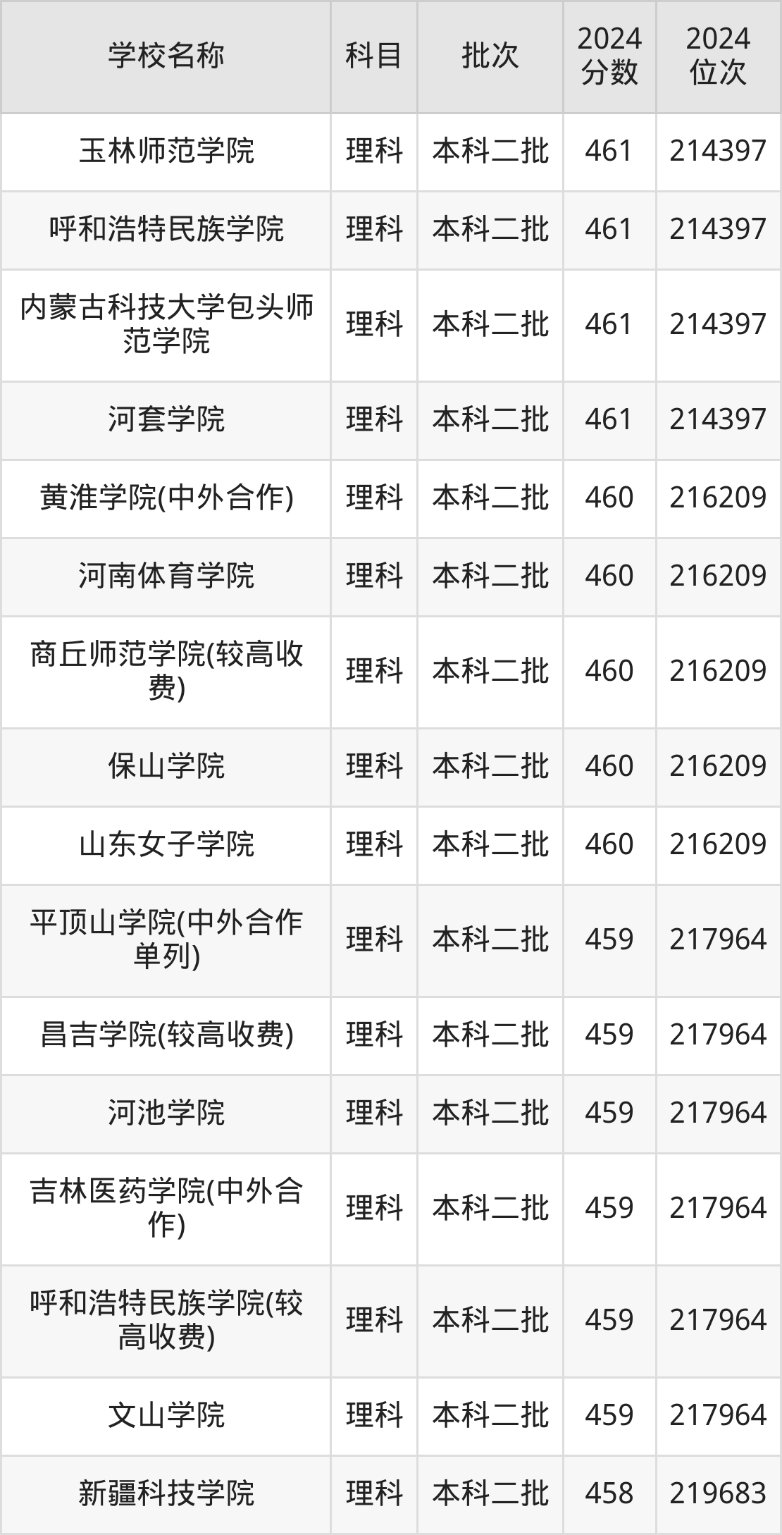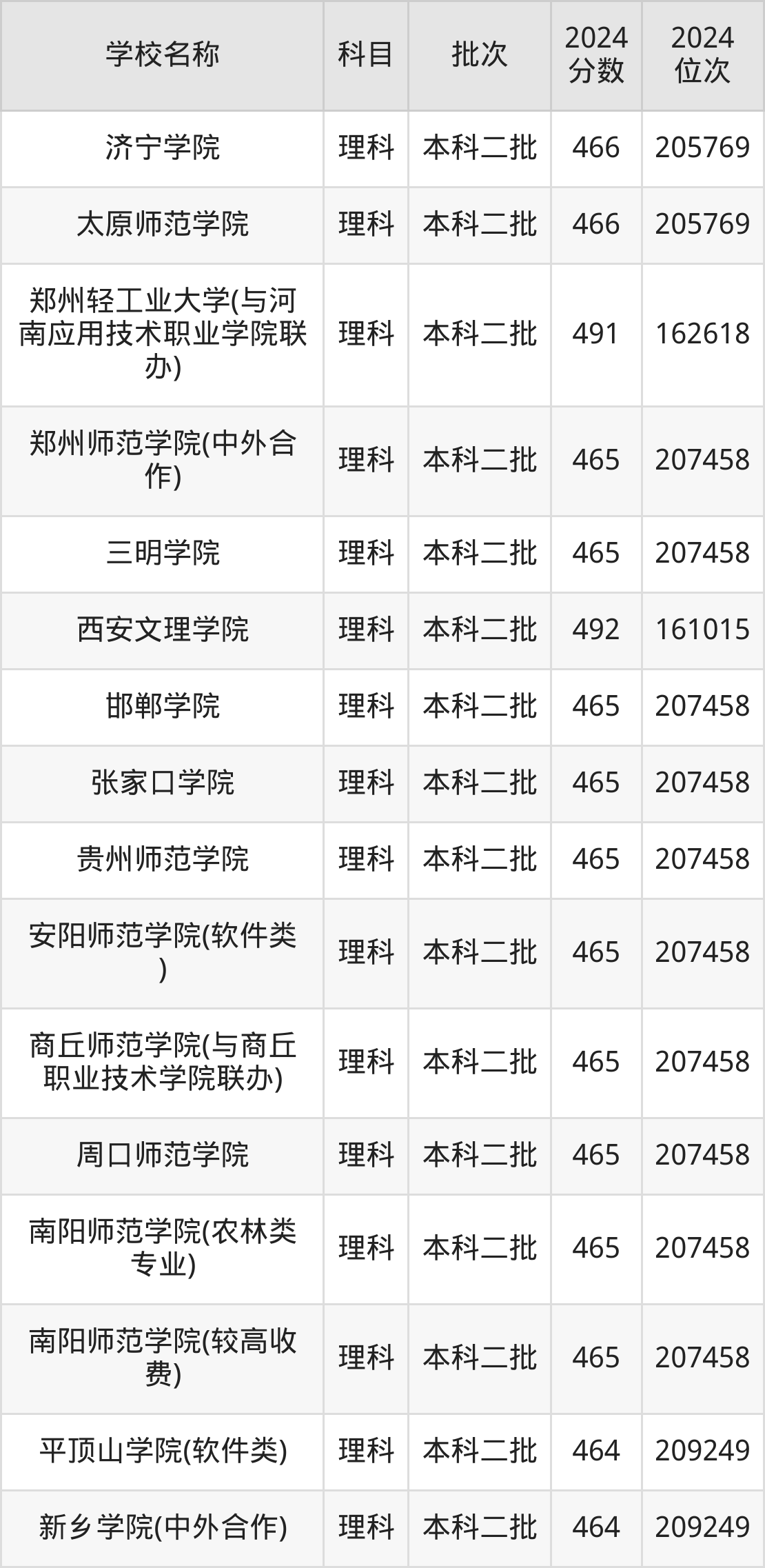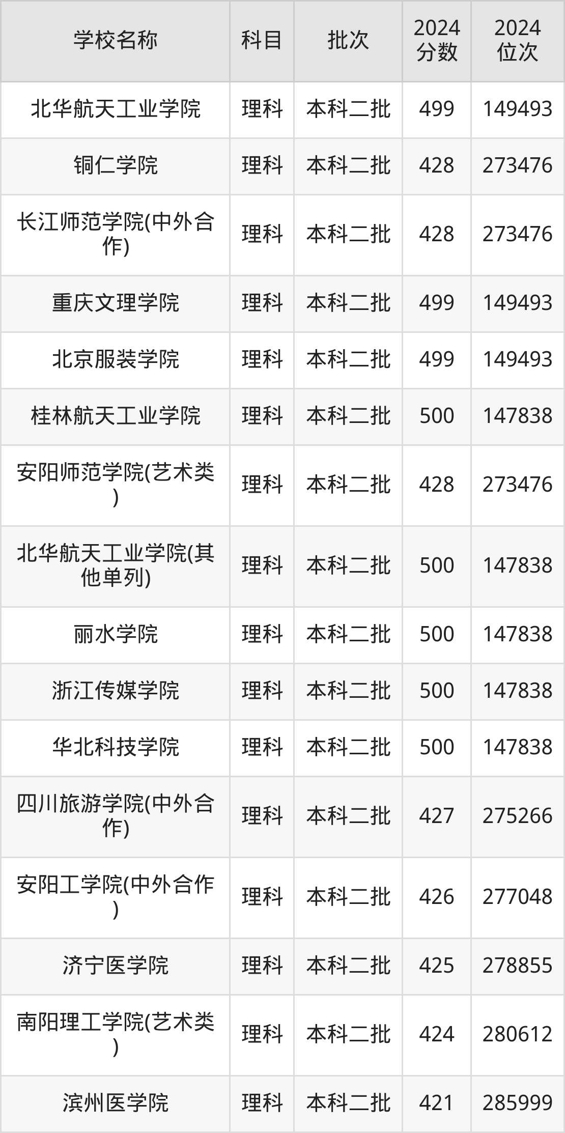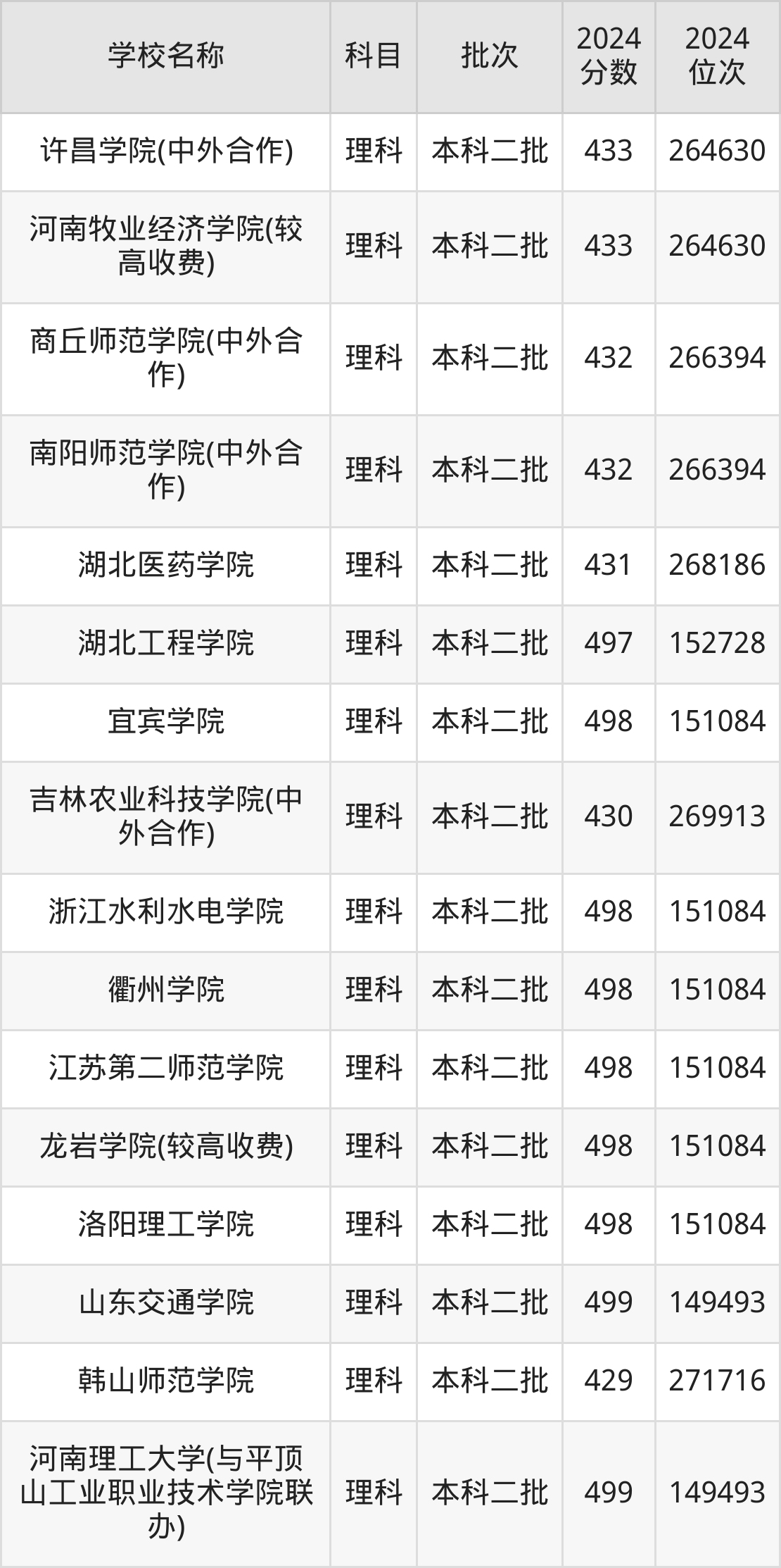 河南高考理科共有360所二本公办大学在400到500分之间录取,包含华北科技学院、浙江传媒学院、丽水学院、北华航天工业学院(其他单列)、桂林航天工业学院、北京服装学院、重庆文理学院、北华航天工业学院、河南理工大学(与平顶山工业职业技术学院联办)、山东交通学院。