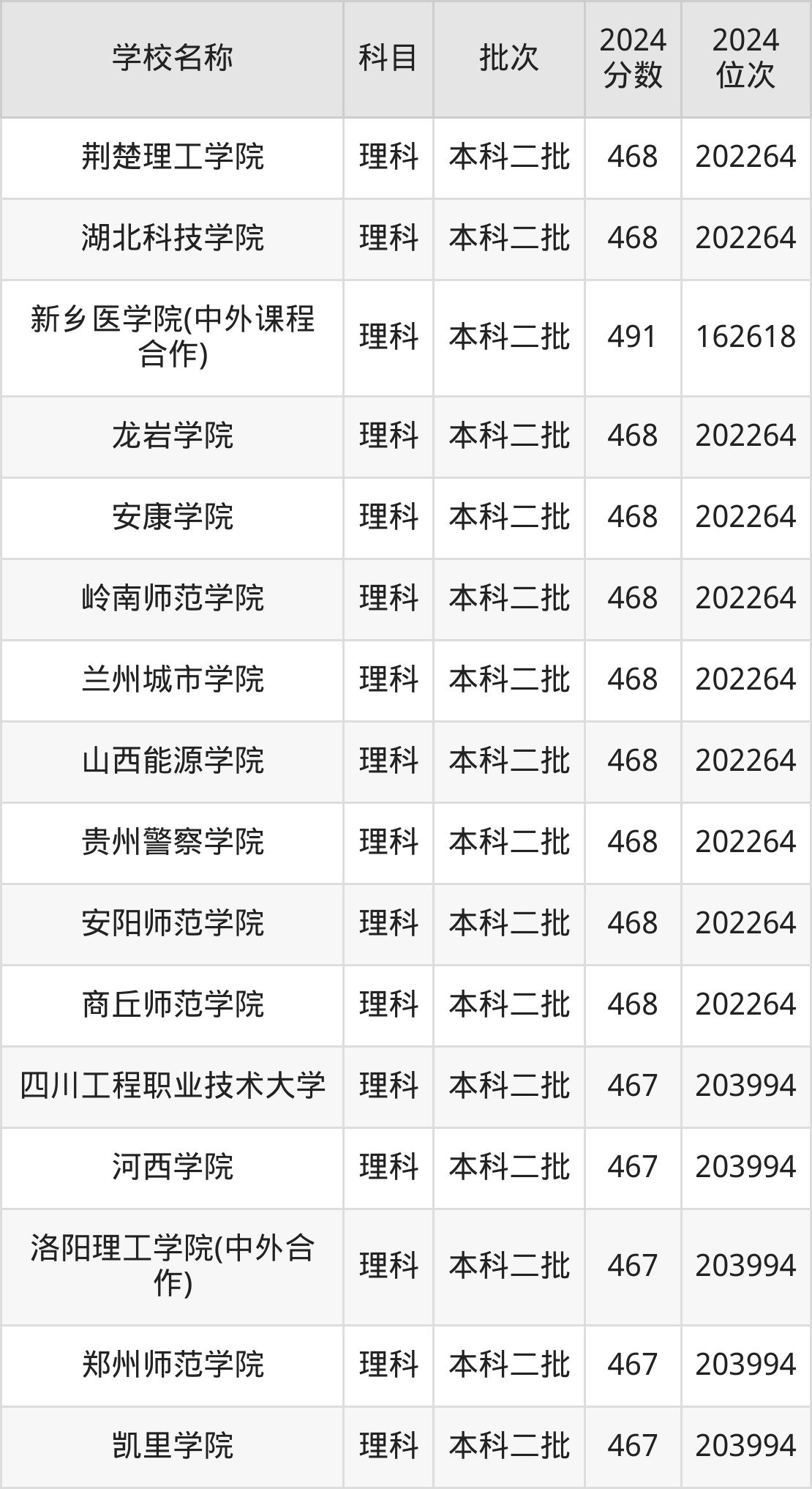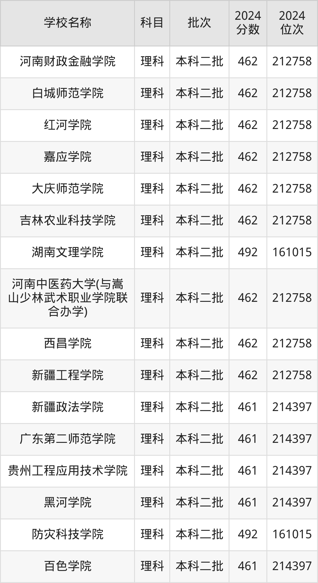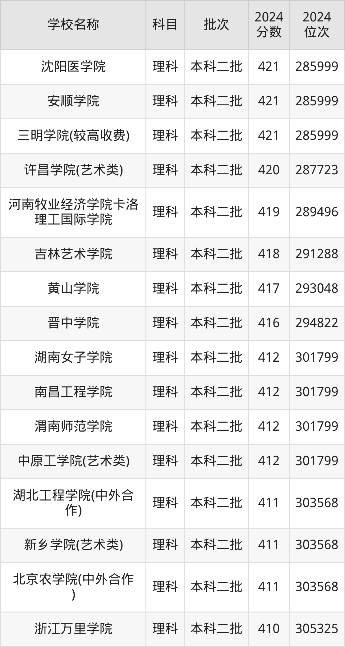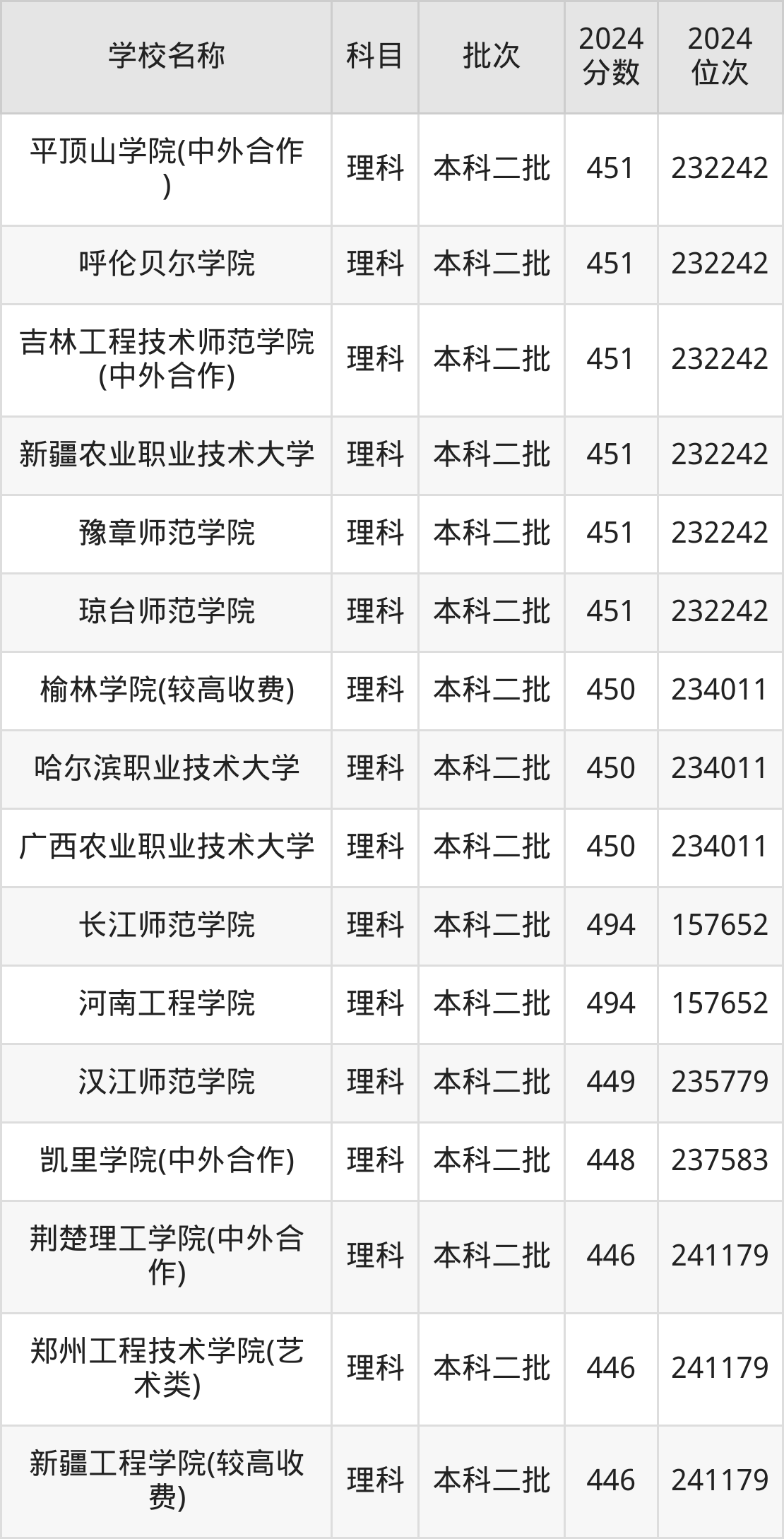河南高考理科共有360所二本公办大学在400到500分之间录取,包含华北科技学院、浙江传媒学院、丽水学院、北华航天工业学院(其他单列)、桂林航天工业学院、北京服装学院、重庆文理学院、北华航天工业学院、河南理工大学(与平顶山工业职业技术学院联办)、山东交通学院。