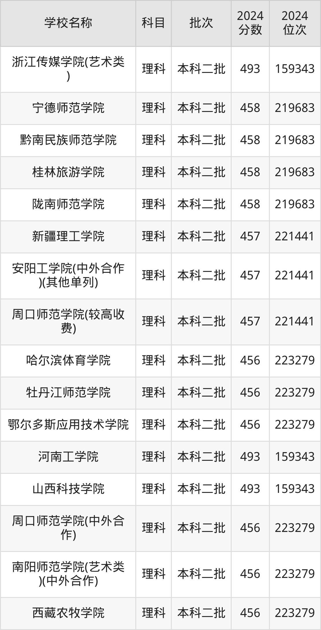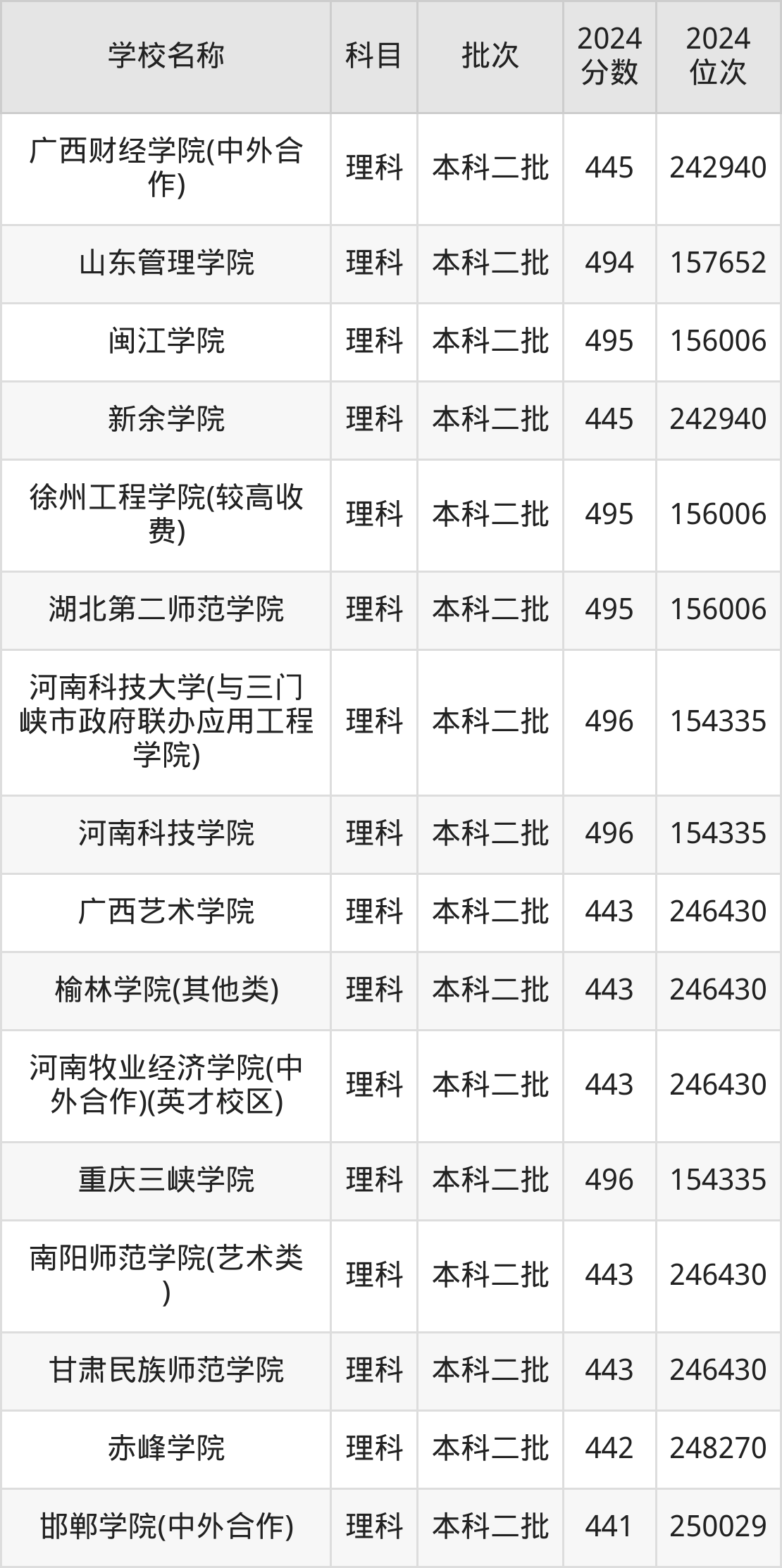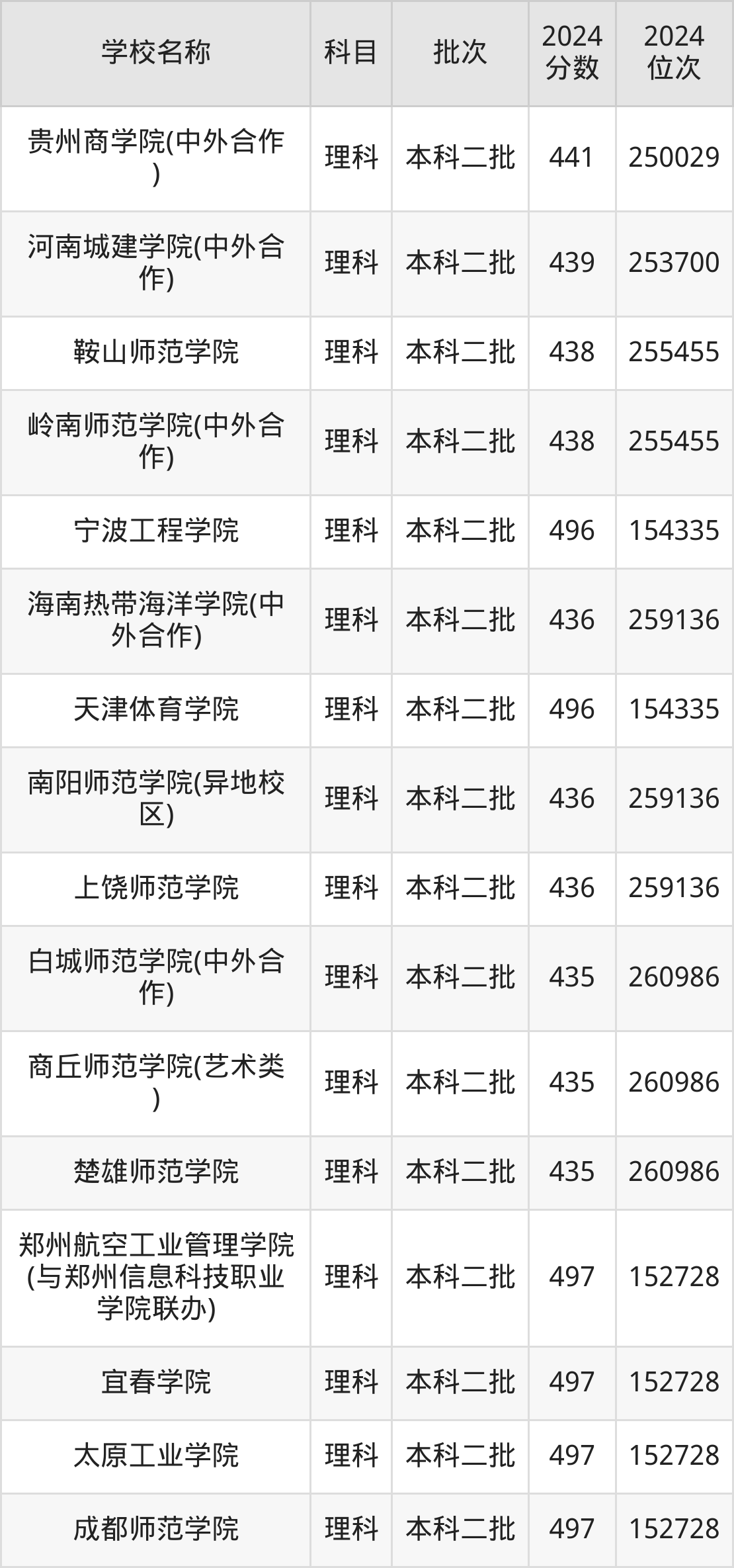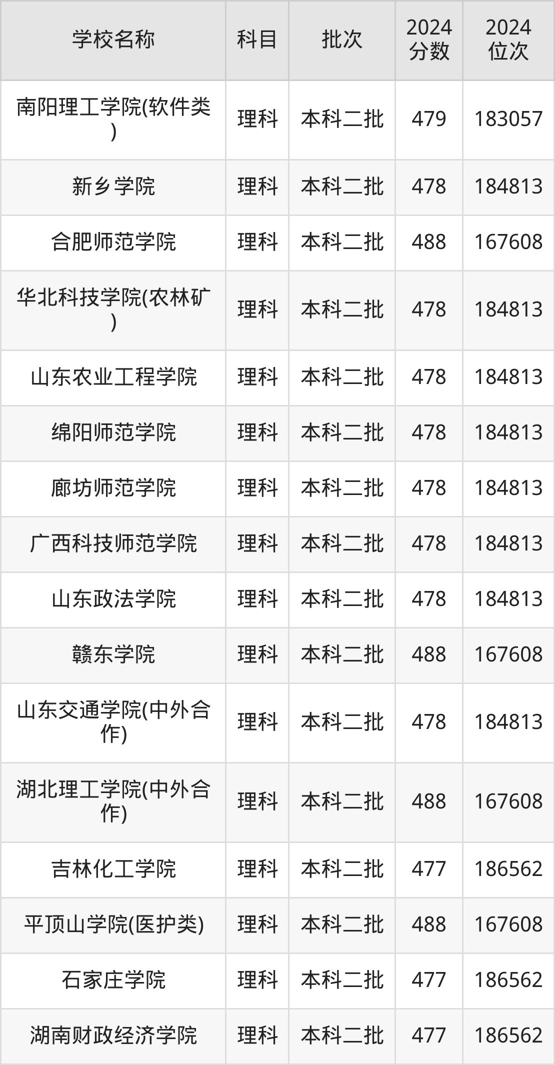 河南高考理科共有360所二本公办大学在400到500分之间录取,包含华北科技学院、浙江传媒学院、丽水学院、北华航天工业学院(其他单列)、桂林航天工业学院、北京服装学院、重庆文理学院、北华航天工业学院、河南理工大学(与平顶山工业职业技术学院联办)、山东交通学院。