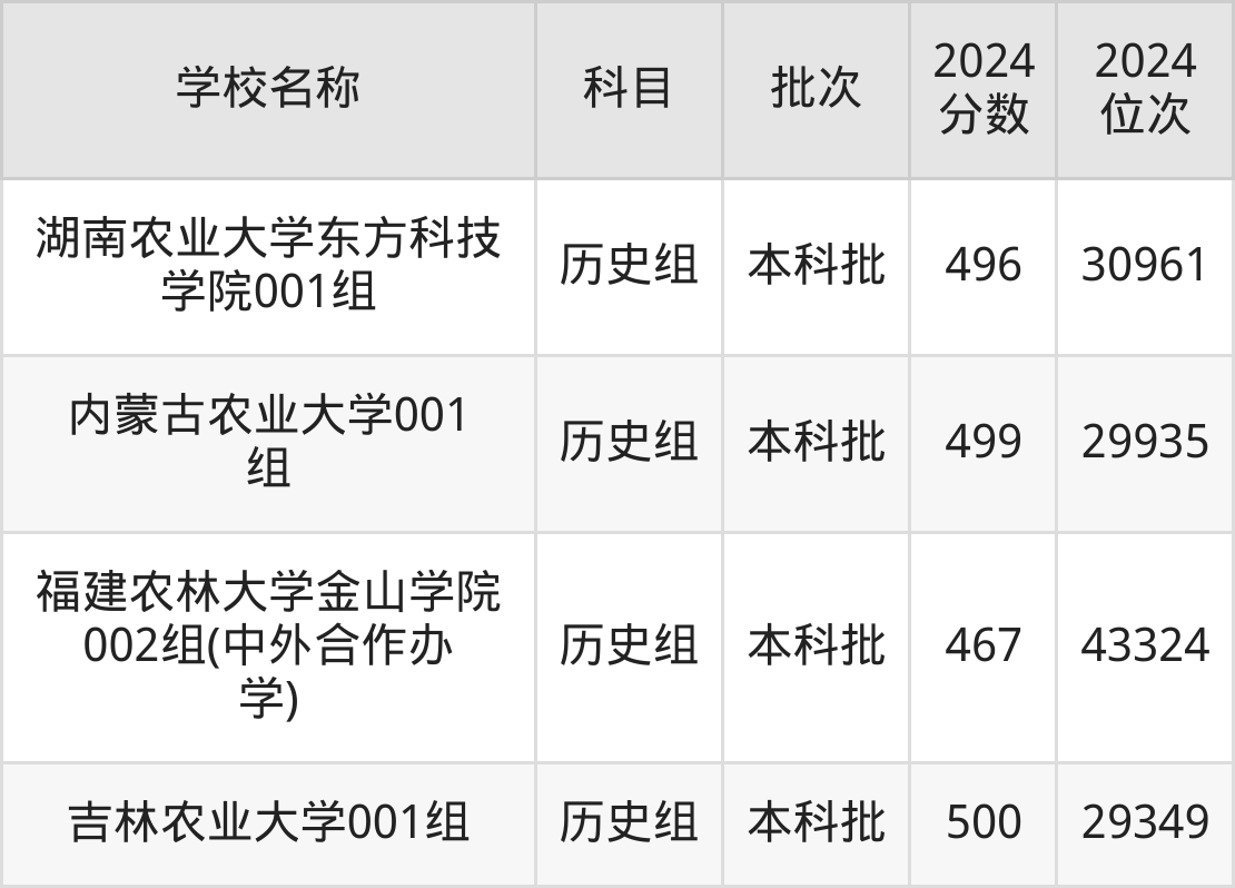 江西高考历史组共有8所农业大学在450到500分之间录取,包含湖南农业大学东方科技学院、新疆农业大学、福建农林大学金山学院、江西农业大学南昌商学院、江西农业大学、江苏农林职业技术学院、苏州农业职业技术学院、江苏农牧科技职业学院。