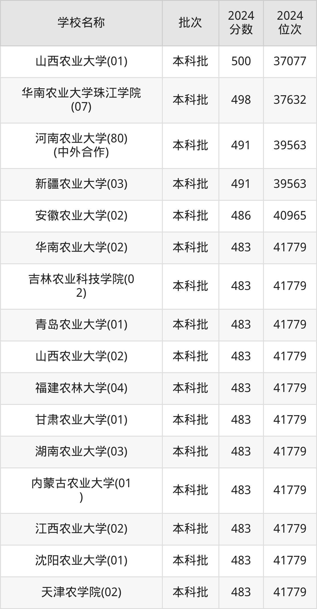 一、450到500分的农业大学最低分一览表