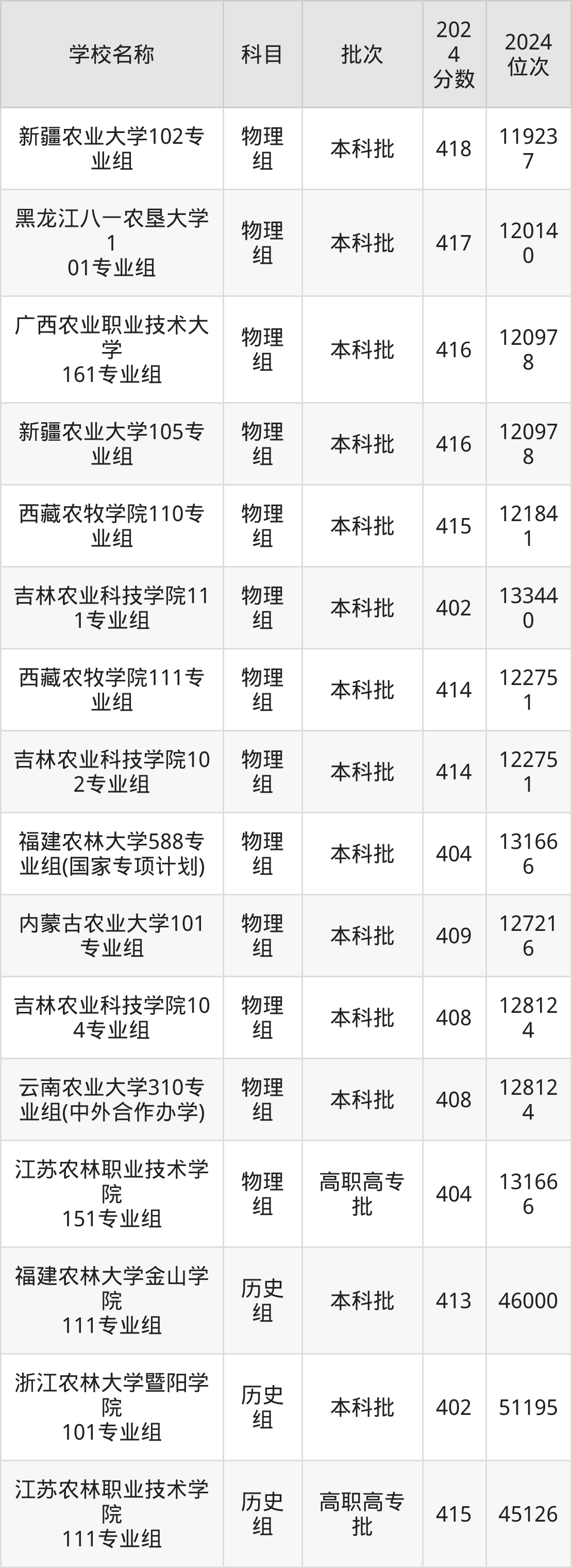 广西高考历史组共有3所农业大学在400到420分之间录取,包含江苏农林职业技术学院、福建农林大学金山学院、浙江农林大学暨阳学院。