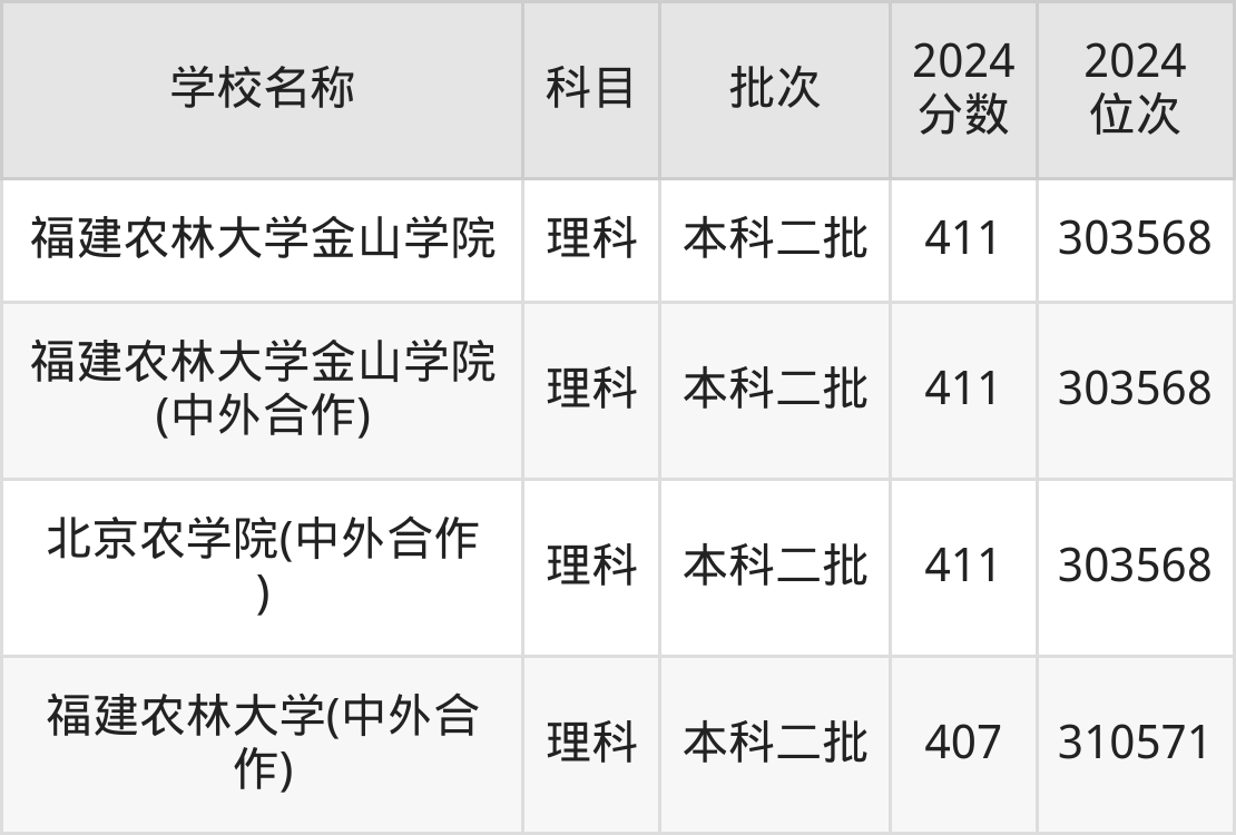 河南高考理科共有4所农业大学在400到420分之间录取,包含福建农林大学金山学院、福建农林大学金山学院(中外合作)、北京农学院(中外合作)、福建农林大学(中外合作)。