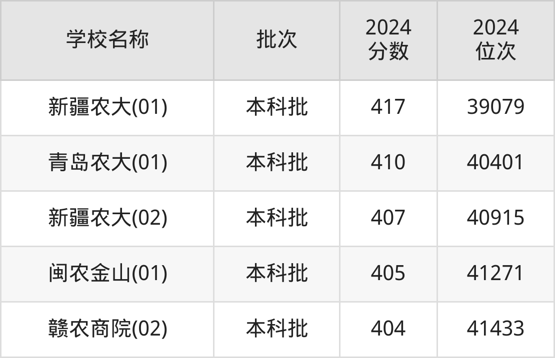 上海高考共有4所农业大学在400到420分之间录取,包含新疆农业大学、青岛农业大学、福建农林大学金山学院、江西农业大学南昌商学院。
