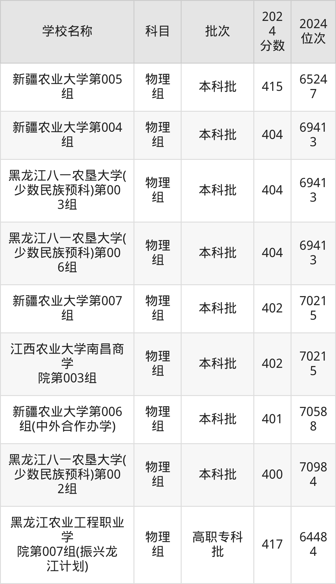 黑龙江高考物理组共有4所农业大学在400到420分之间录取,包含黑龙江农业工程职业学院、新疆农业大学、黑龙江八一农垦大学(少数民族预科)、江西农业大学南昌商学院。