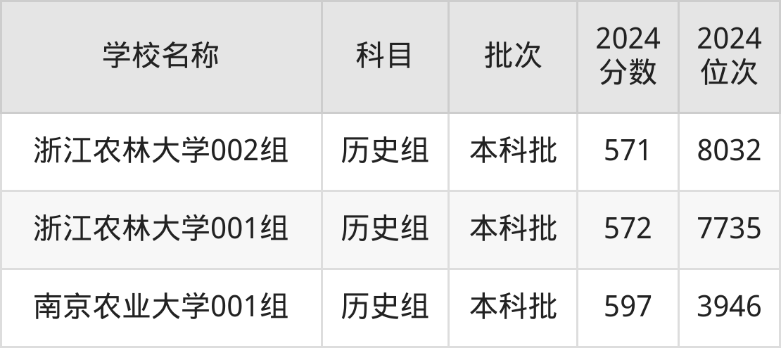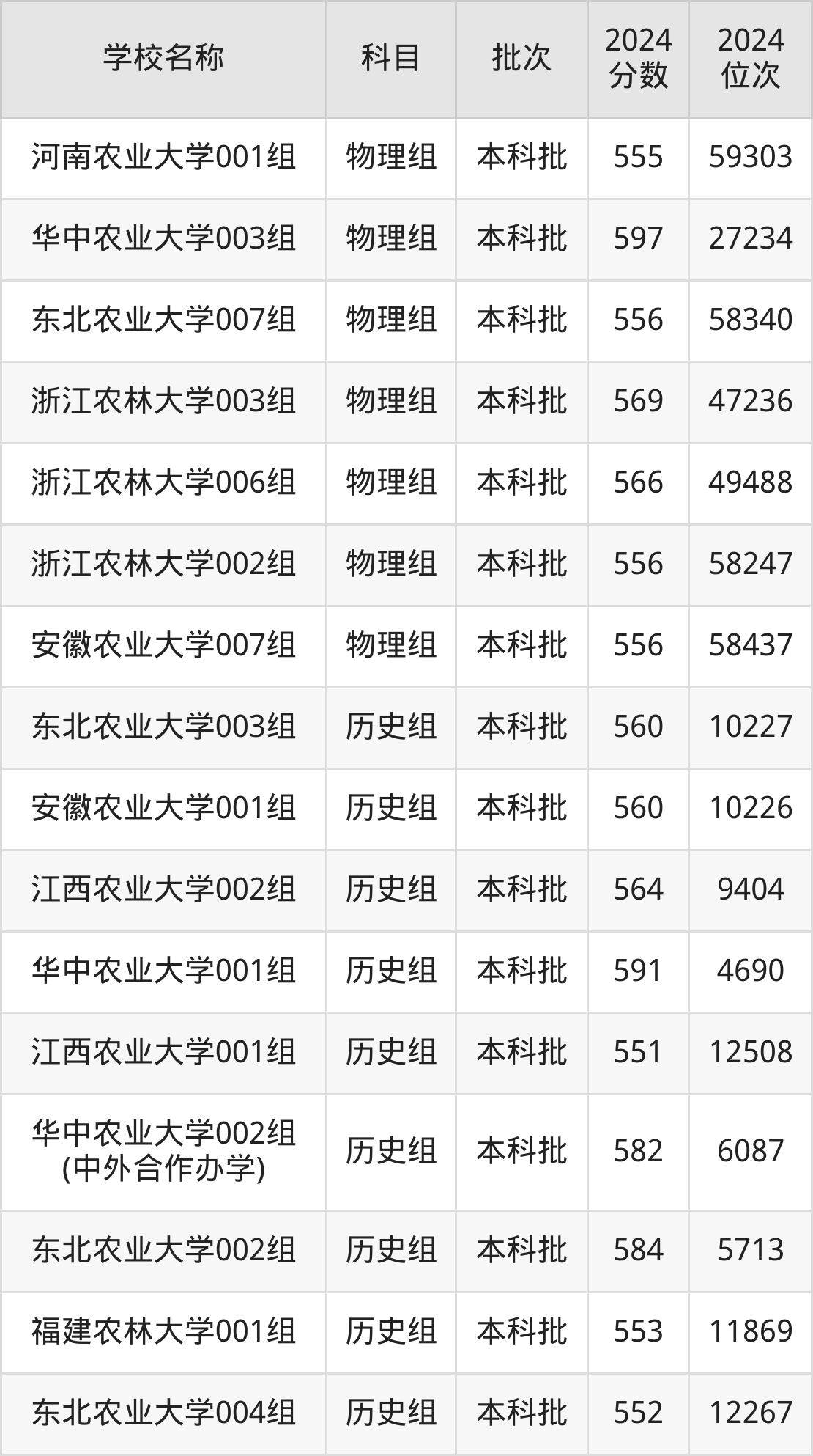安徽高考历史组共有7所农业大学在550到600分之间录取,包含南京农业大学、华中农业大学、东北农业大学、浙江农林大学、江西农业大学、安徽农业大学、福建农林大学。