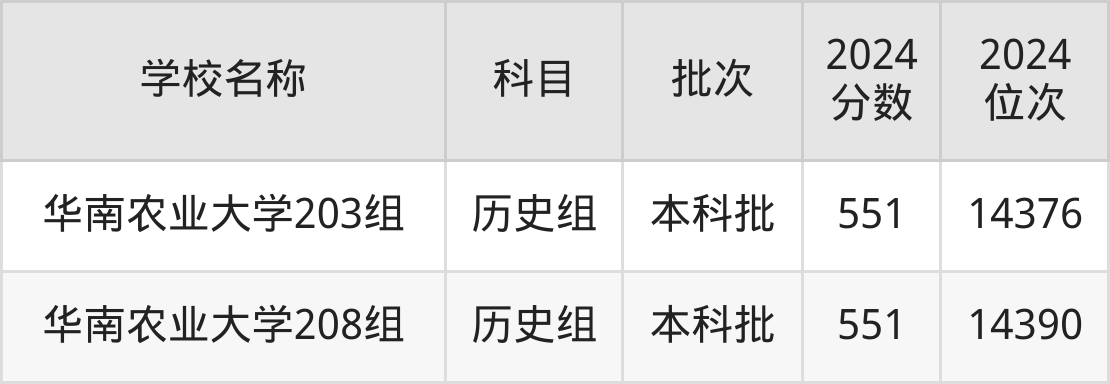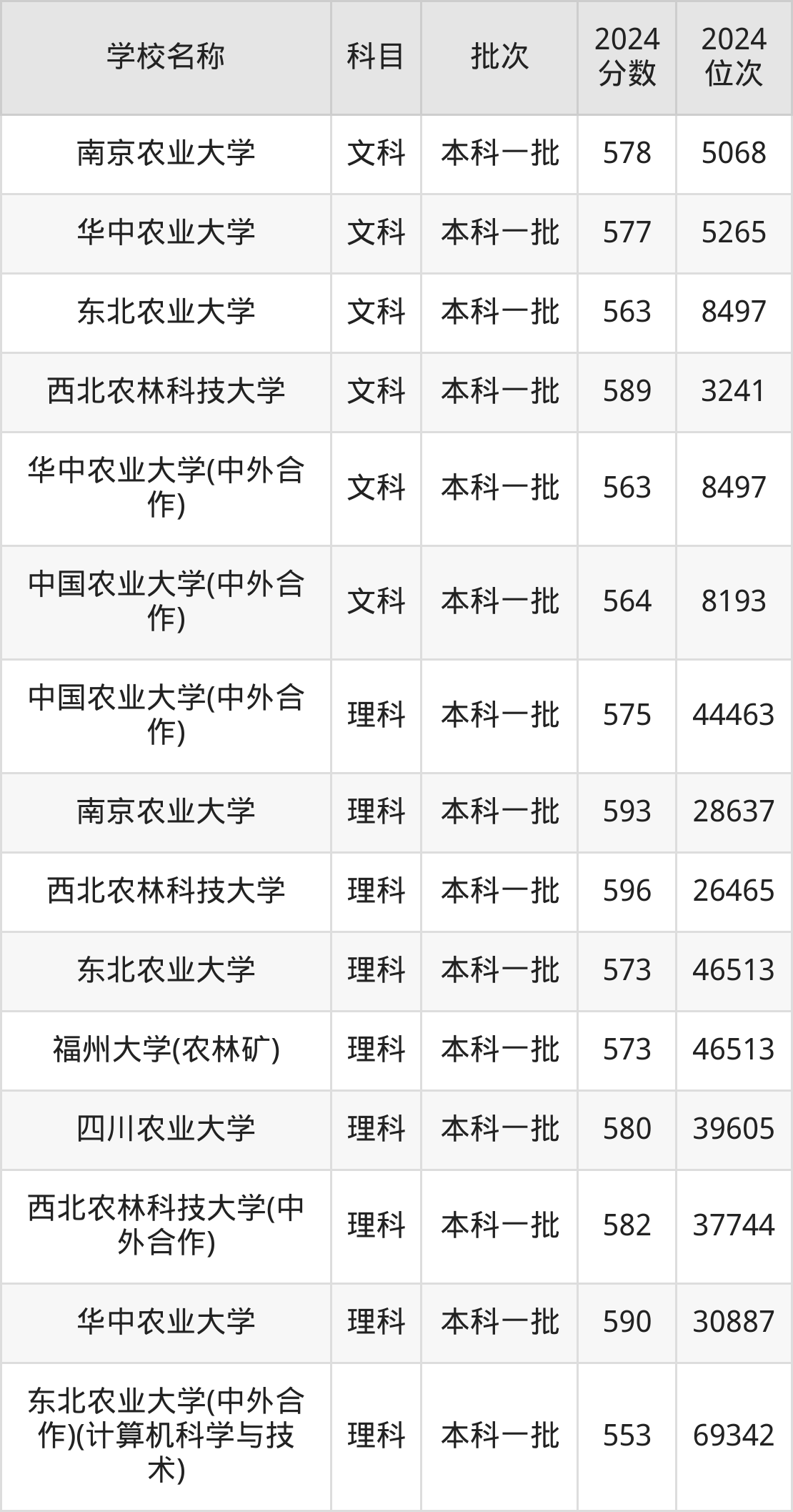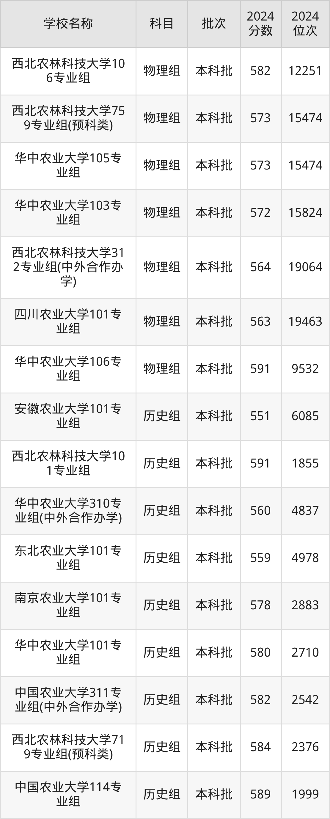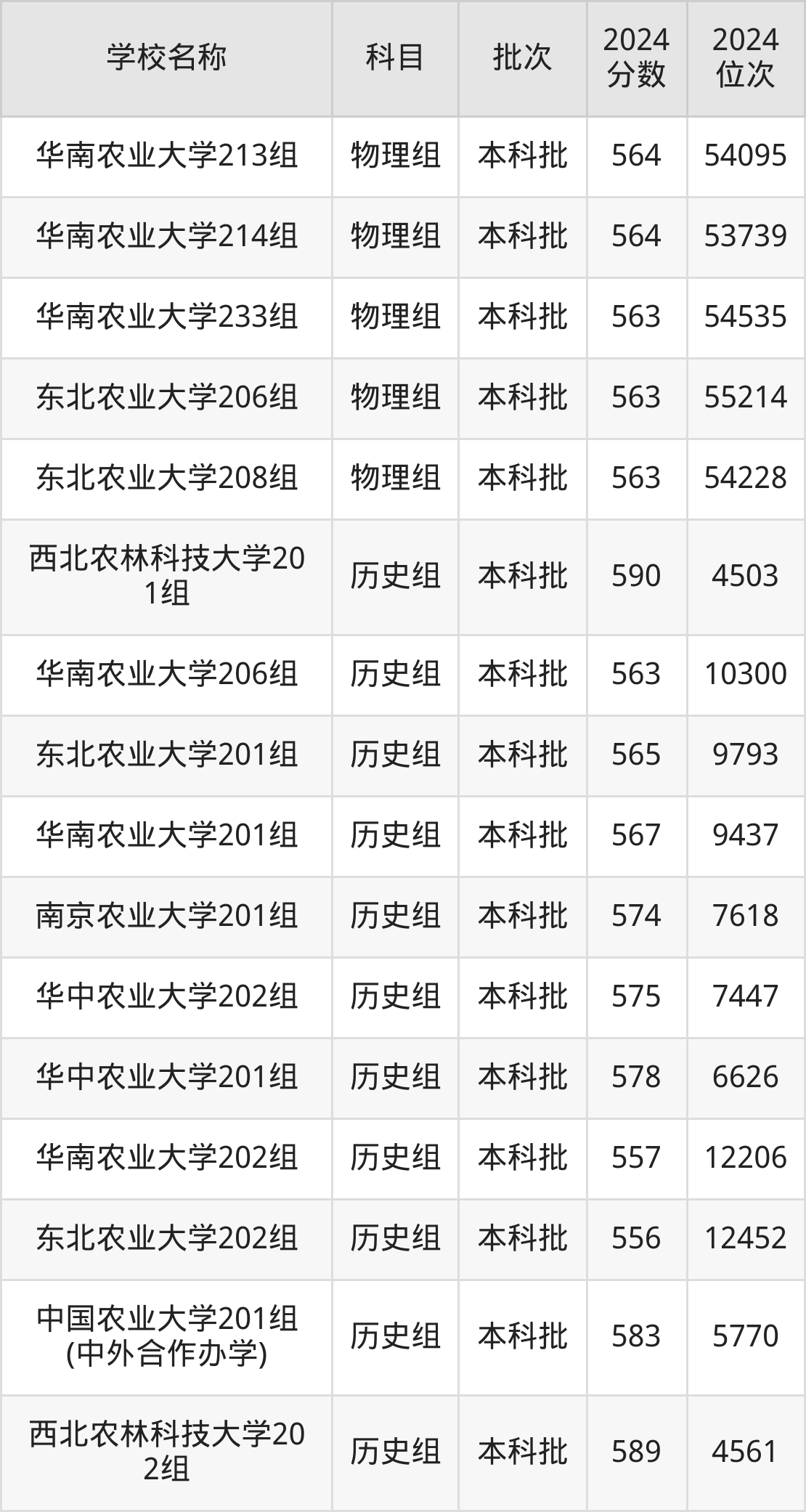 广东高考历史组共有6所农业大学在550到600分之间录取,包含西北农林科技大学、中国农业大学、华中农业大学、南京农业大学、华南农业大学、东北农业大学。