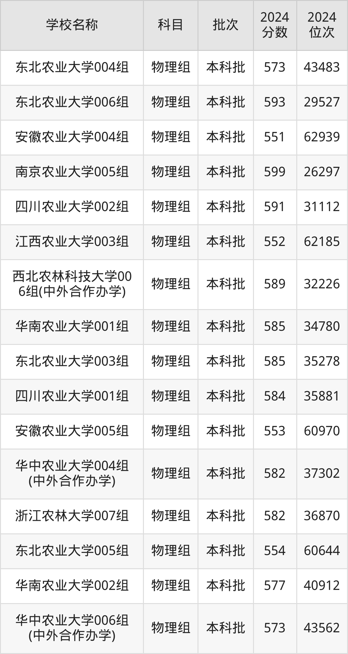 安徽高考物理组共有10所农业大学在550到600分之间录取,包含南京农业大学、华中农业大学、东北农业大学、四川农业大学、西北农林科技大学、华南农业大学、浙江农林大学、安徽农业大学、河南农业大学、江西农业大学。