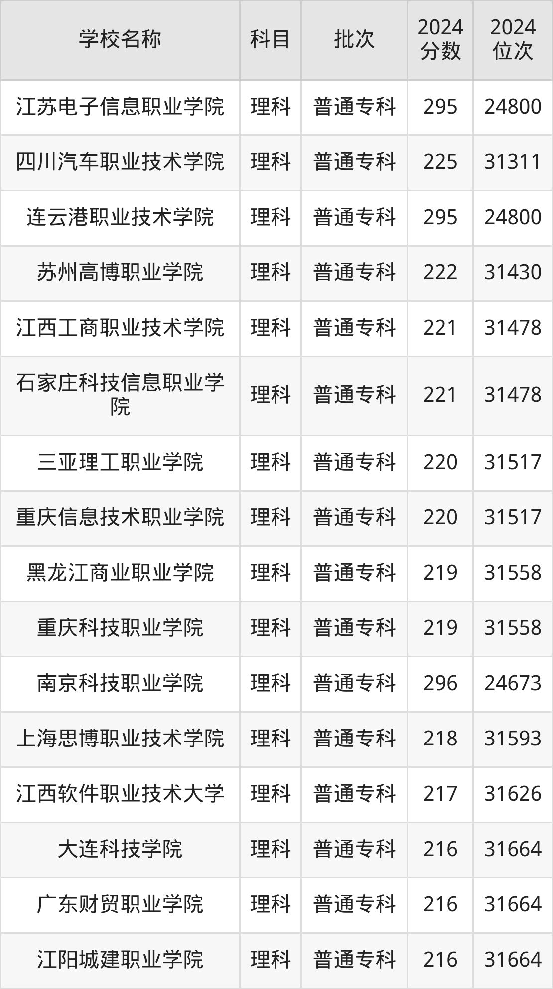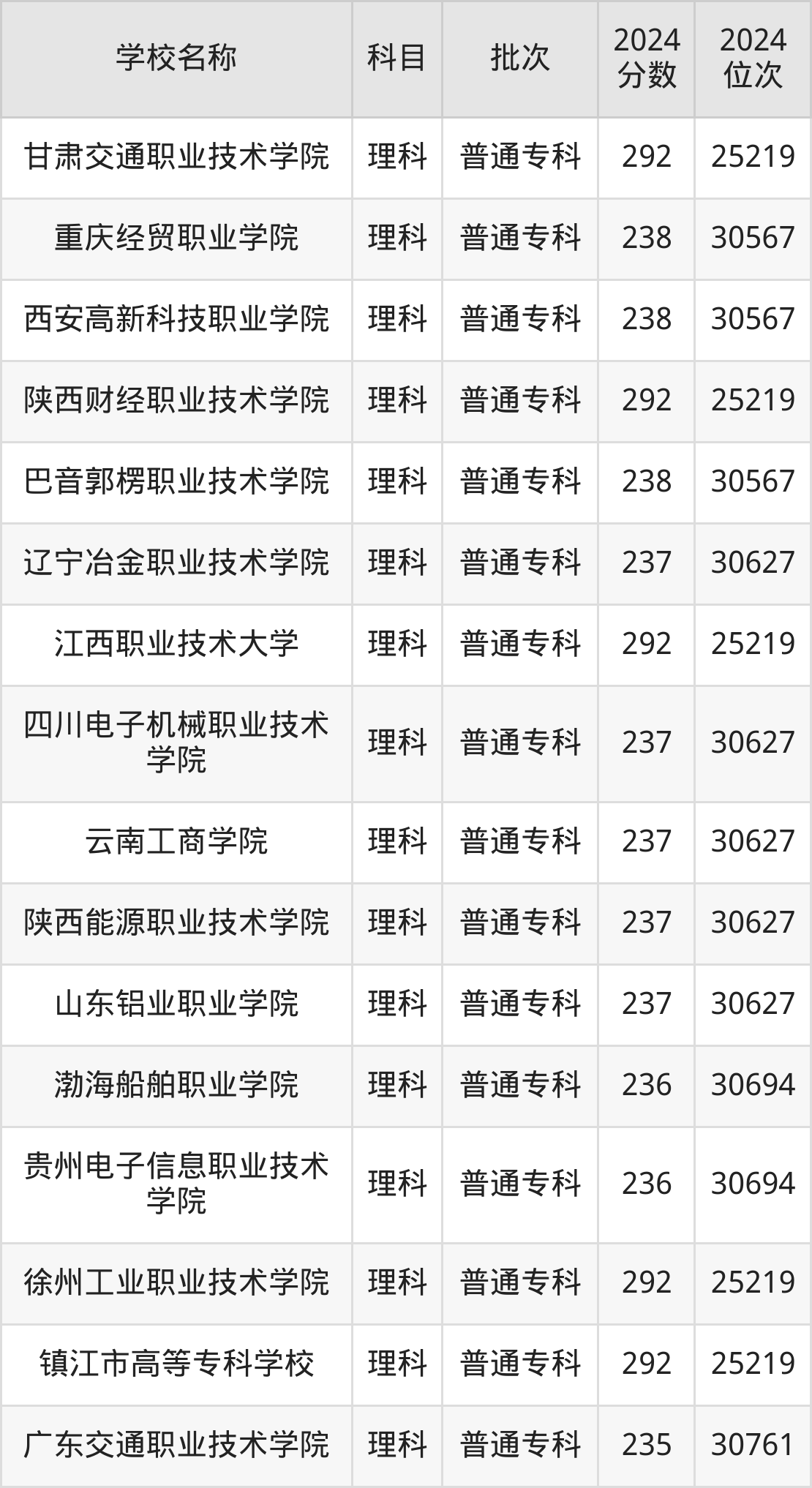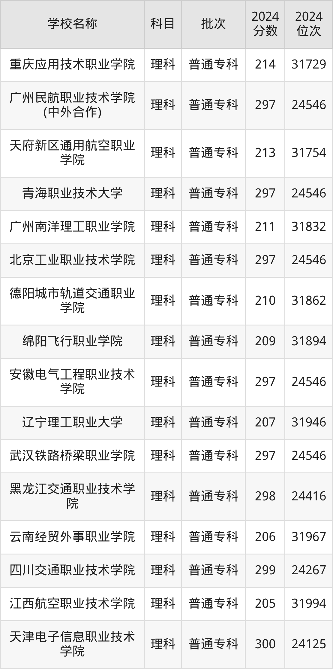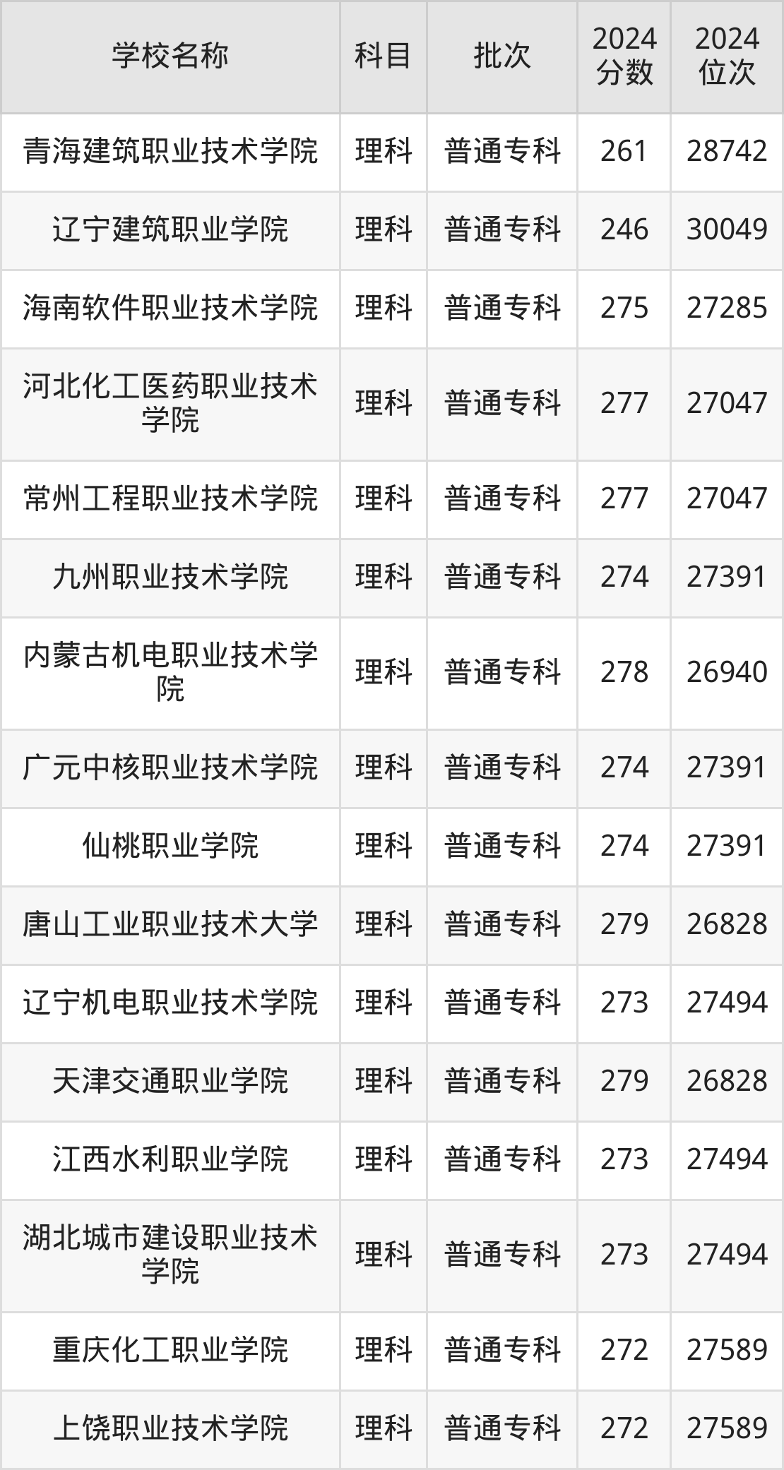 青海高考理科共有195所理科大学在200到300分之间录取,包含天津电子信息职业技术学院、四川交通职业技术学院、黑龙江交通职业技术学院、武汉铁路桥梁职业学院、安徽电气工程职业技术学院、北京工业职业技术学院、青海职业技术大学、广州民航职业技术学院(中外合作)、南京科技职业学院、连云港职业技术学院。