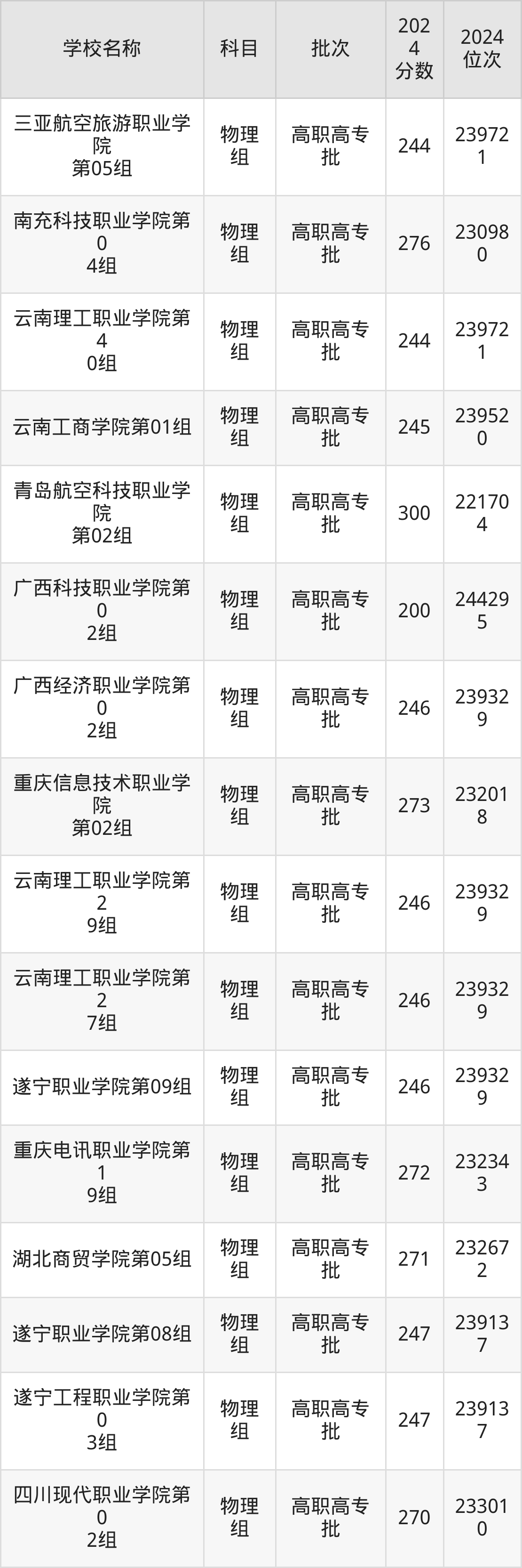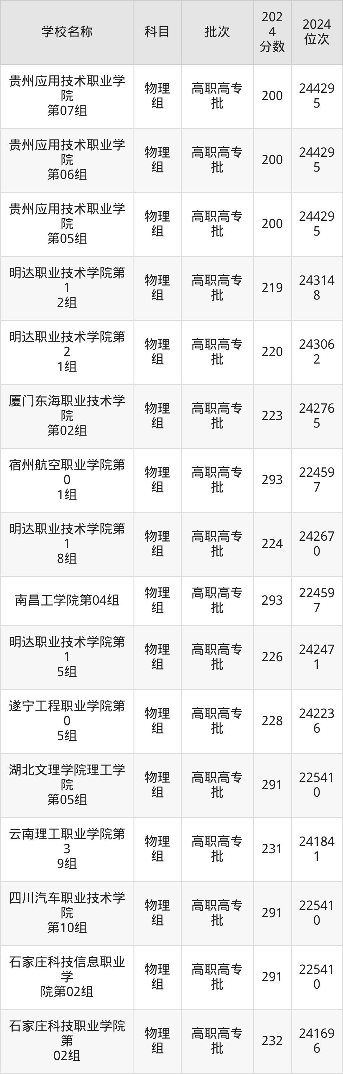 湖北高考物理组共有73所理科大学在200到300分之间录取,包含惠州经济职业技术学院、青岛航空科技职业学院、金肯职业技术学院、湖北开放职业学院、西安海棠职业学院、德阳城市轨道交通职业学院、上海民远职业技术学院、重庆电信职业学院、宿州航空职业学院、南昌工学院。