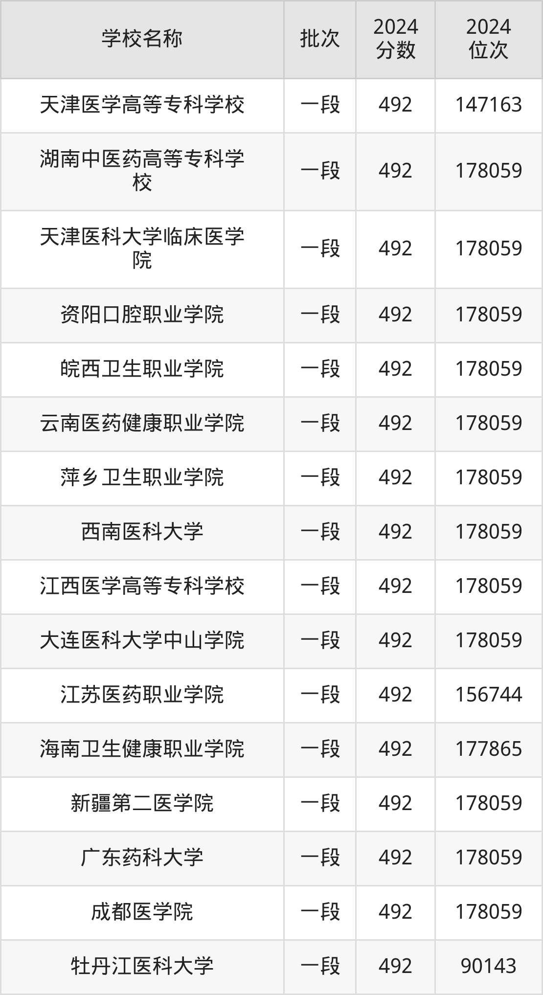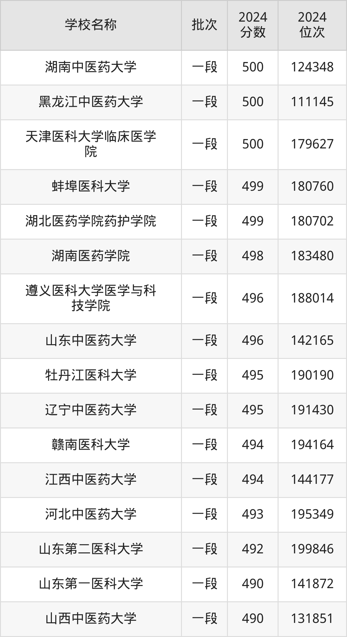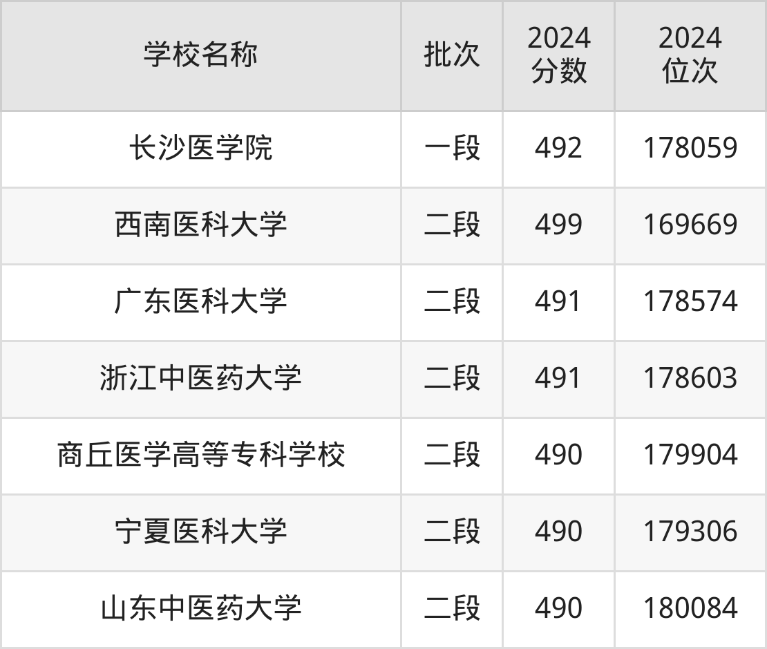 一、490到500分的医科大学最低分一览表