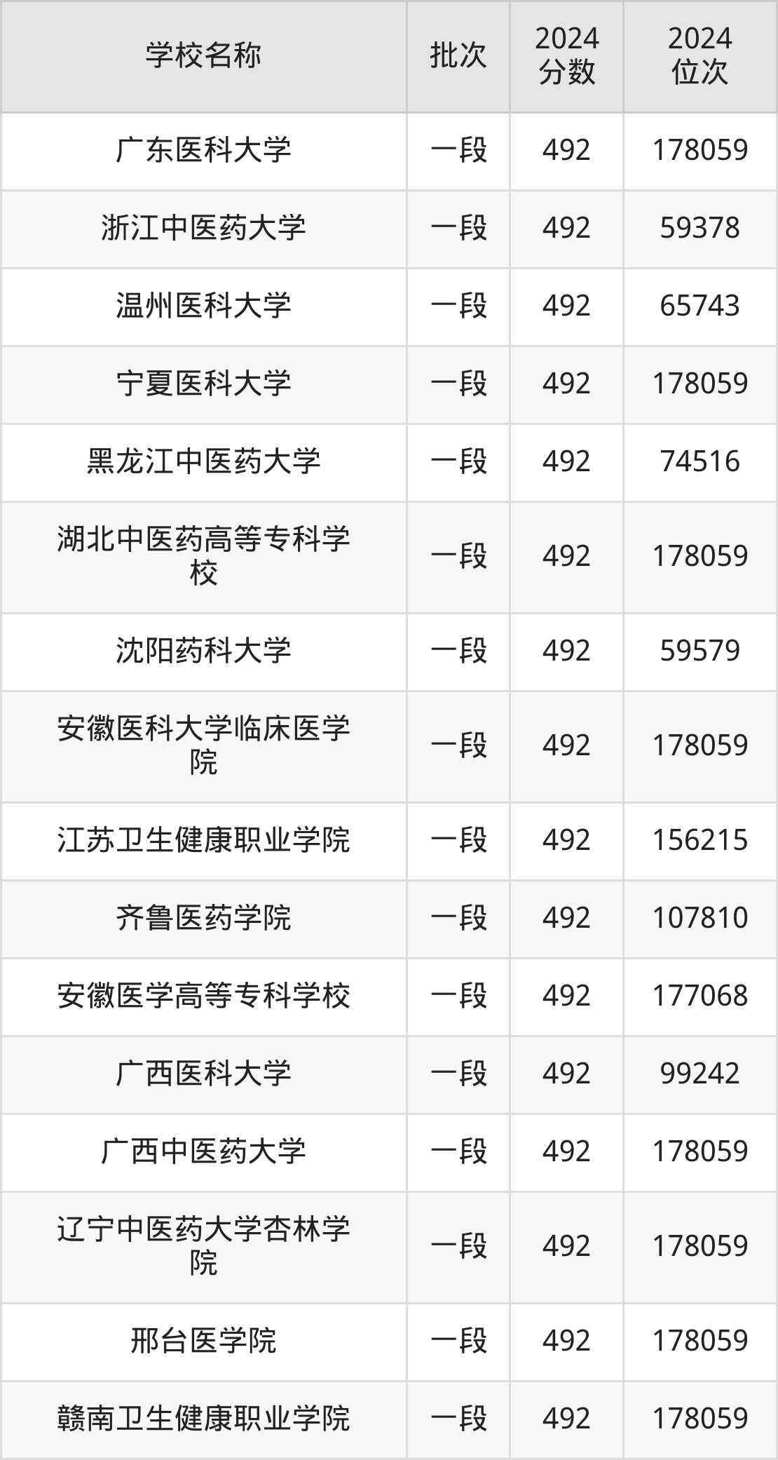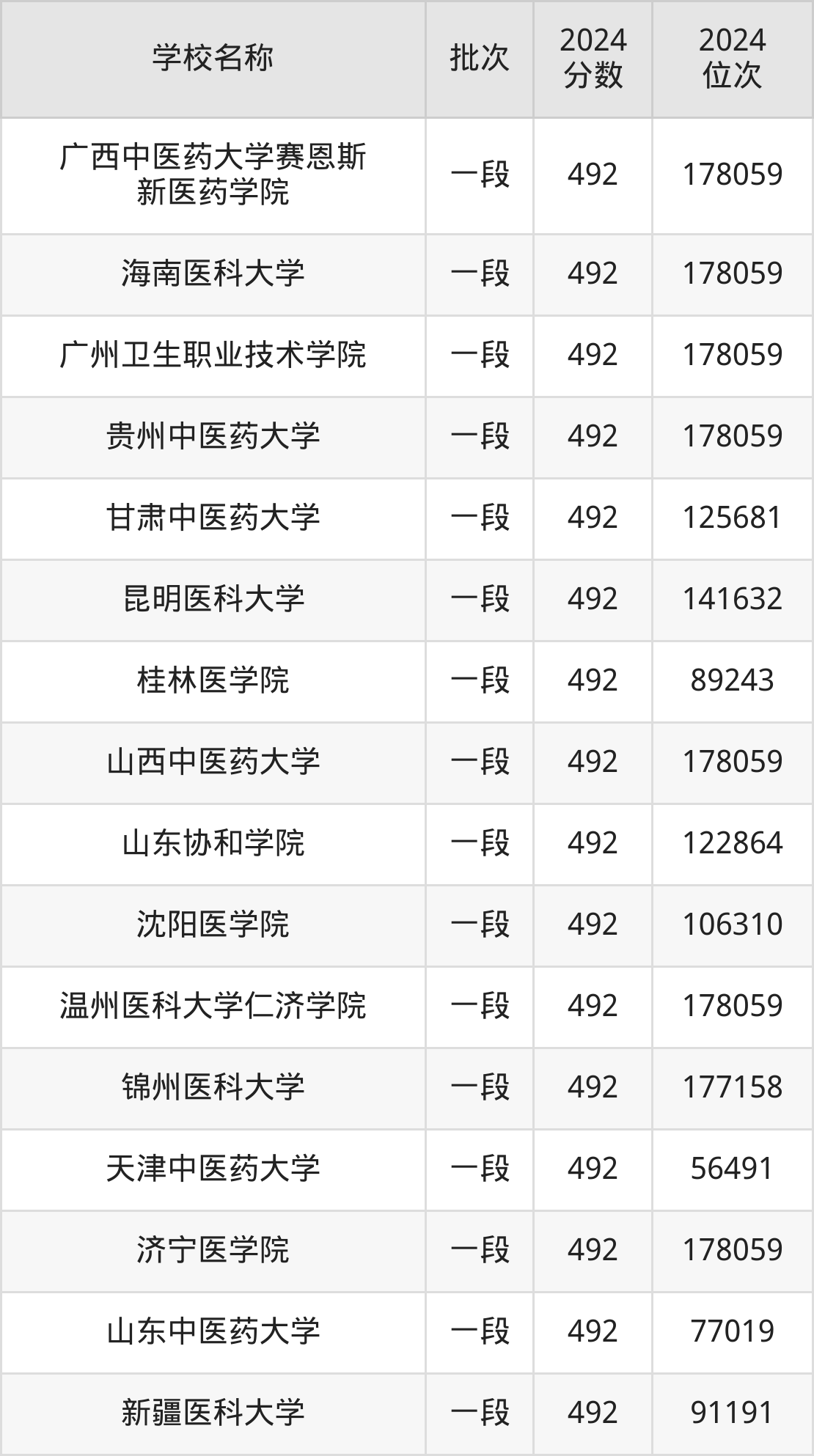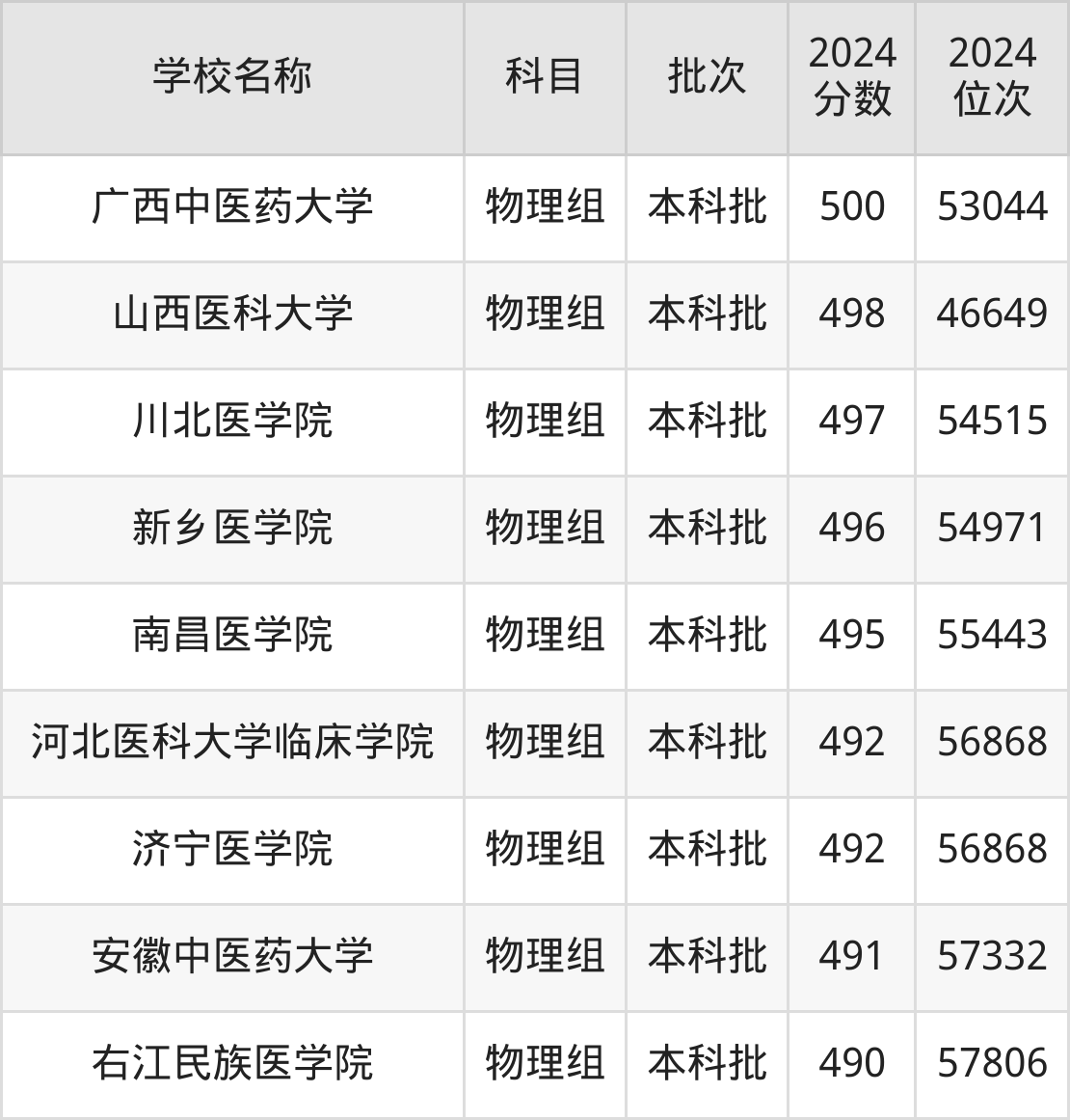 一、490到500分的医科大学最低分一览表