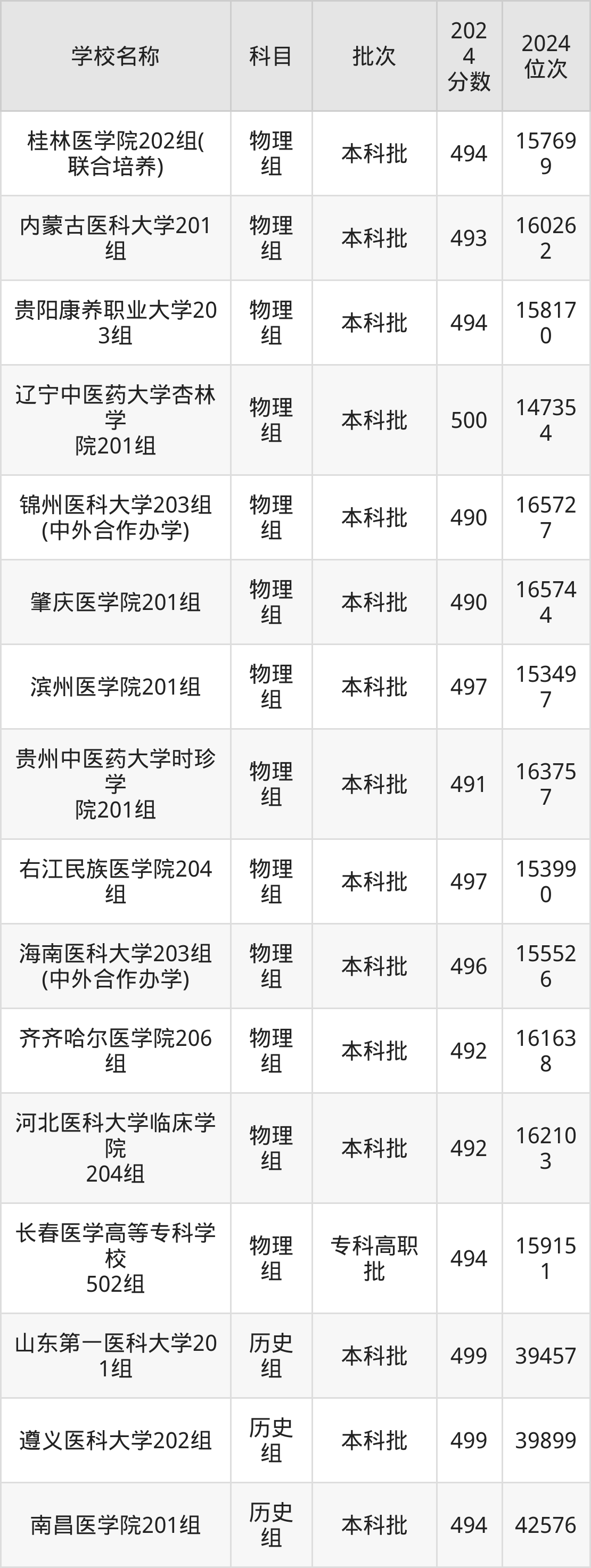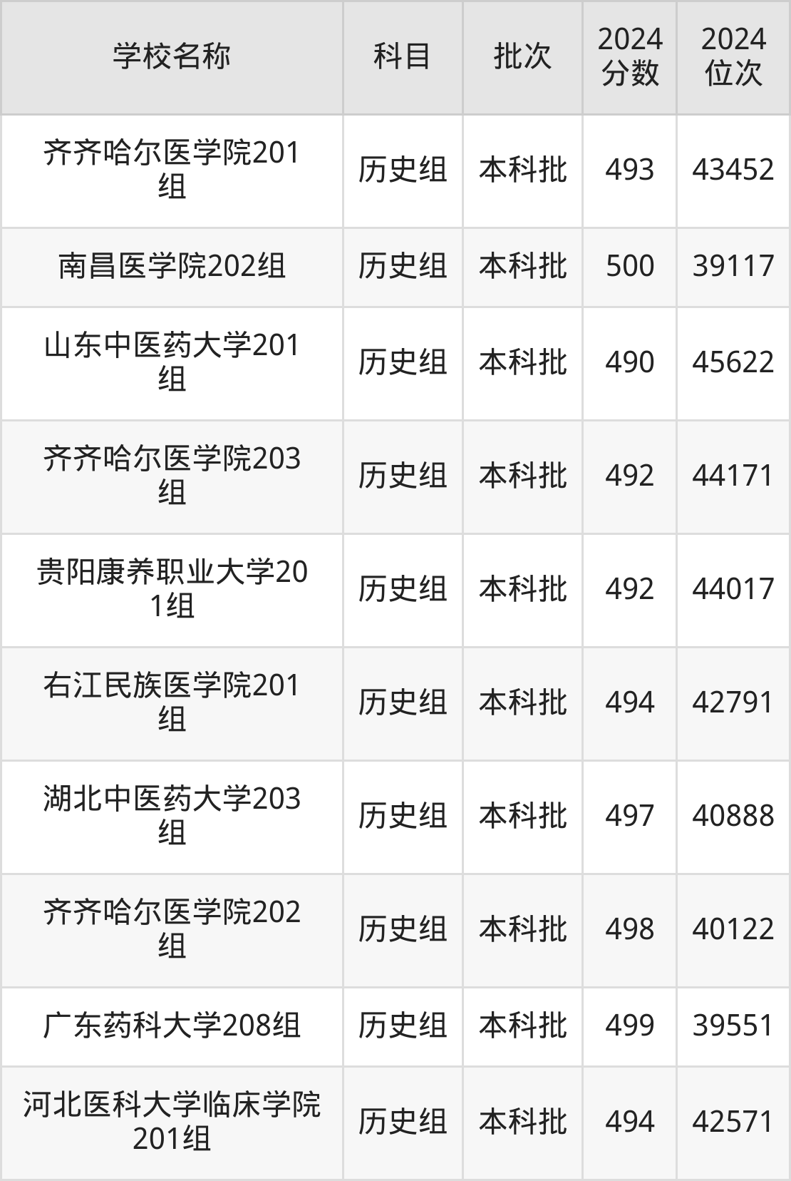广东高考历史组共有10所医科大学在490到500分之间录取,包含南昌医学院、山东第一医科大学、遵义医科大学、广东药科大学、齐齐哈尔医学院、湖北中医药大学、右江民族医学院、河北医科大学临床学院、贵阳康养职业大学、山东中医药大学。