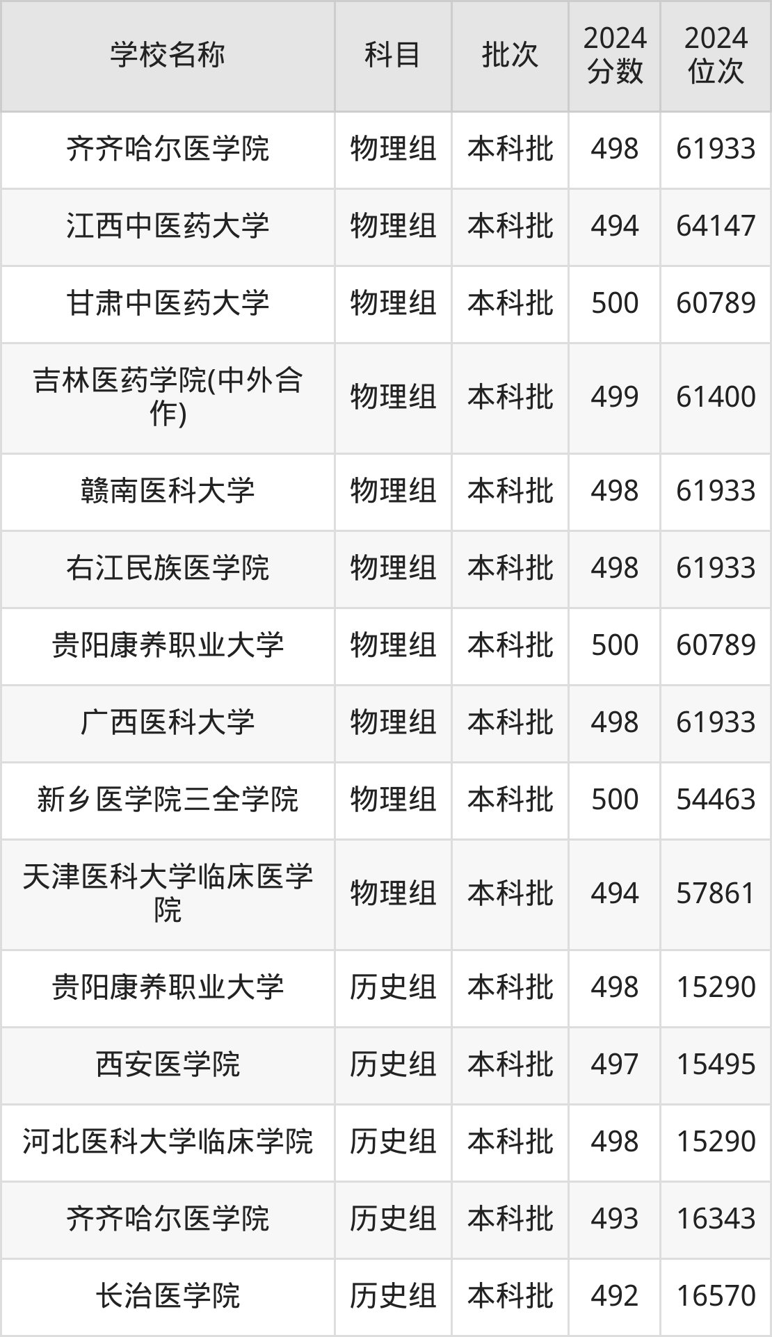 重庆高考历史组共有5所医科大学在490到500分之间录取,包含贵阳康养职业大学、河北医科大学临床学院、西安医学院、齐齐哈尔医学院、长治医学院。