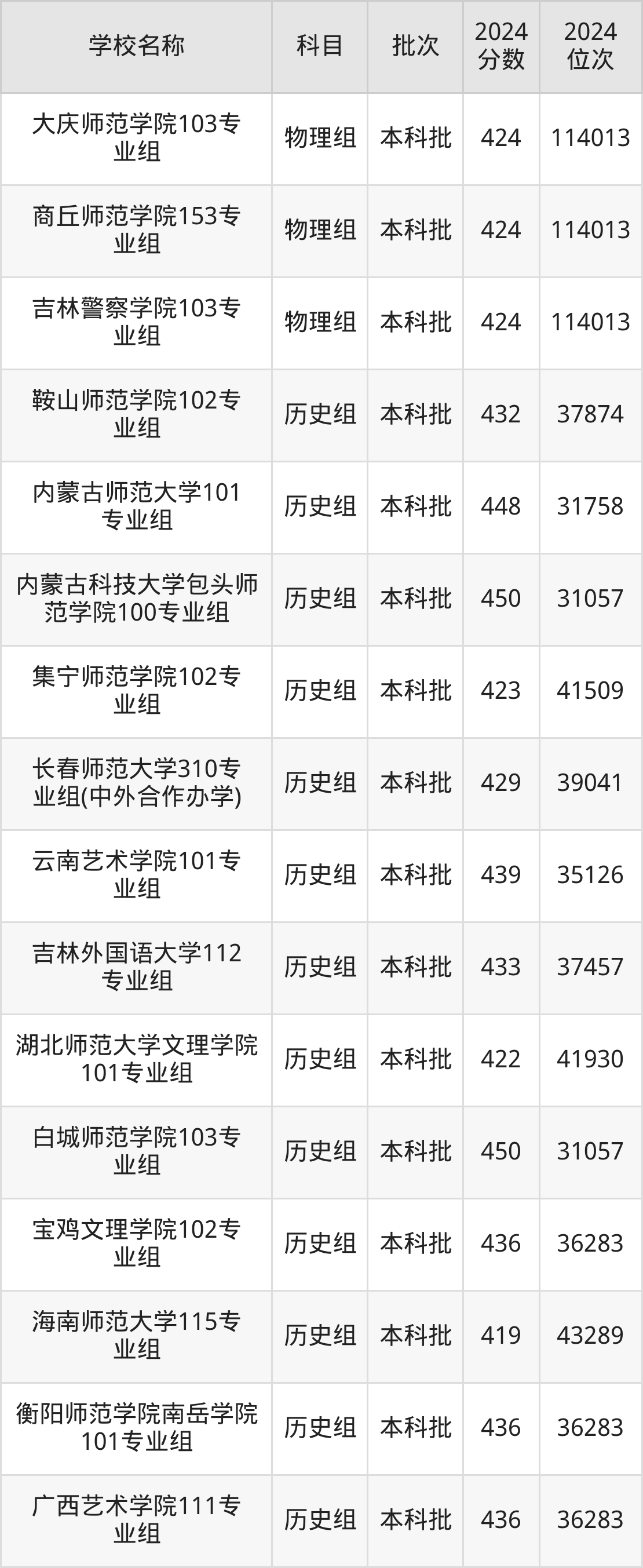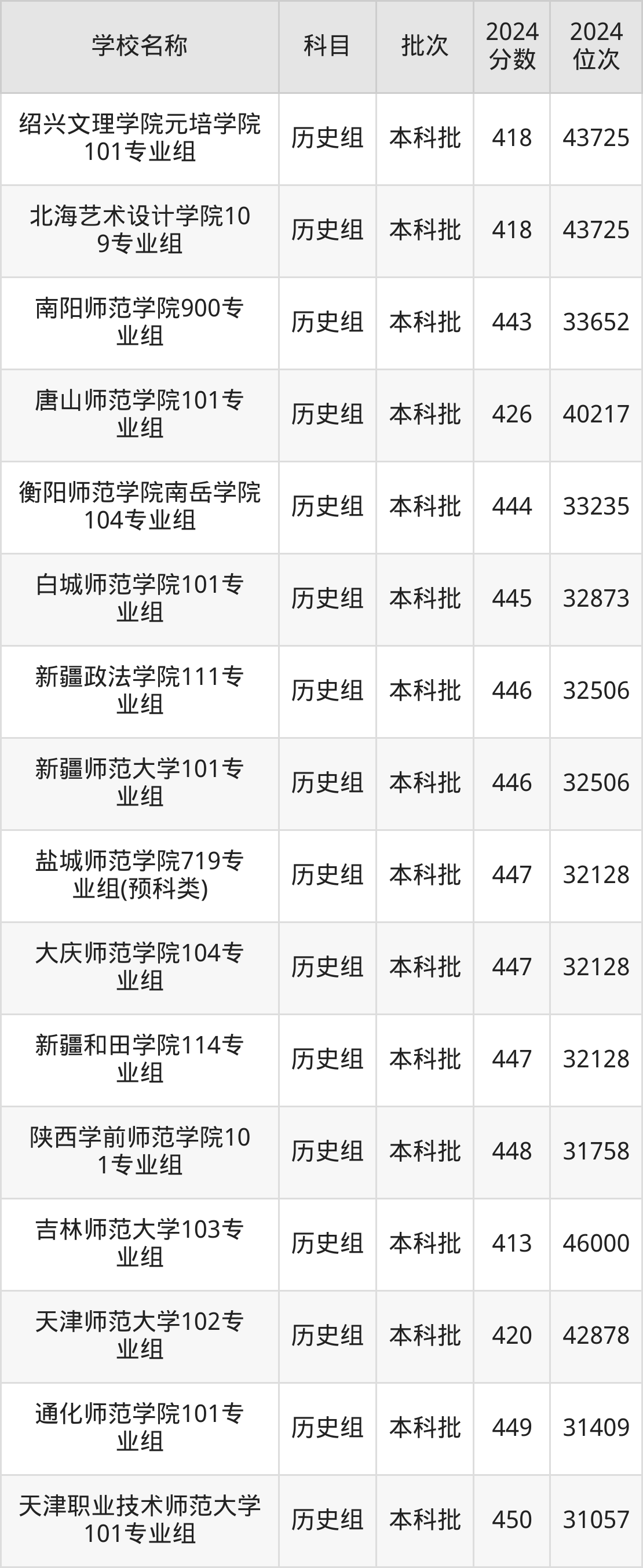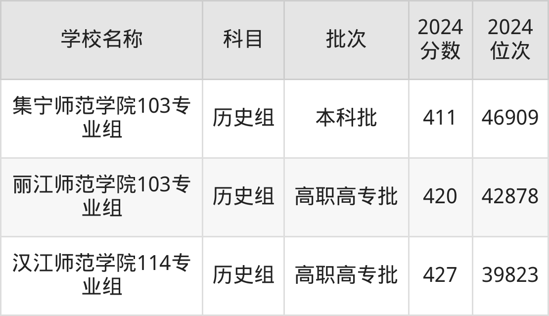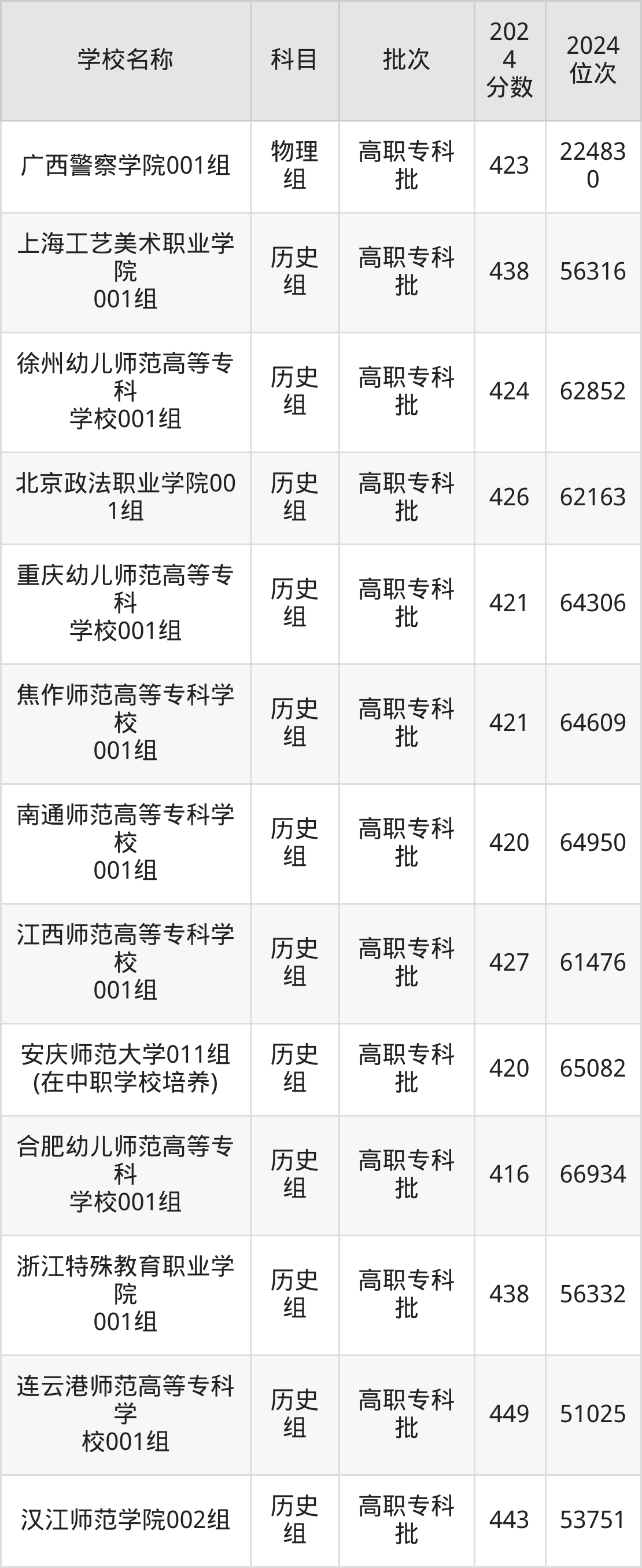 安徽高考历史组共有12所文科大学在410到450分之间录取,包含连云港师范高等专科学校、汉江师范学院、上海工艺美术职业学院、浙江特殊教育职业学院、江西师范高等专科学校、北京政法职业学院、徐州幼儿师范高等专科学校、重庆幼儿师范高等专科学校、焦作师范高等专科学校、南通师范高等专科学校。
