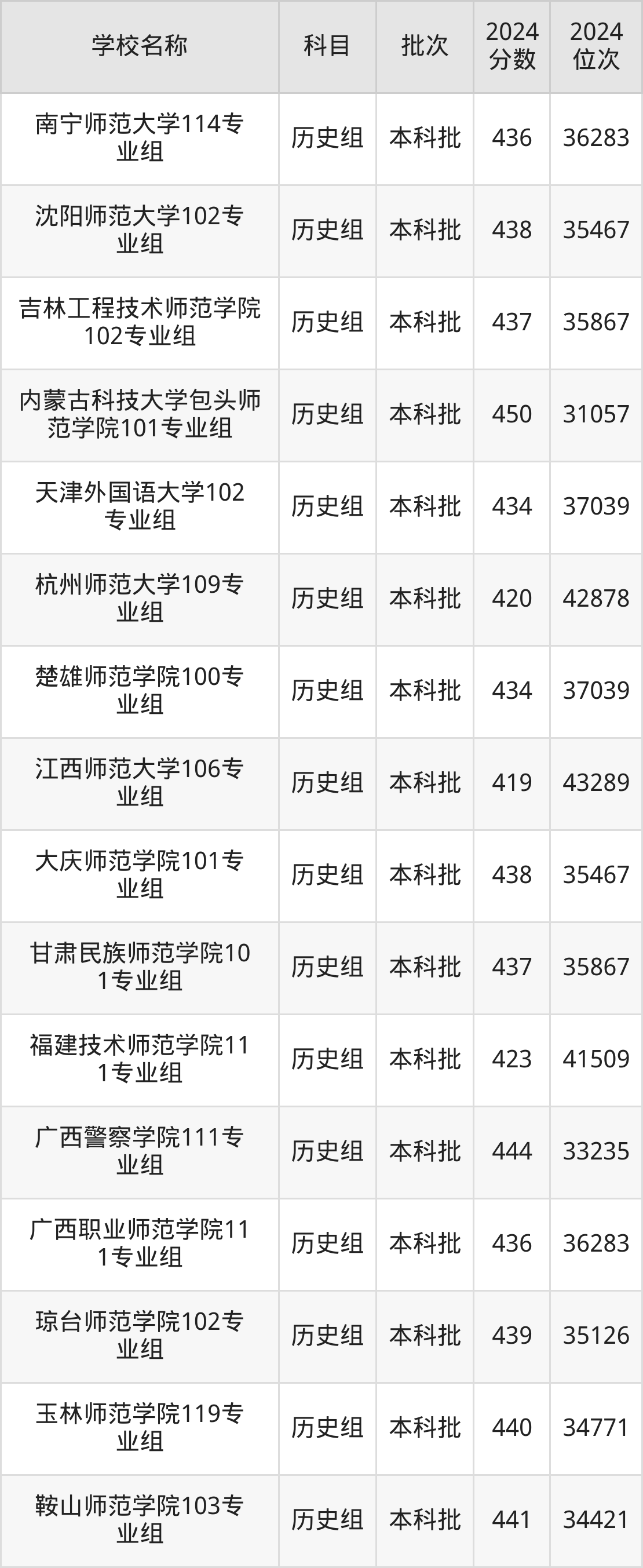 广西高考历史组共有42所文科大学在410到450分之间录取,包含白城师范学院、内蒙古科技大学包头师范学院、天津职业技术师范大学、通化师范学院、内蒙古师范大学、陕西学前师范学院、新疆和田学院、大庆师范学院、盐城师范学院、新疆师范大学。