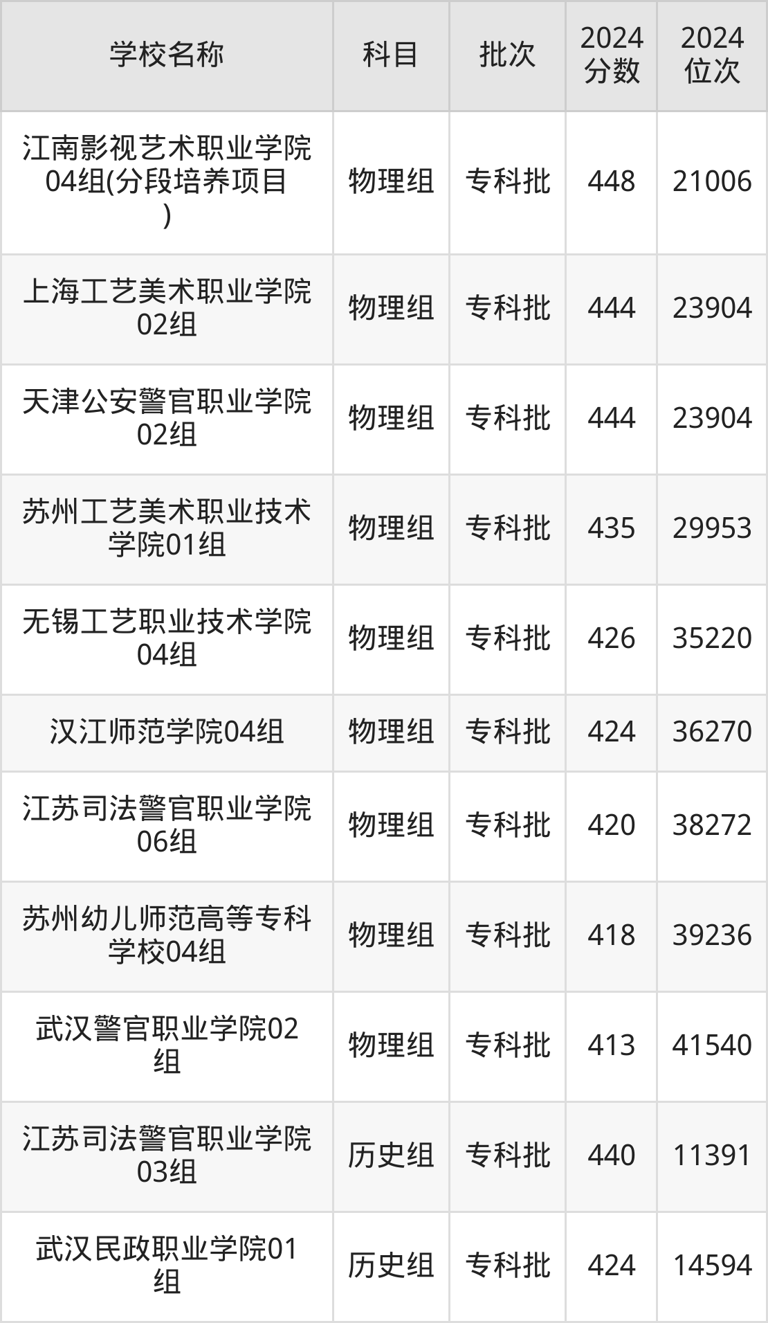 江苏高考历史组共有2所文科大学在410到450分之间录取,包含江苏司法警官职业学院、武汉民政职业学院。