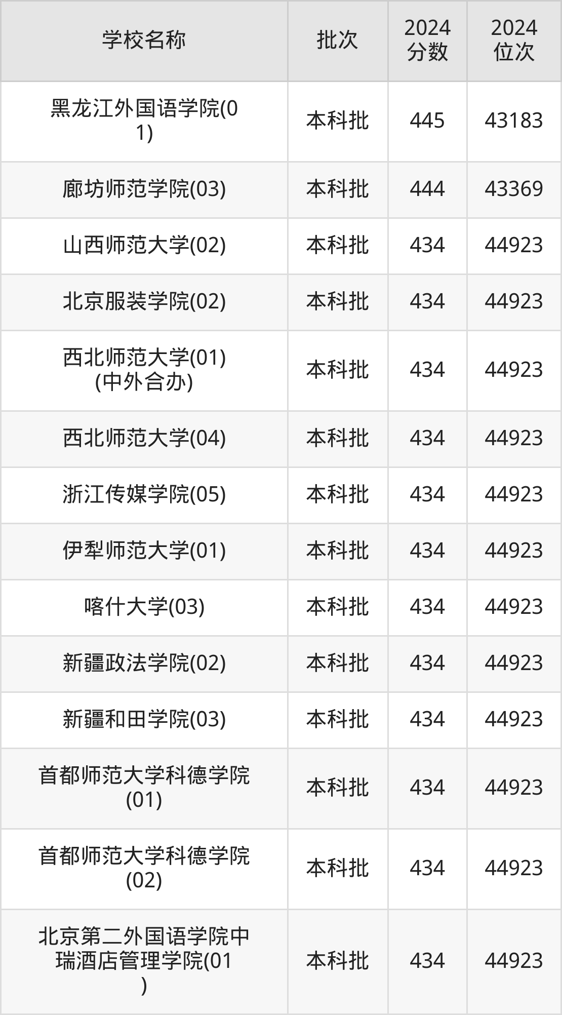 北京高考共有12所文科大学在410到450分之间录取,包含黑龙江外国语学院、廊坊师范学院、山西师范大学、北京服装学院、西北师范大学、浙江传媒学院、伊犁师范大学、喀什大学、新疆政法学院、新疆和田学院。