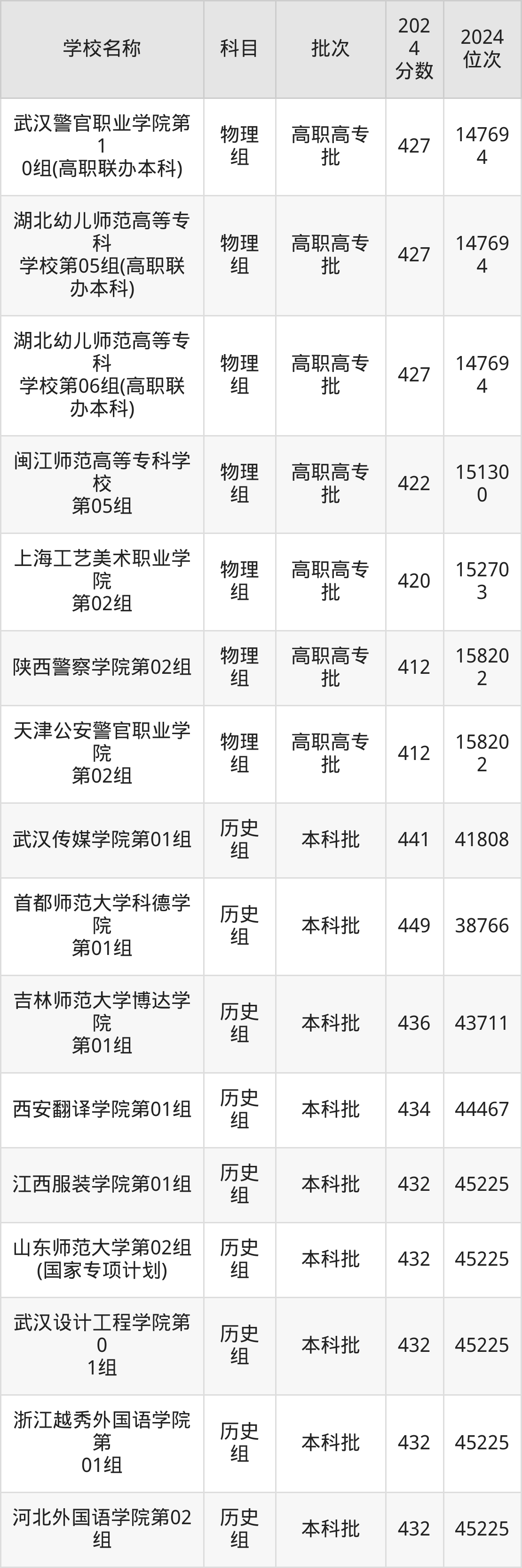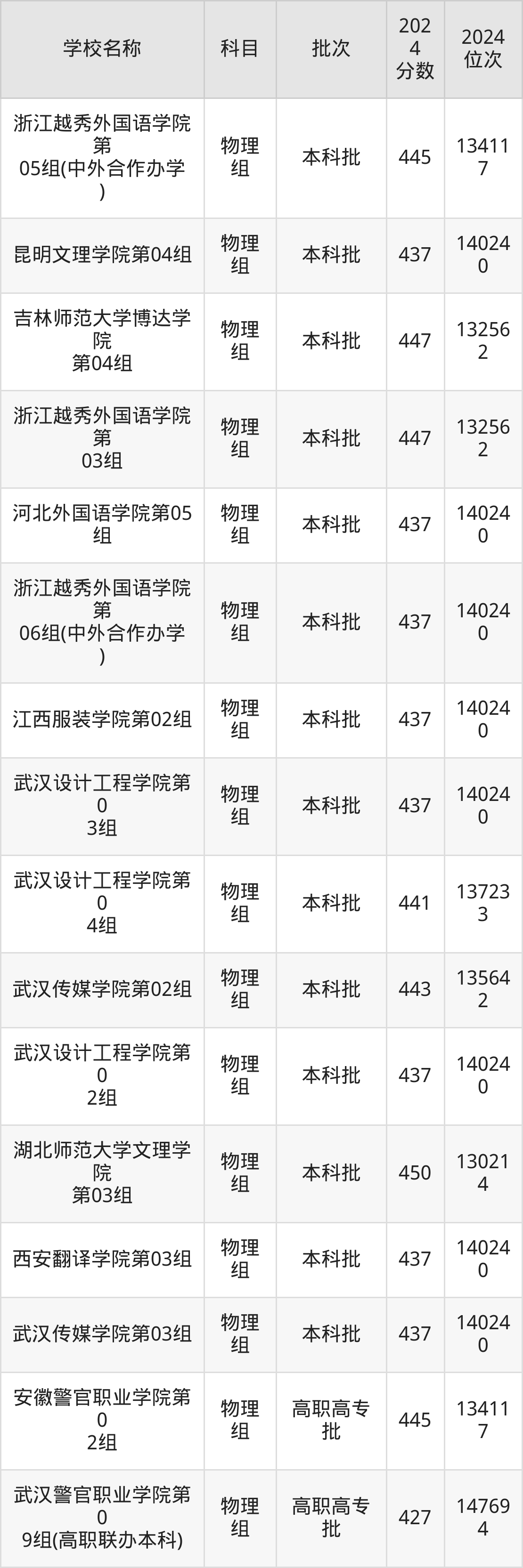 湖北高考物理组共有16所文科大学在410到450分之间录取,包含湖北师范大学文理学院、吉林师范大学博达学院、浙江越秀外国语学院、安徽警官职业学院、武汉传媒学院、武汉设计工程学院、昆明文理学院、西安翻译学院、河北外国语学院、江西服装学院。