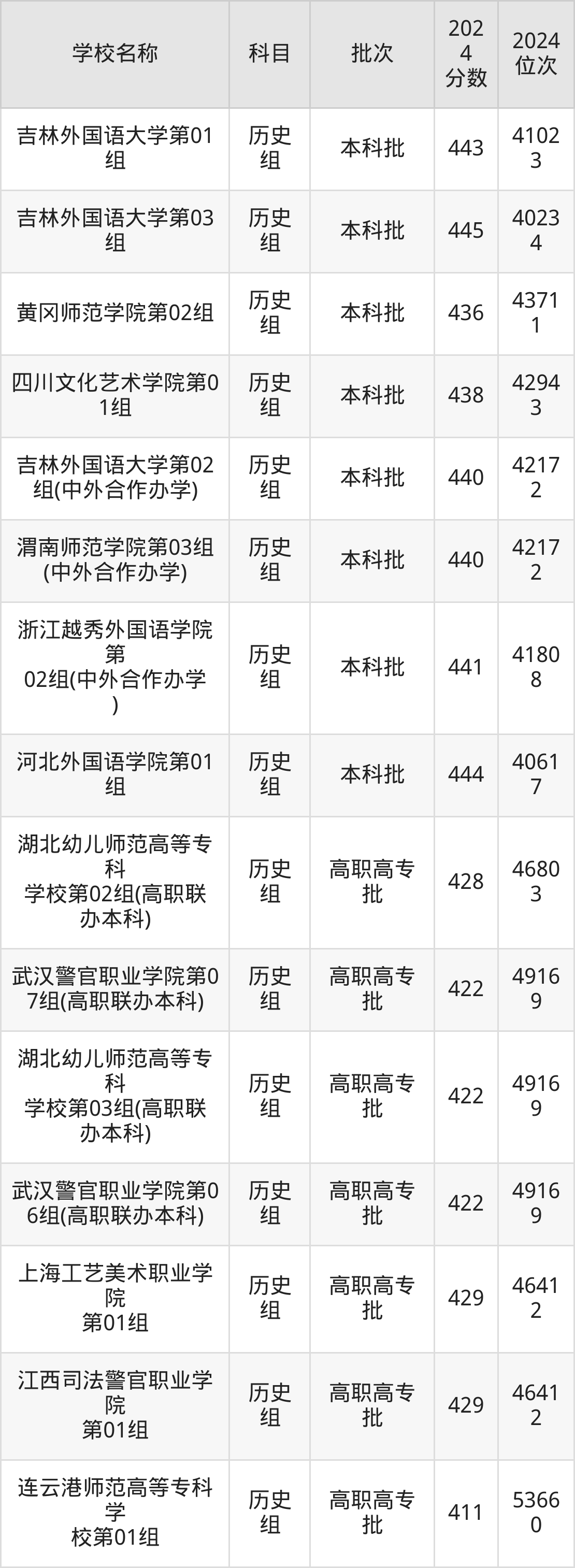 湖北高考历史组共有18所文科大学在410到450分之间录取,包含首都师范大学科德学院、吉林外国语大学、河北外国语学院、武汉传媒学院、浙江越秀外国语学院、渭南师范学院、四川文化艺术学院、黄冈师范学院、吉林师范大学博达学院、西安翻译学院。