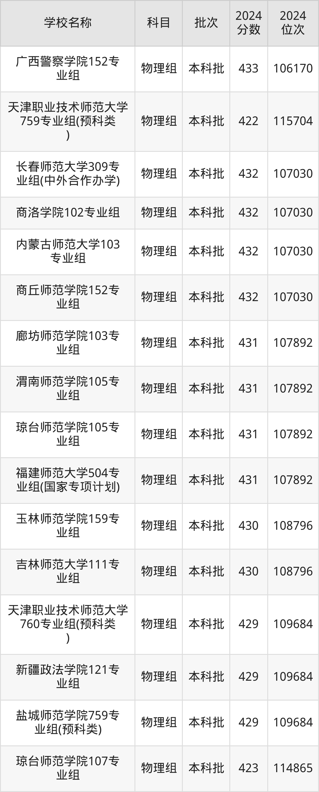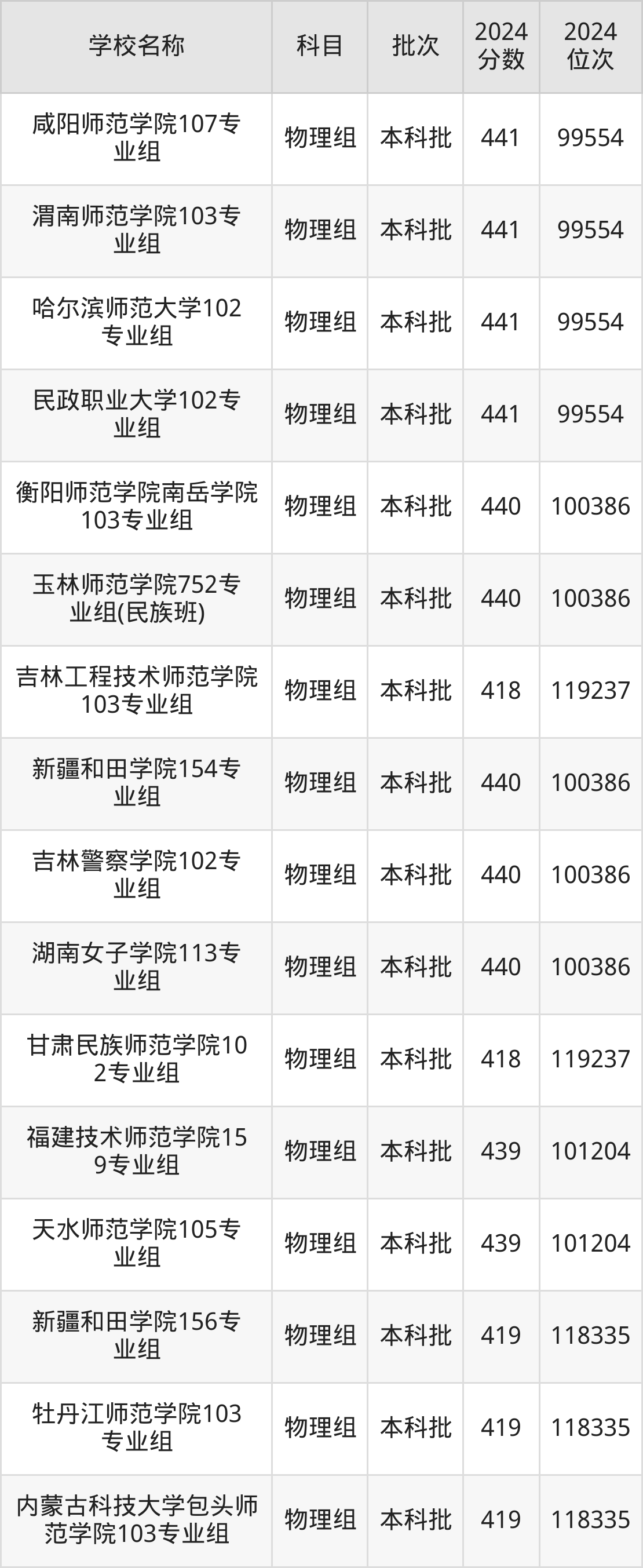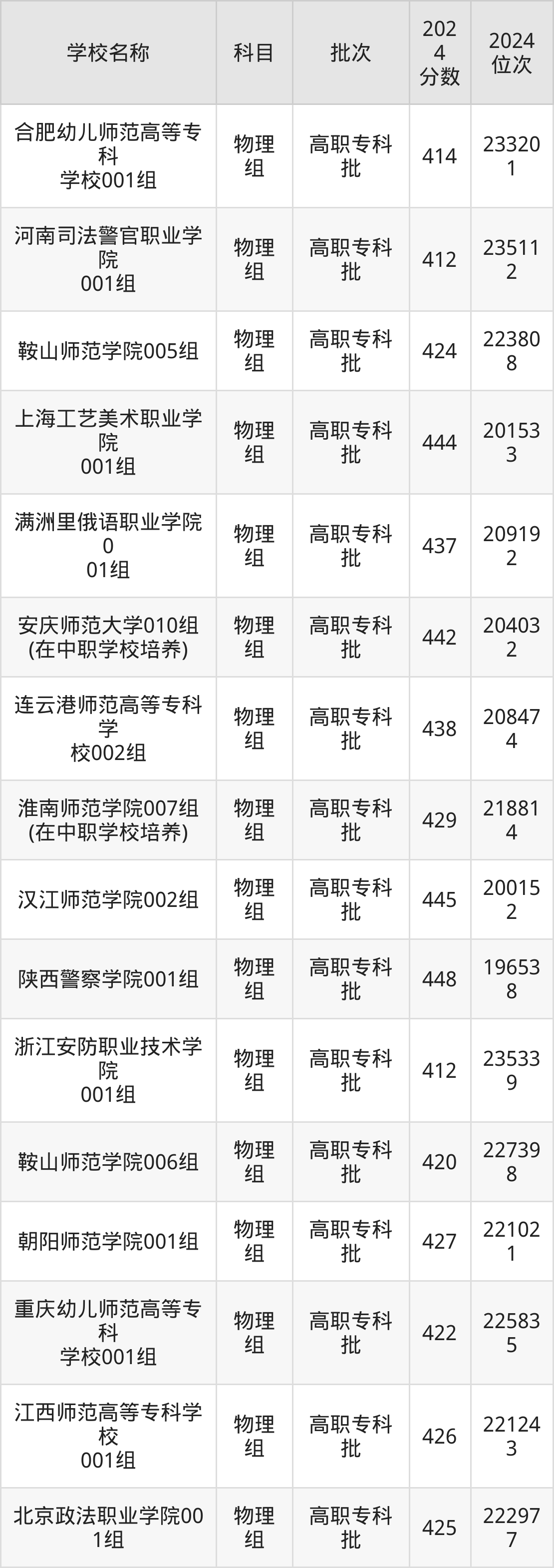 安徽高考物理组共有16所文科大学在410到450分之间录取,包含陕西警察学院、汉江师范学院、上海工艺美术职业学院、安庆师范大学、连云港师范高等专科学校、满洲里俄语职业学院、淮南师范学院、朝阳师范学院、江西师范高等专科学校、北京政法职业学院。
