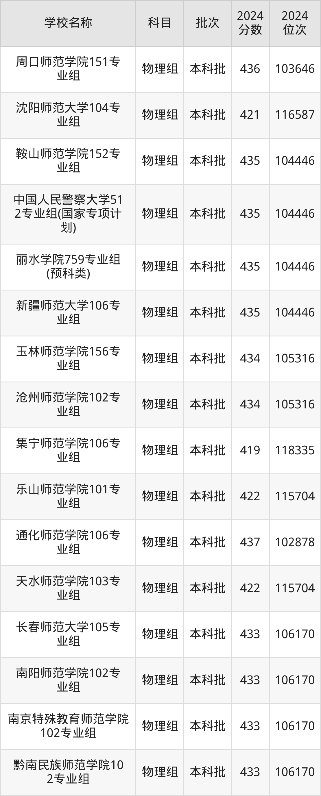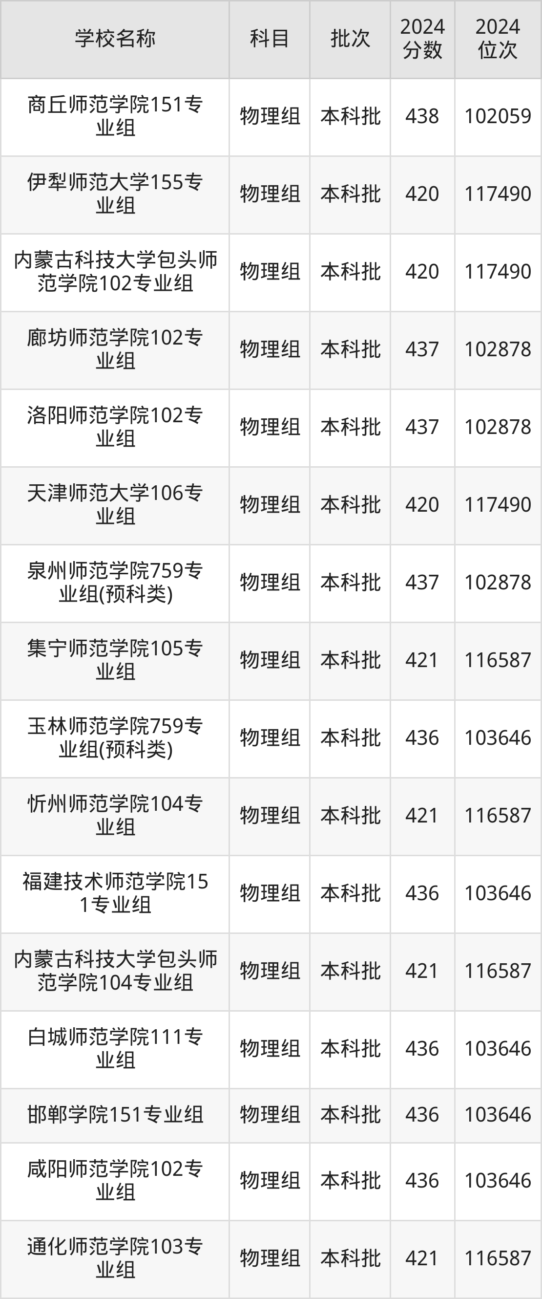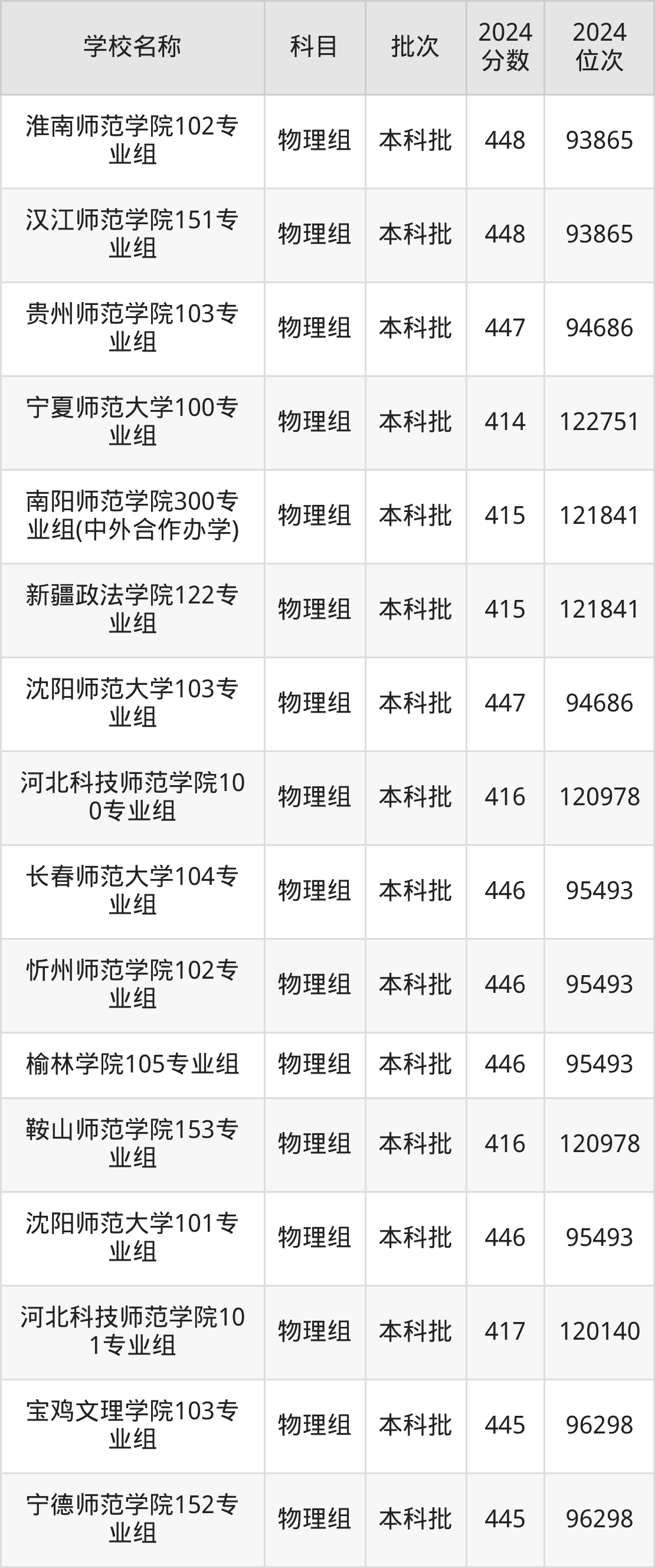 安徽高考物理组共有16所文科大学在410到450分之间录取,包含陕西警察学院、汉江师范学院、上海工艺美术职业学院、安庆师范大学、连云港师范高等专科学校、满洲里俄语职业学院、淮南师范学院、朝阳师范学院、江西师范高等专科学校、北京政法职业学院。