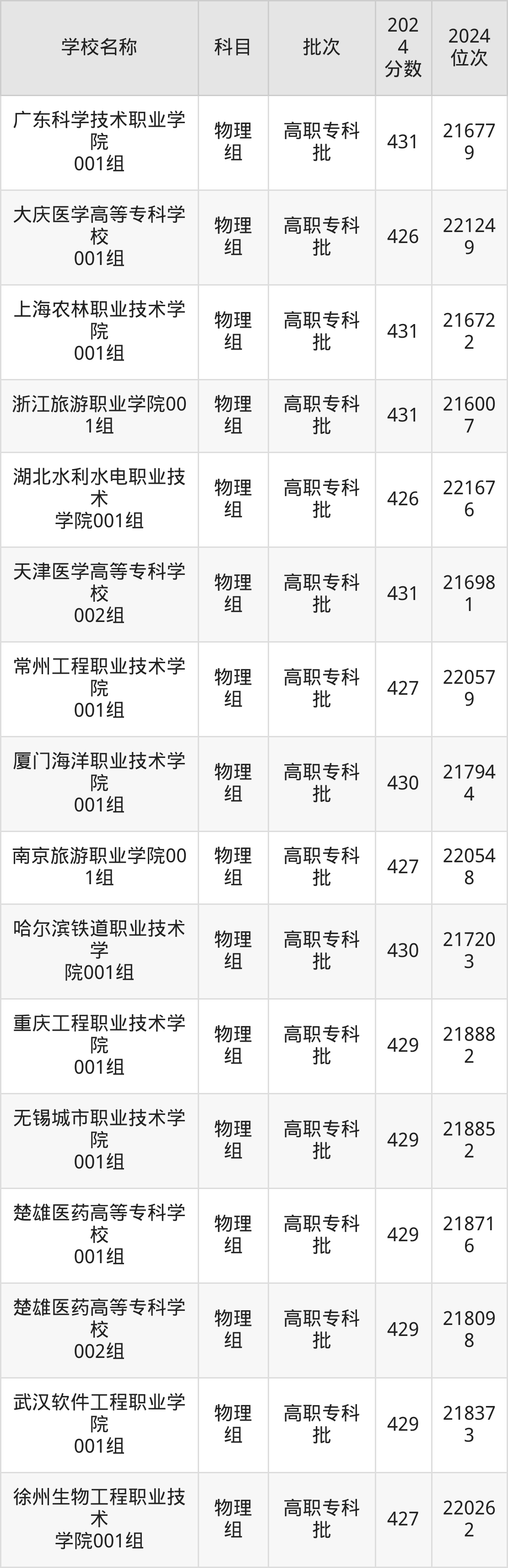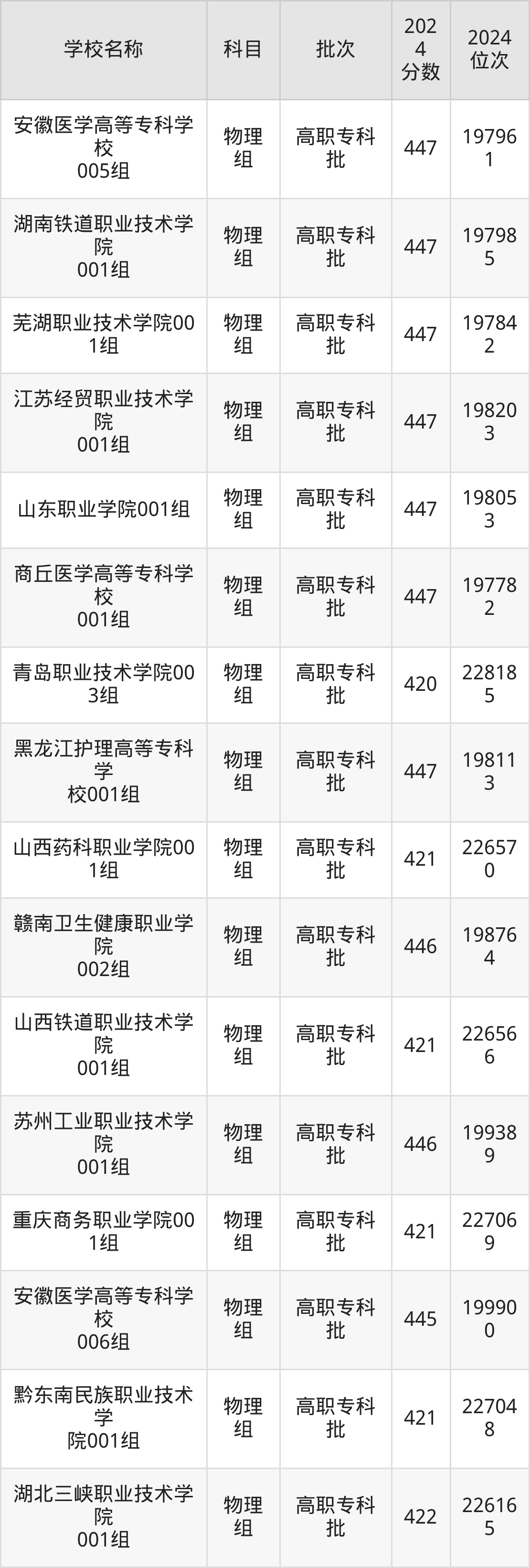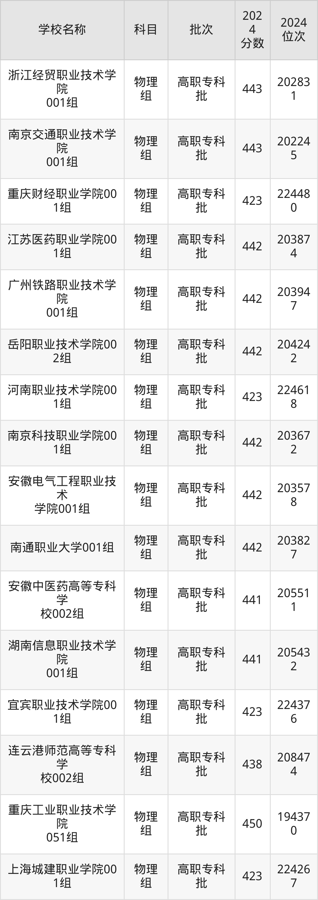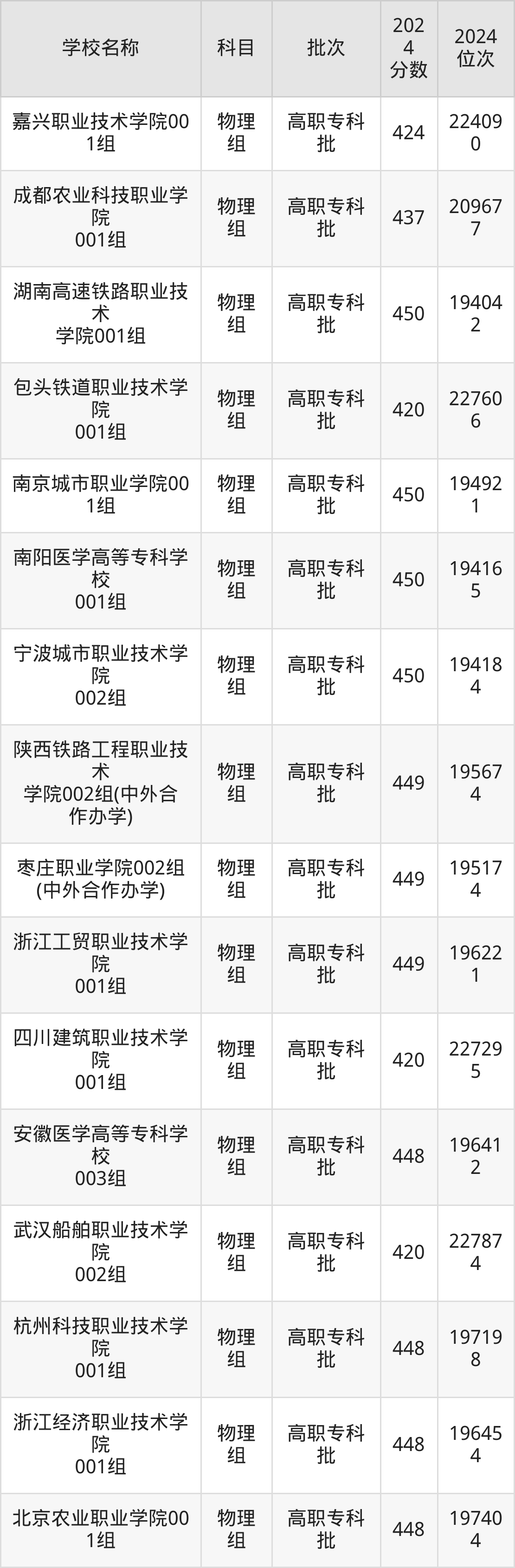 安徽高考物理组共有160所公办专科学校在420到450分之间录取,包含重庆工业职业技术学院、湖南高速铁路职业技术学院、南京城市职业学院、南阳医学高等专科学校、宁波城市职业技术学院、陕西铁路工程职业技术学院、枣庄职业学院、浙江工贸职业技术学院、安徽医学高等专科学校、杭州科技职业技术学院。
