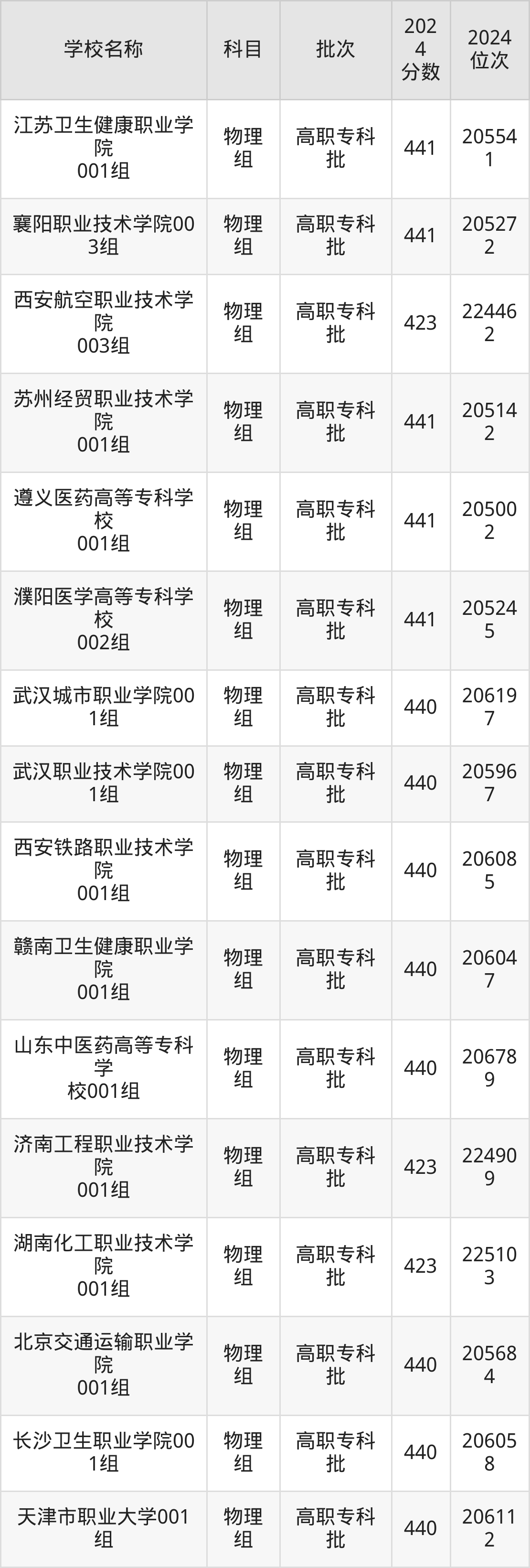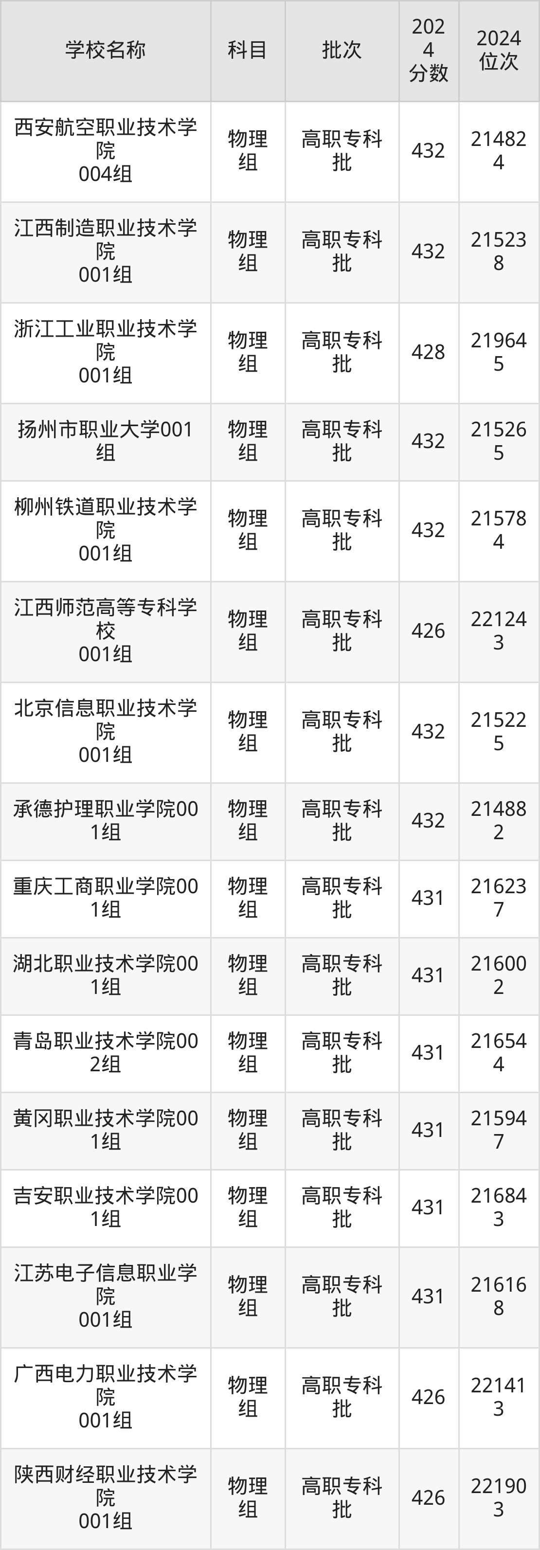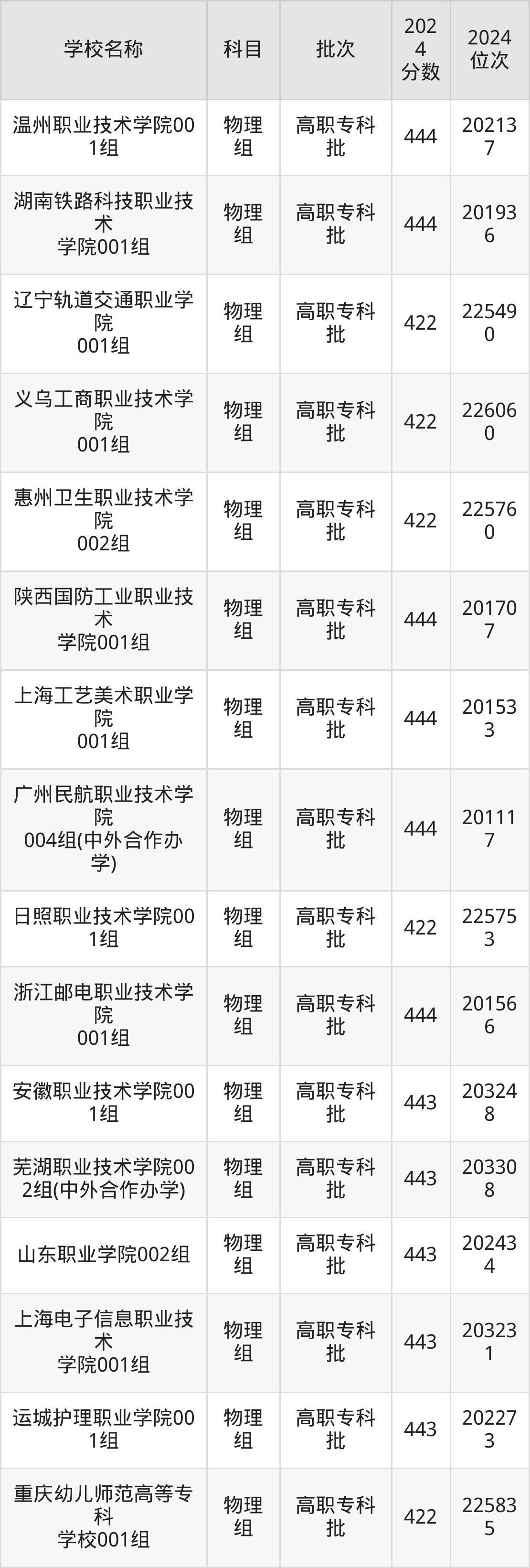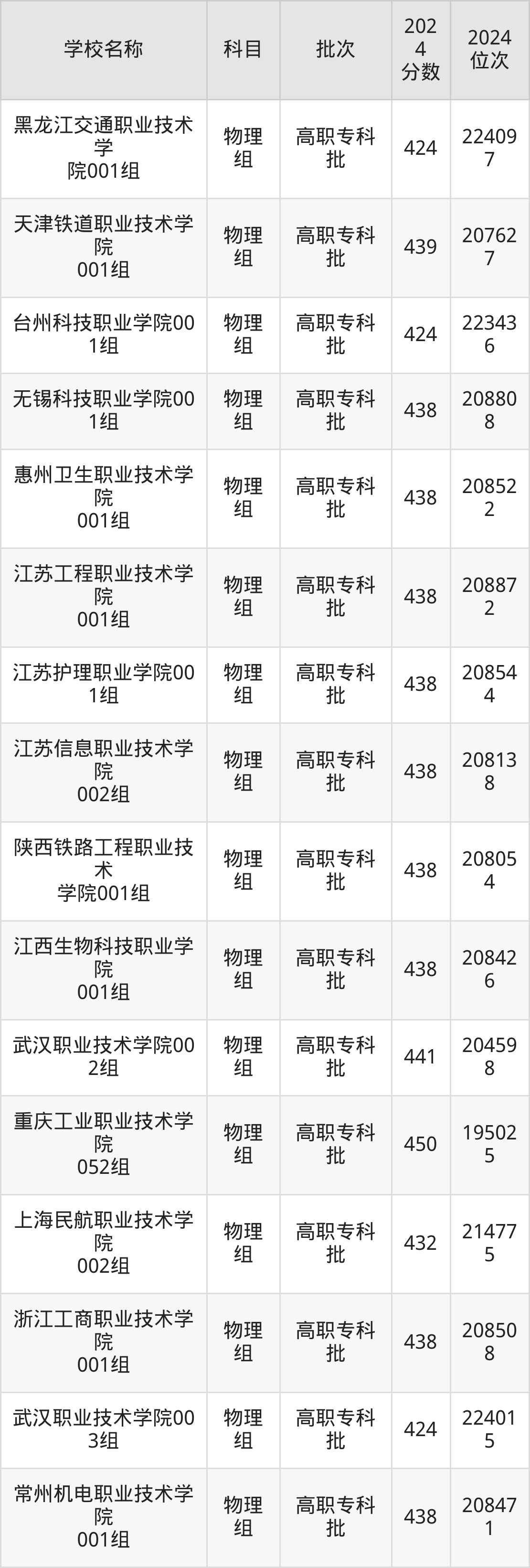 安徽高考物理组共有160所公办专科学校在420到450分之间录取,包含重庆工业职业技术学院、湖南高速铁路职业技术学院、南京城市职业学院、南阳医学高等专科学校、宁波城市职业技术学院、陕西铁路工程职业技术学院、枣庄职业学院、浙江工贸职业技术学院、安徽医学高等专科学校、杭州科技职业技术学院。