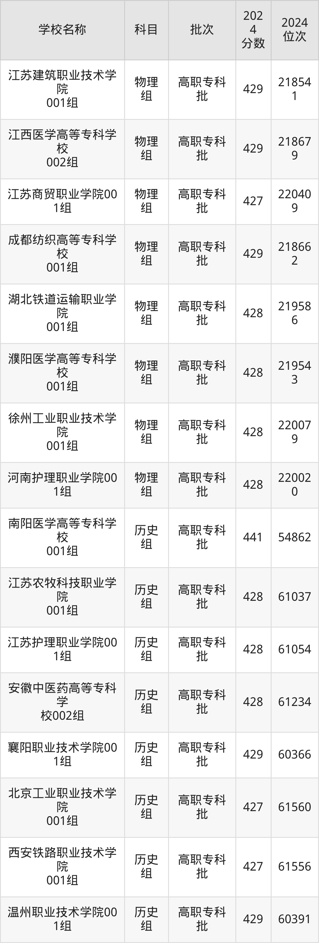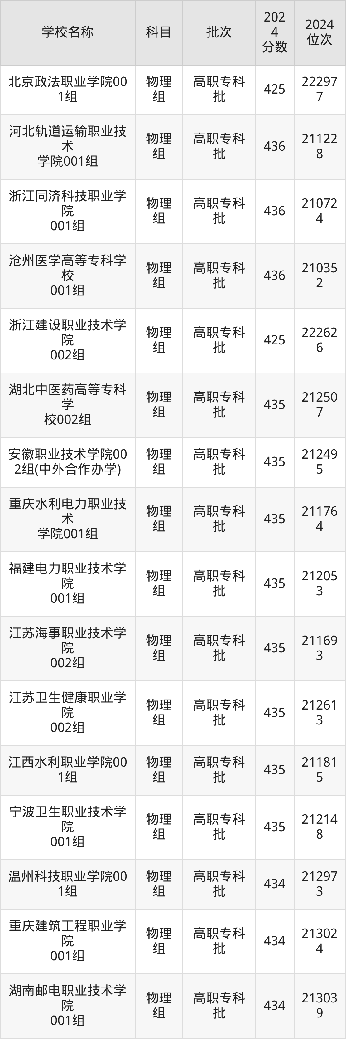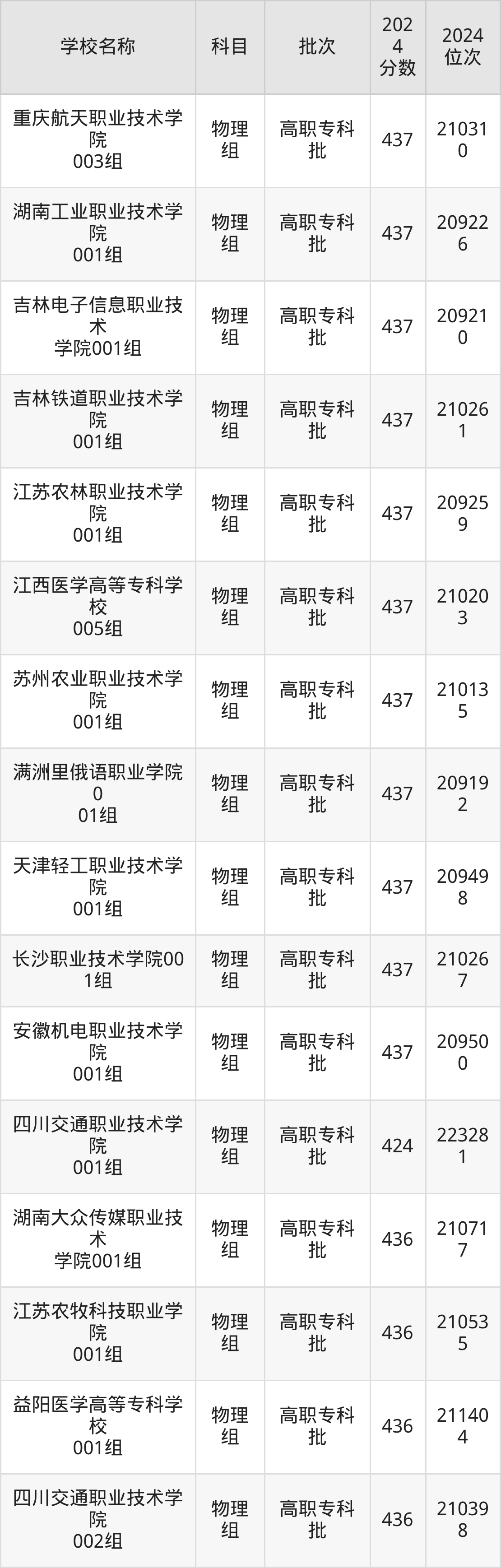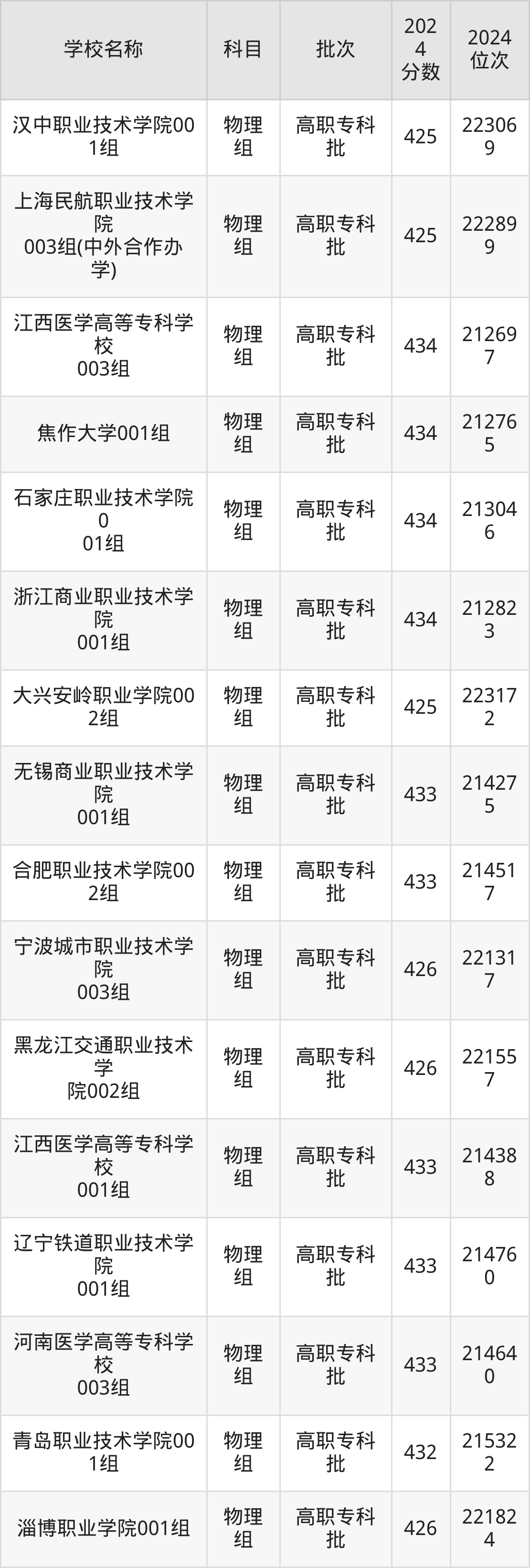 安徽高考物理组共有160所公办专科学校在420到450分之间录取,包含重庆工业职业技术学院、湖南高速铁路职业技术学院、南京城市职业学院、南阳医学高等专科学校、宁波城市职业技术学院、陕西铁路工程职业技术学院、枣庄职业学院、浙江工贸职业技术学院、安徽医学高等专科学校、杭州科技职业技术学院。