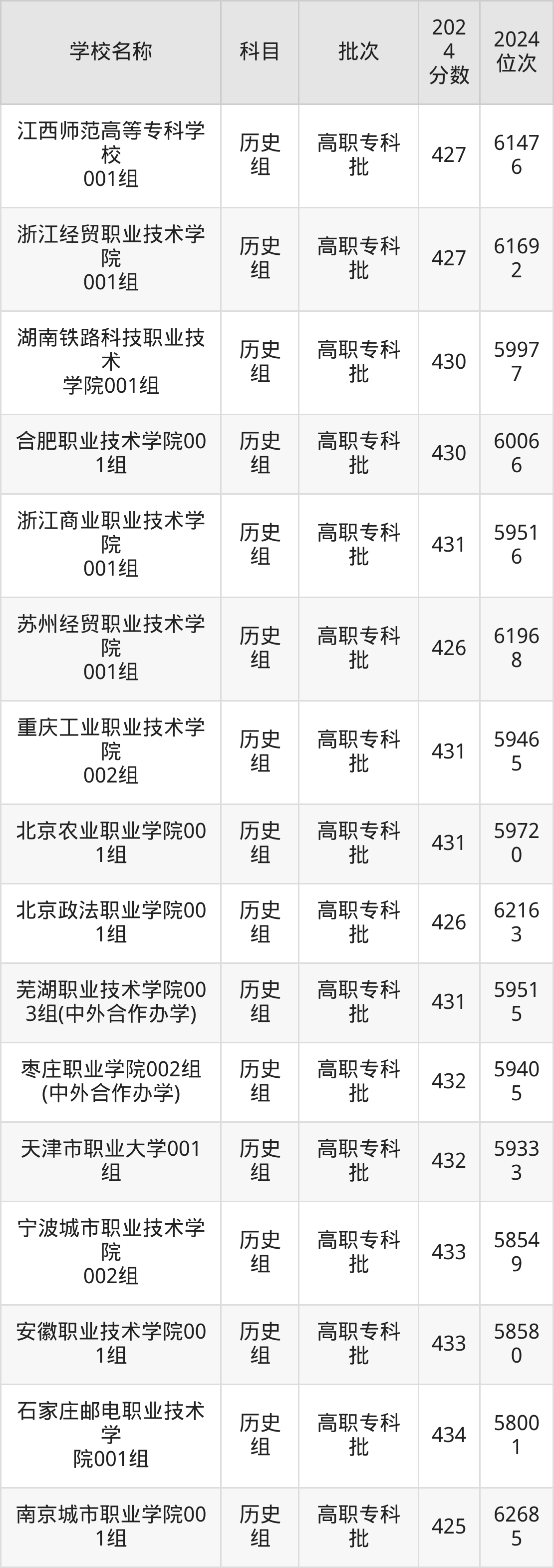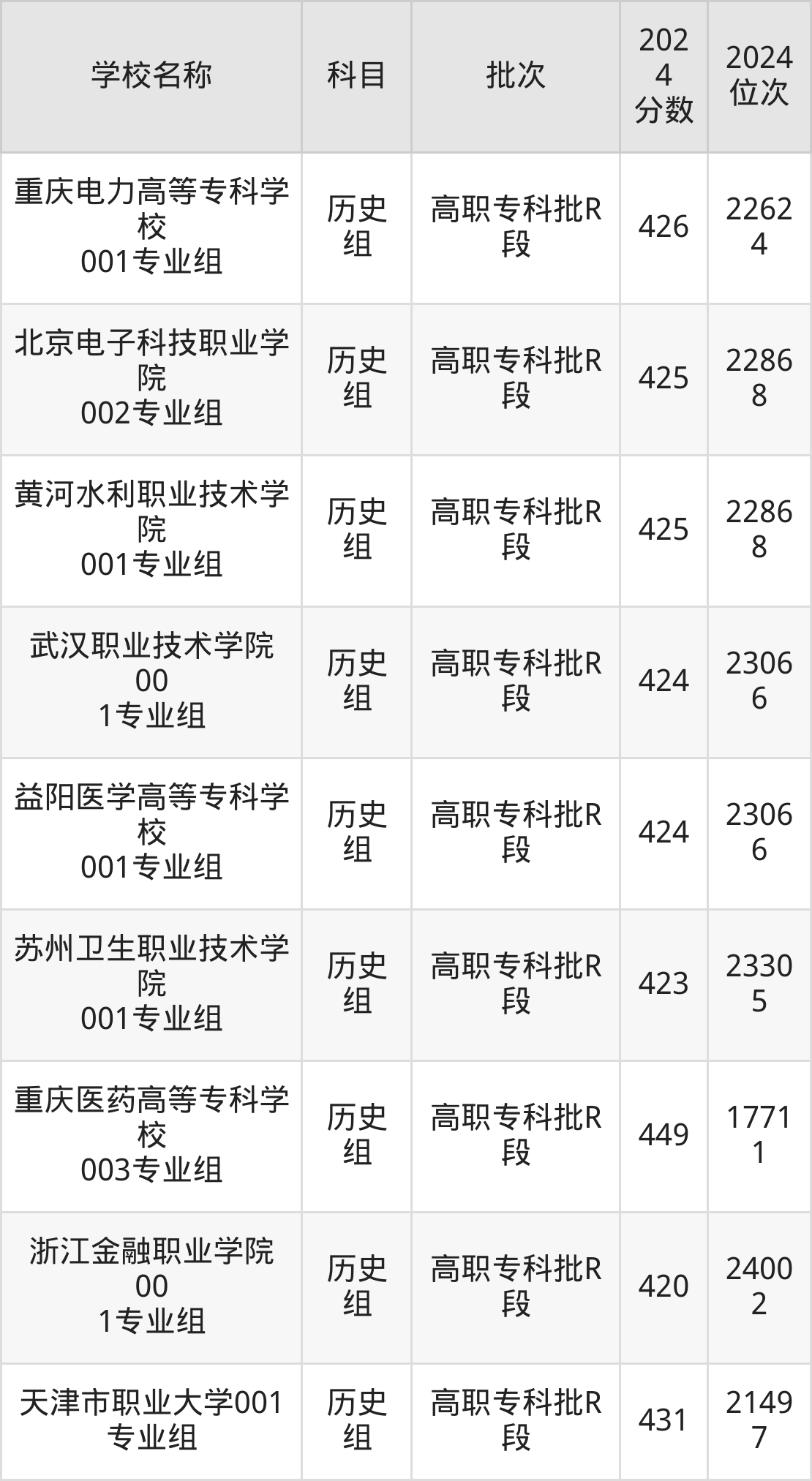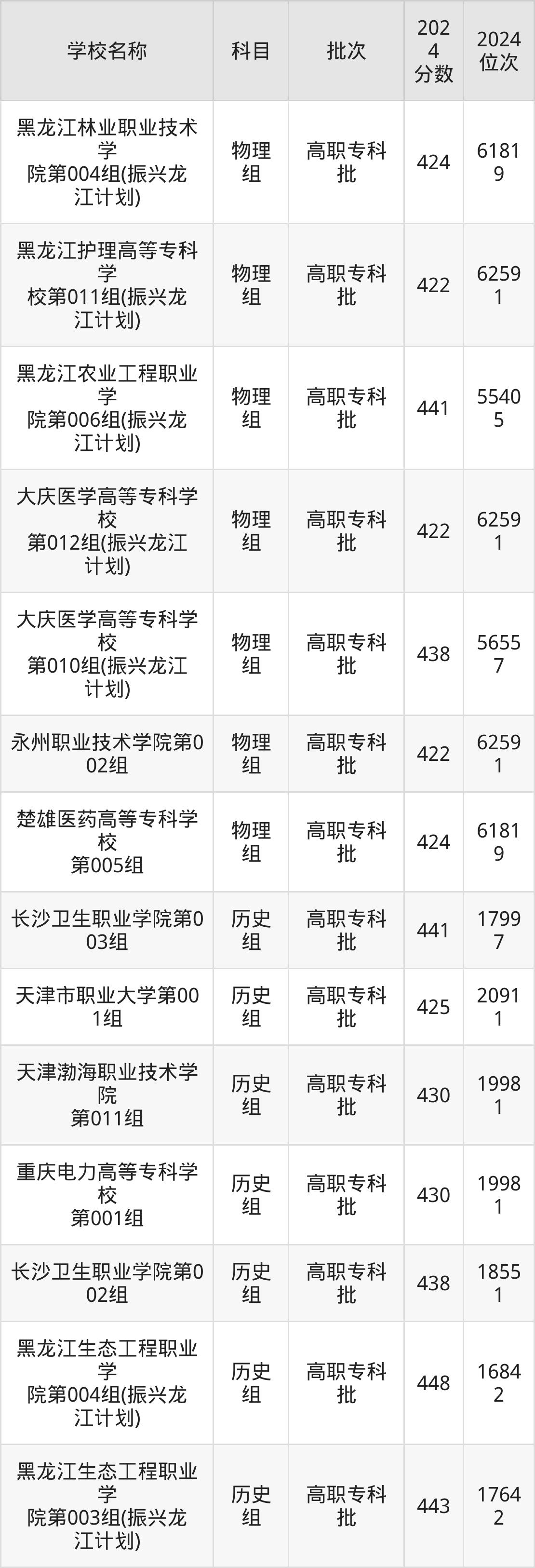 黑龙江高考历史组共有5所公办专科学校在420到450分之间录取,包含黑龙江生态工程职业学院、长沙卫生职业学院、重庆电力高等专科学校、天津渤海职业技术学院、天津市职业大学。