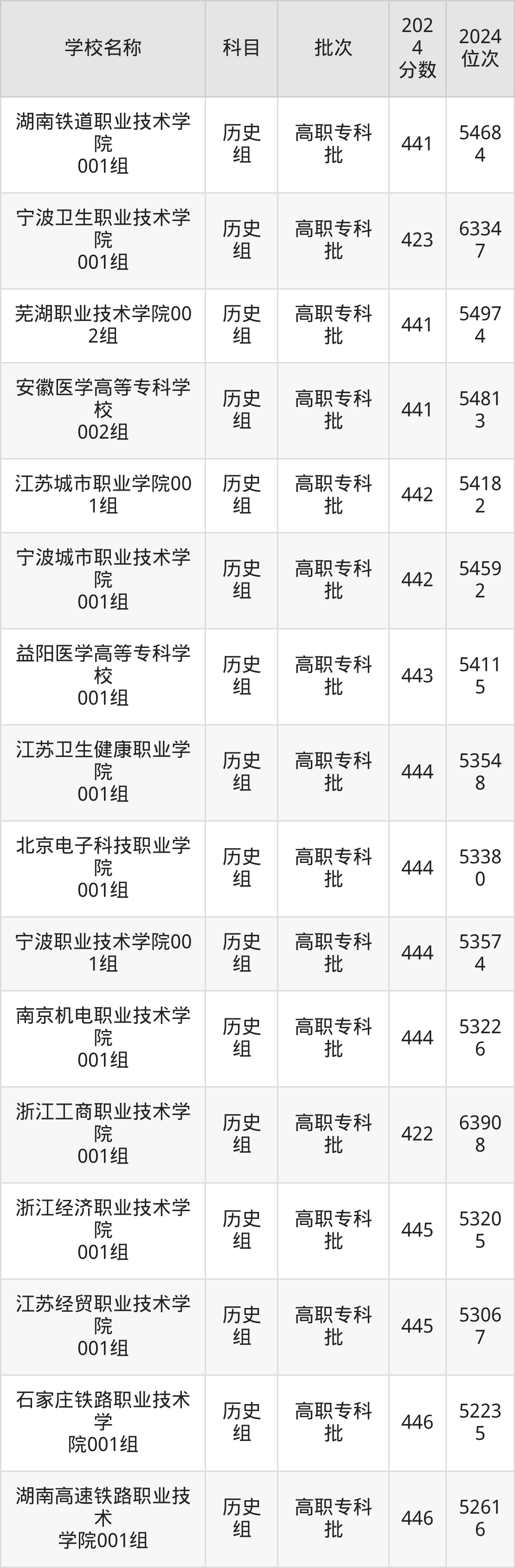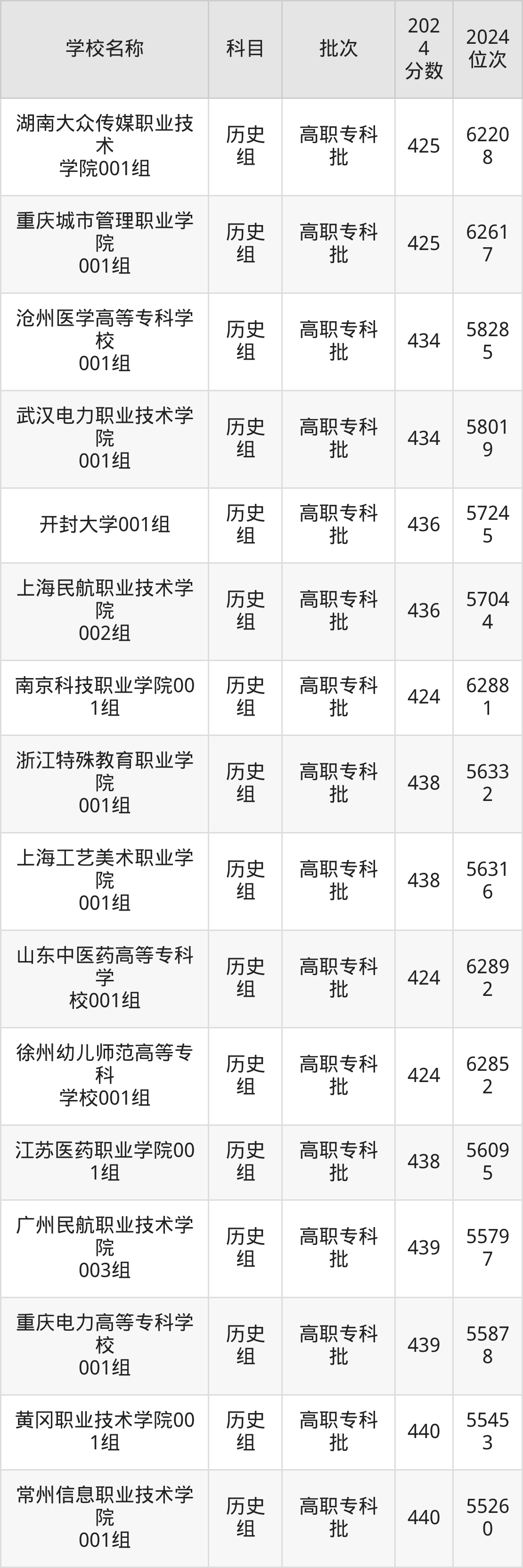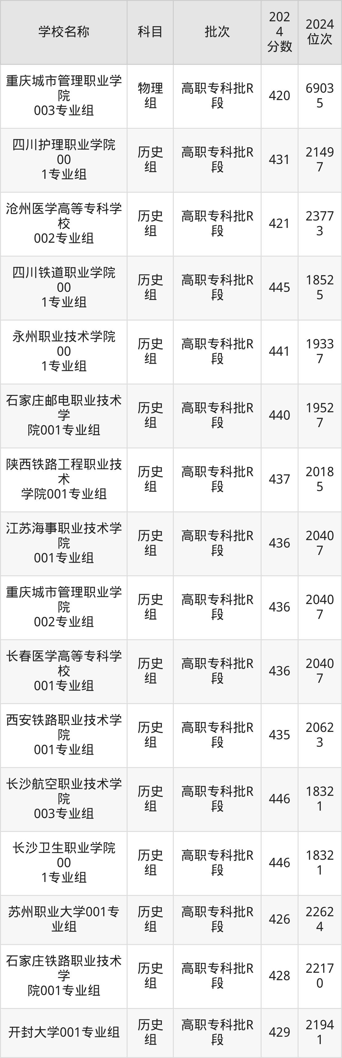 甘肃高考历史组共有24所公办专科学校在420到450分之间录取,包含重庆医药高等专科学校、长沙航空职业技术学院、长沙卫生职业学院、四川铁道职业学院、永州职业技术学院、石家庄邮电职业技术学院、陕西铁路工程职业技术学院、江苏海事职业技术学院、重庆城市管理职业学院、长春医学高等专科学校。