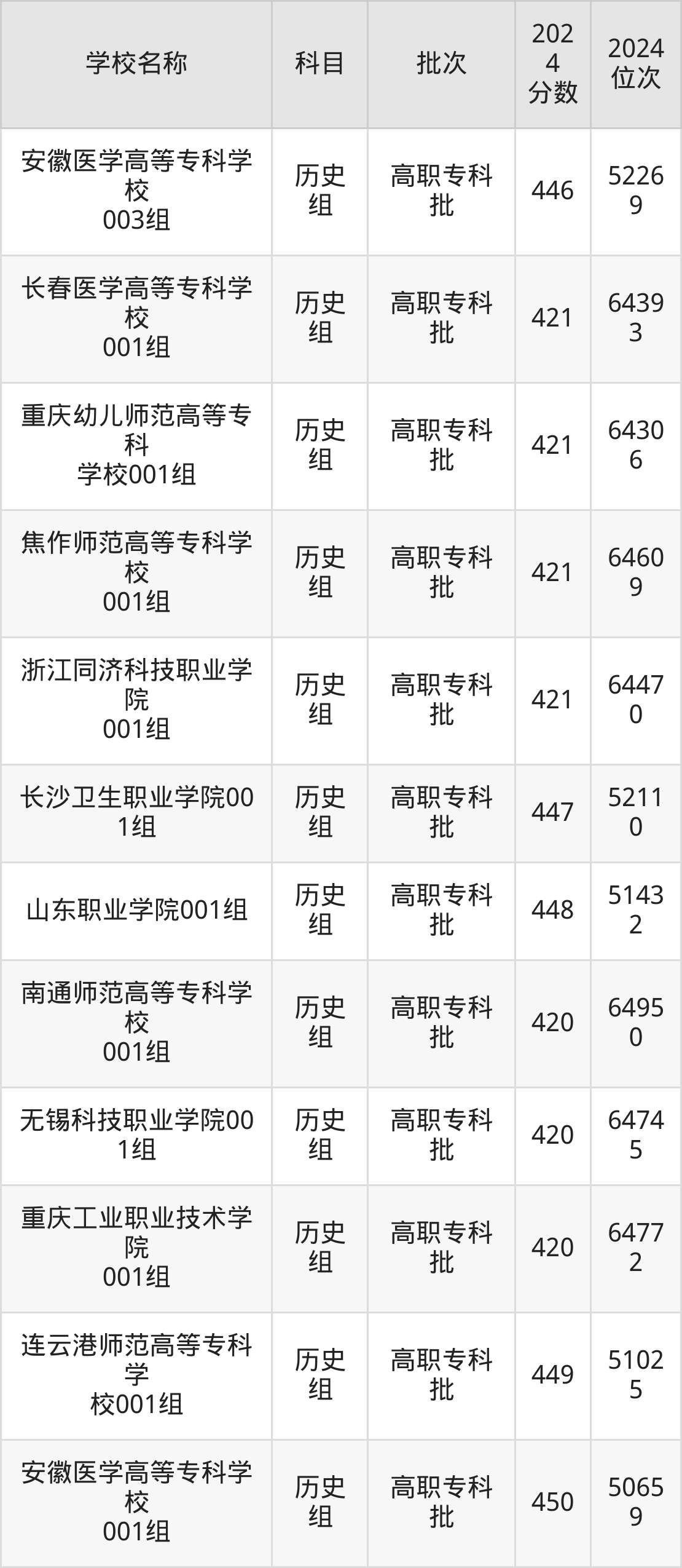 安徽高考历史组共有63所公办专科学校在420到450分之间录取,包含安徽医学高等专科学校、连云港师范高等专科学校、山东职业学院、长沙卫生职业学院、湖南高速铁路职业技术学院、石家庄铁路职业技术学院、江苏经贸职业技术学院、浙江经济职业技术学院、南京机电职业技术学院、宁波职业技术学院。
