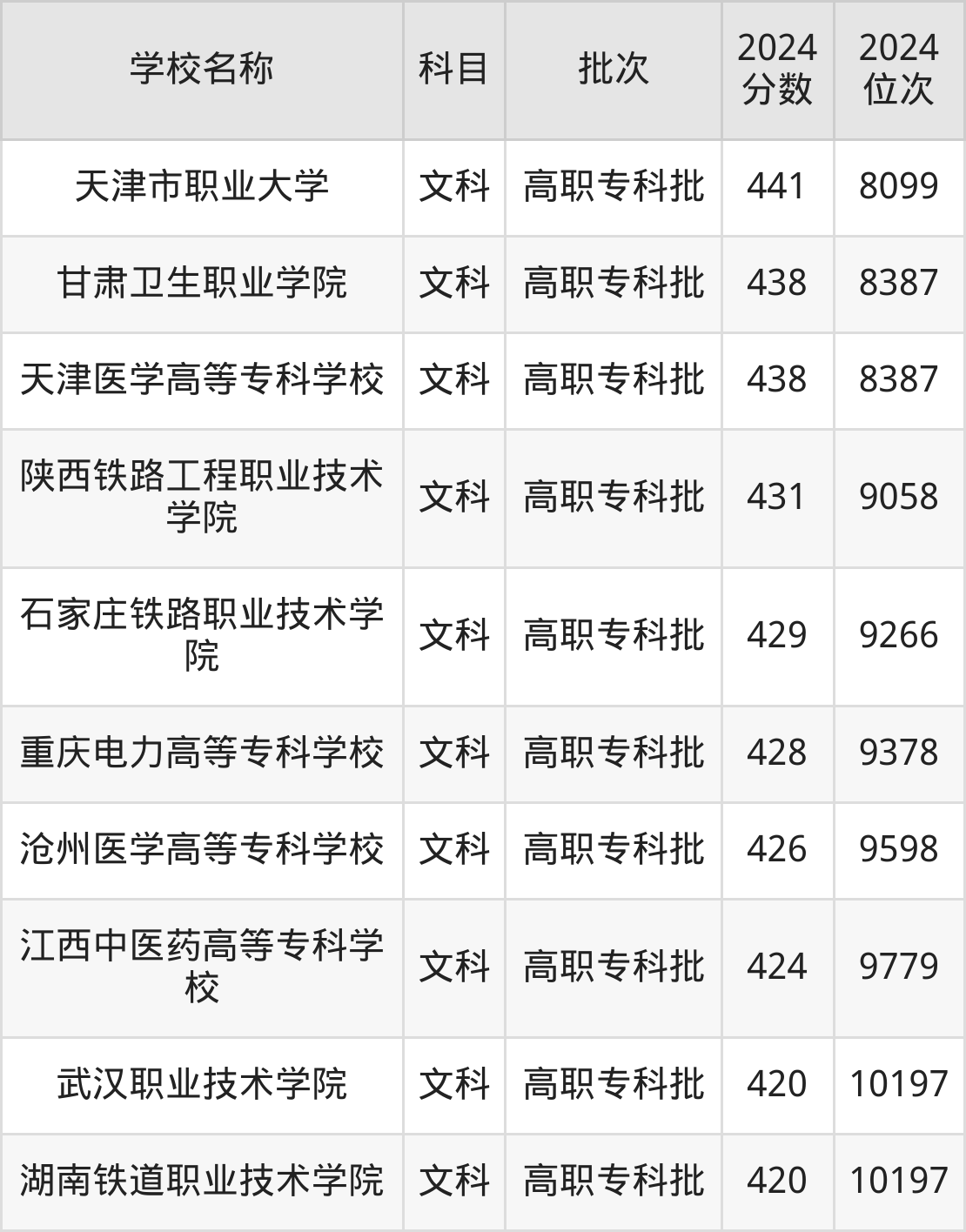 宁夏高考文科共有10所公办专科学校在420到450分之间录取,包含天津市职业大学、甘肃卫生职业学院、天津医学高等专科学校、陕西铁路工程职业技术学院、石家庄铁路职业技术学院、重庆电力高等专科学校、沧州医学高等专科学校、江西中医药高等专科学校、武汉职业技术学院、湖南铁道职业技术学院。