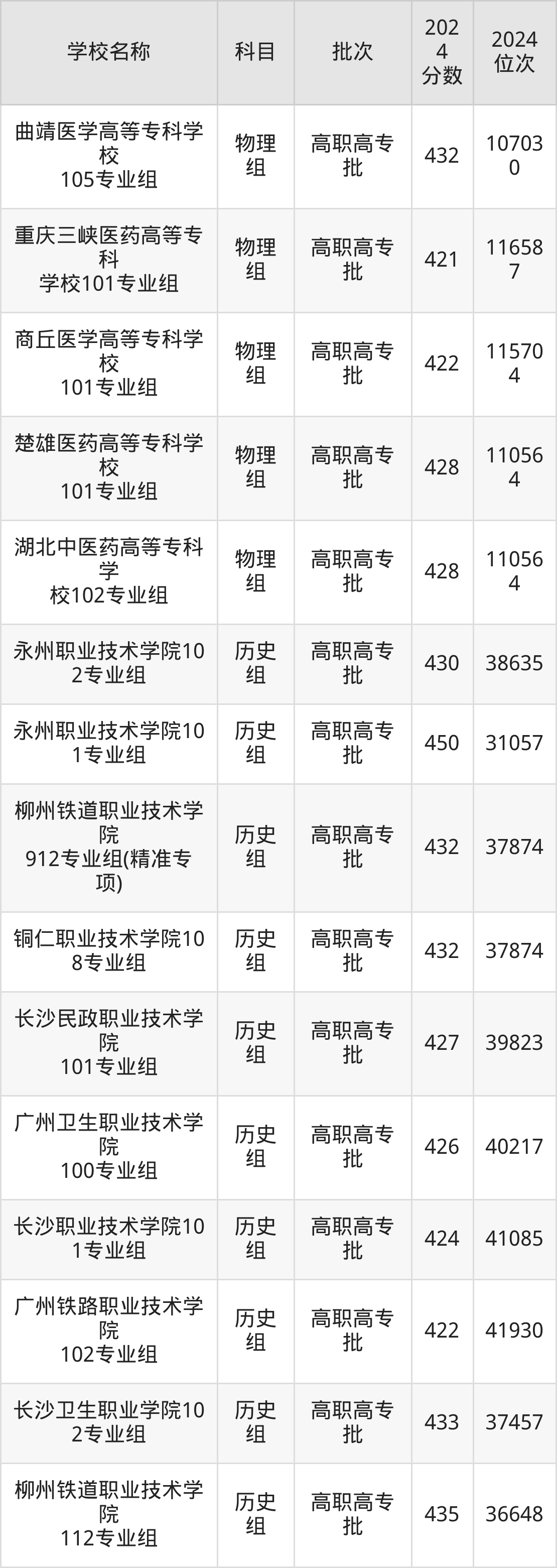 广西高考历史组共有8所公办专科学校在420到450分之间录取,包含永州职业技术学院、柳州铁道职业技术学院、长沙卫生职业学院、铜仁职业技术学院、长沙民政职业技术学院、广州卫生职业技术学院、长沙职业技术学院、广州铁路职业技术学院。