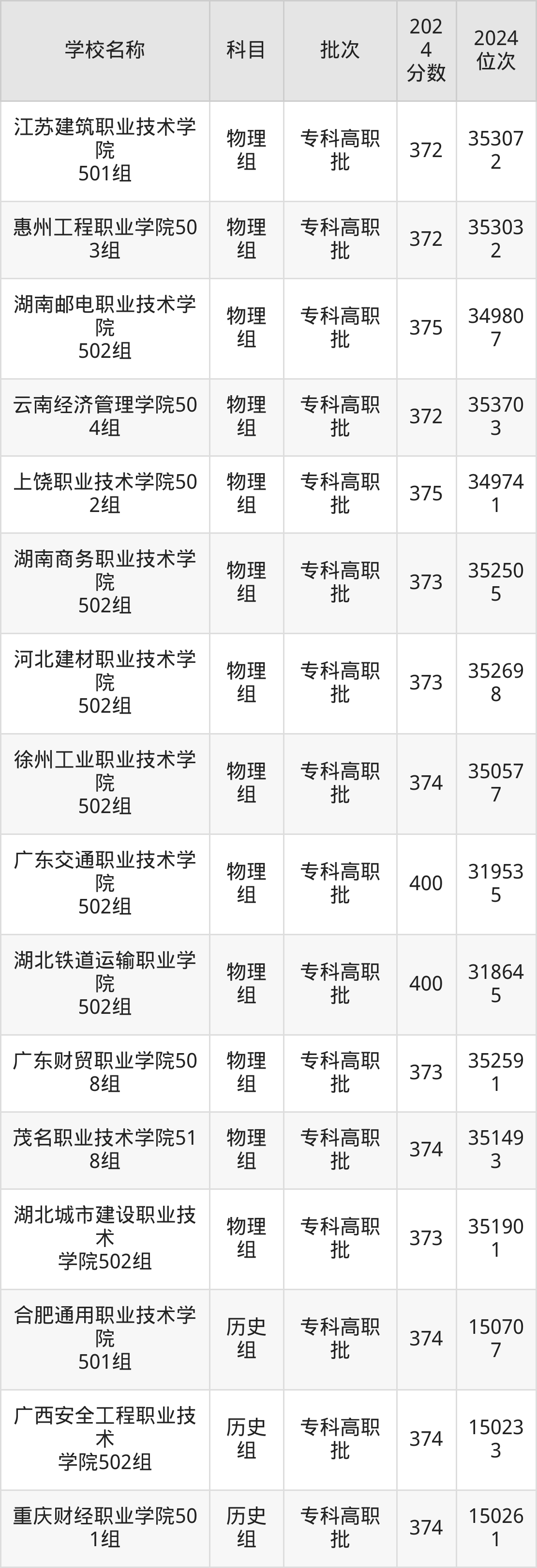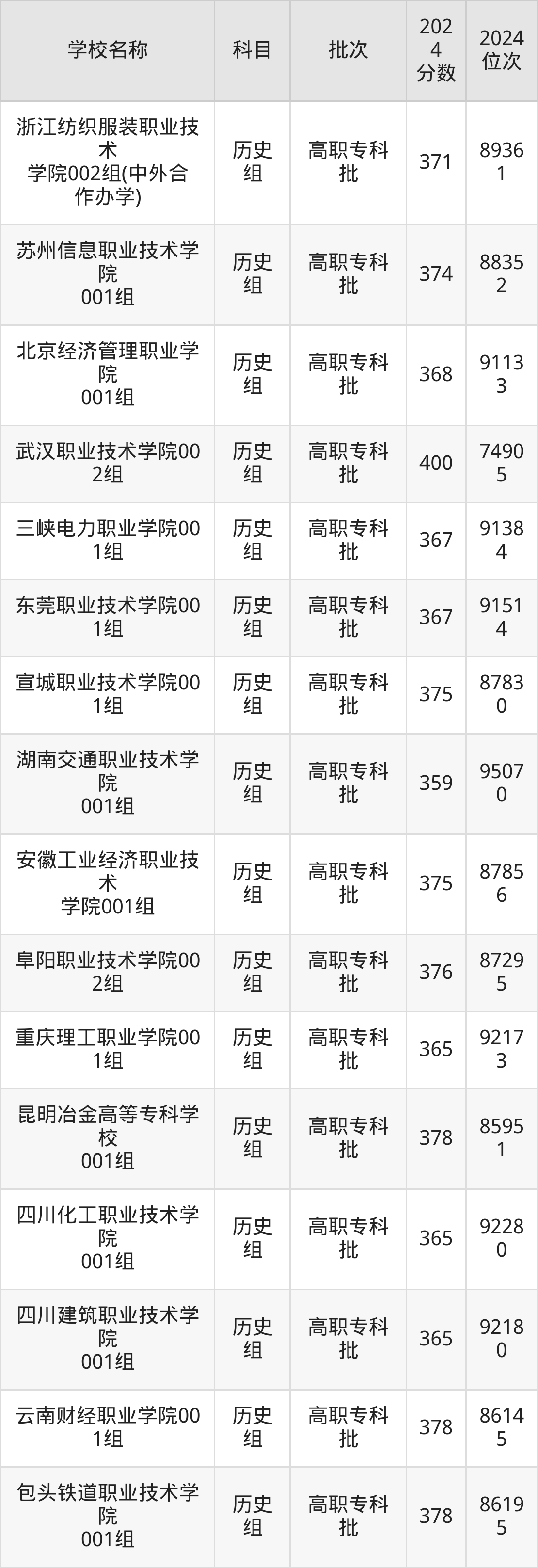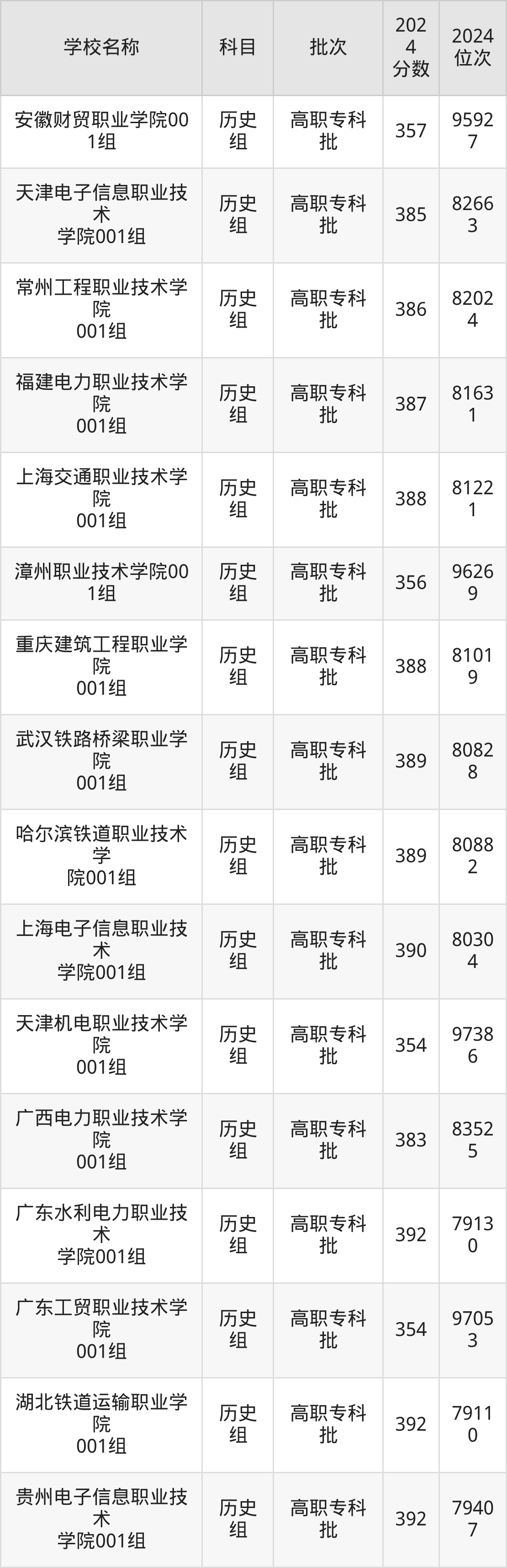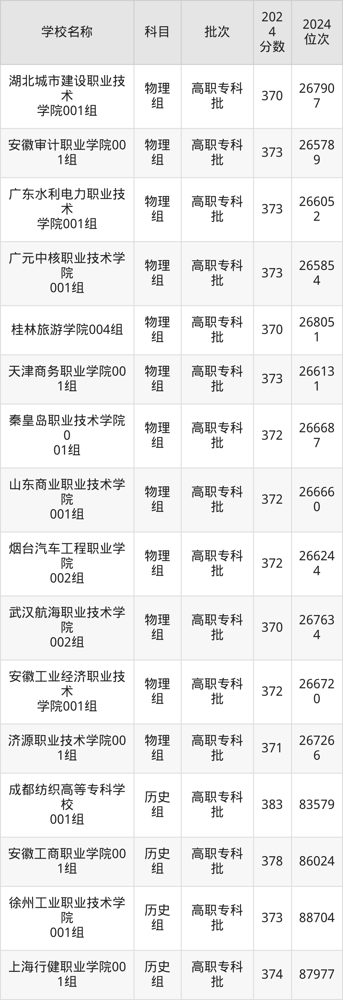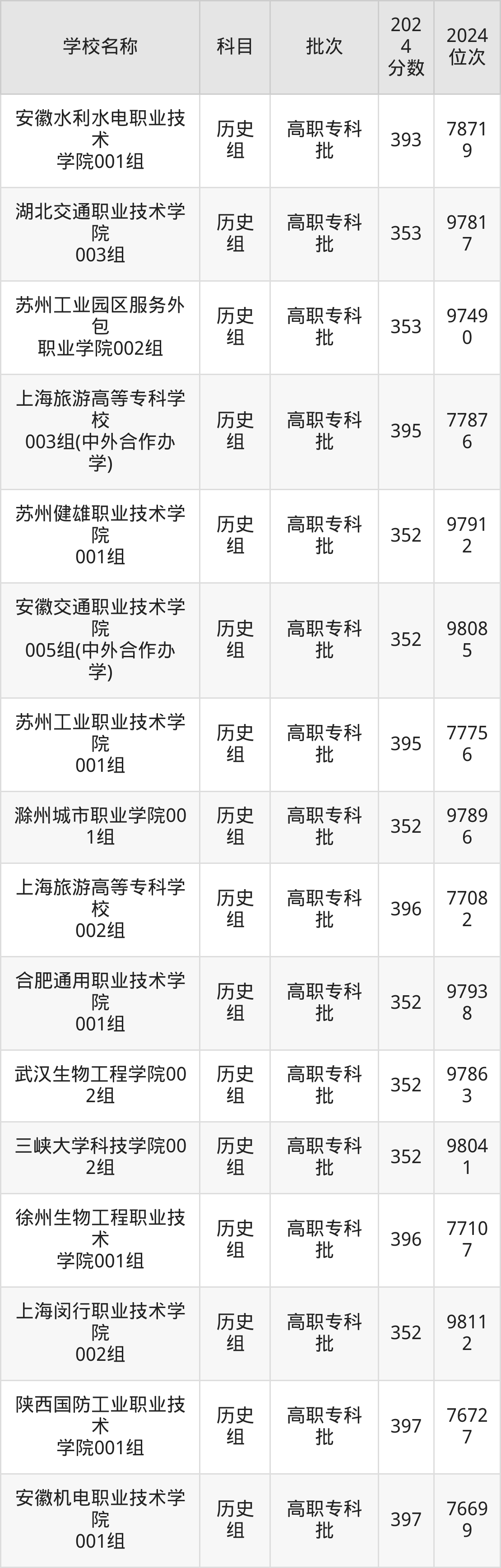 安徽高考历史组共有87所理科大学在350到400分之间录取,包含武汉职业技术学院、河北轨道运输职业技术学院、江苏财会职业学院、江苏食品药品职业技术学院、江苏信息职业技术学院、安徽机电职业技术学院、陕西国防工业职业技术学院、徐州生物工程职业技术学院、上海旅游高等专科学校、苏州工业职业技术学院。