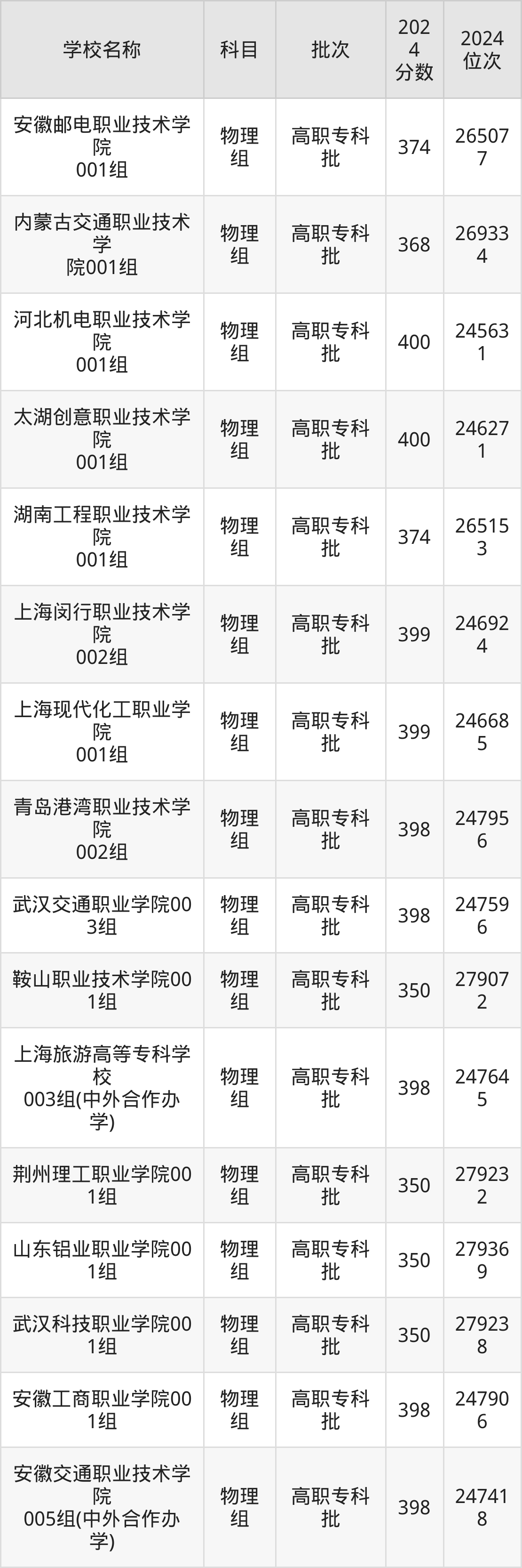 安徽高考物理组共有116所理科大学在350到400分之间录取,包含上海行健职业学院、河北机电职业技术学院、太湖创意职业技术学院、广东理工职业学院、上海闵行职业技术学院、上海现代化工职业学院、青岛港湾职业技术学院、武汉交通职业学院、上海旅游高等专科学校、安徽工商职业学院。