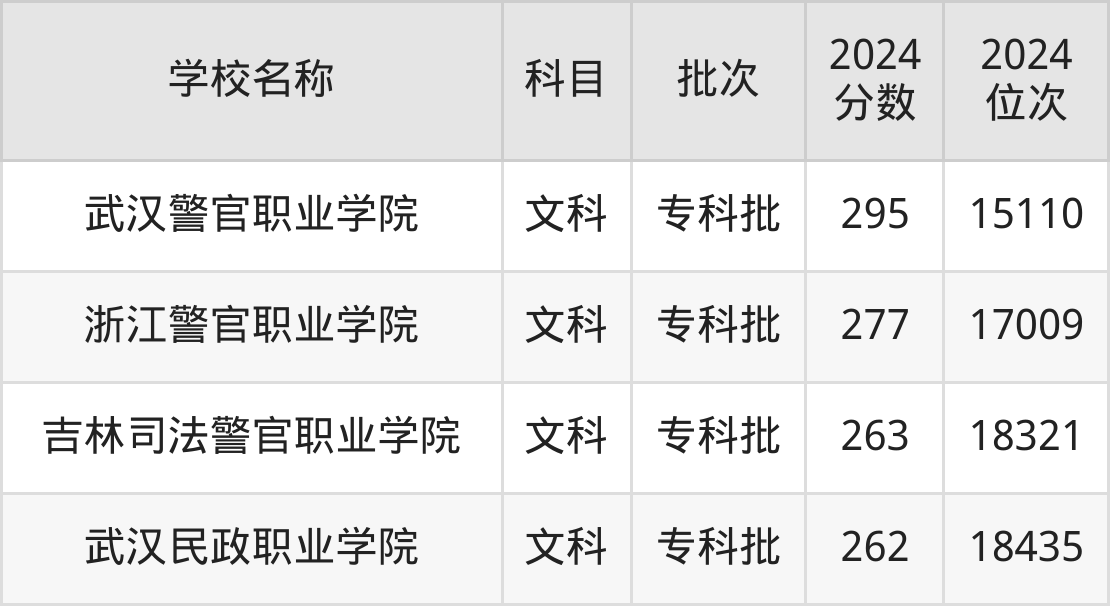 新疆高考文科共有4所政法大学在260到300分之间录取,包含武汉警官职业学院、浙江警官职业学院、吉林司法警官职业学院、武汉民政职业学院。