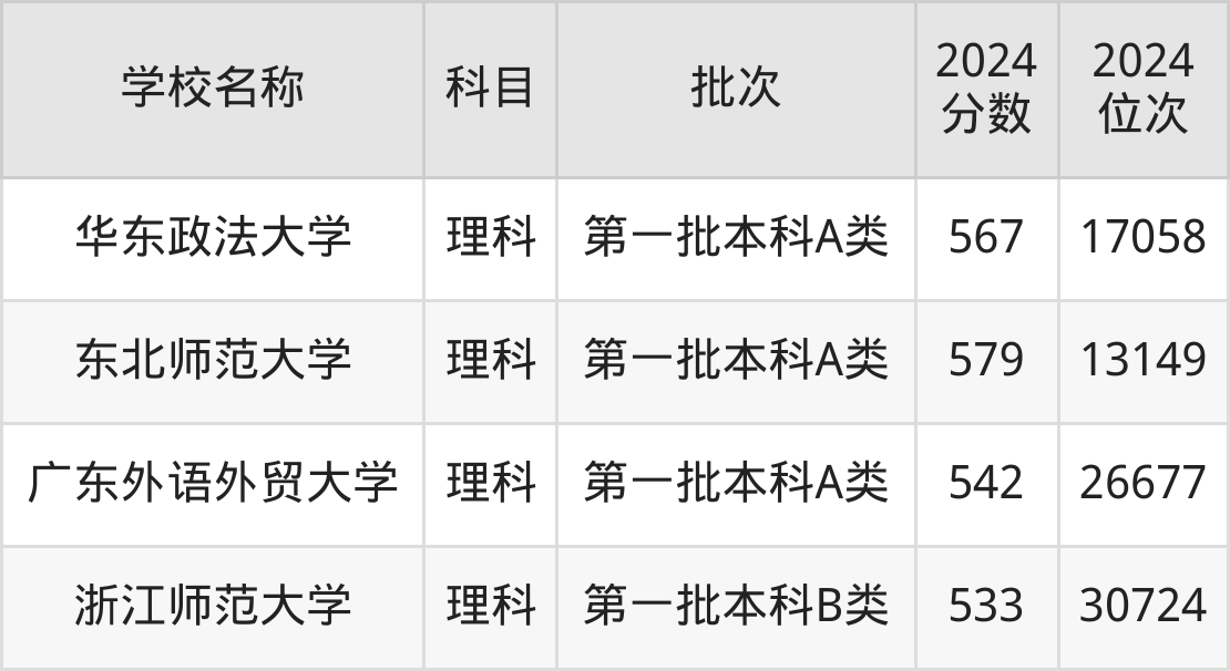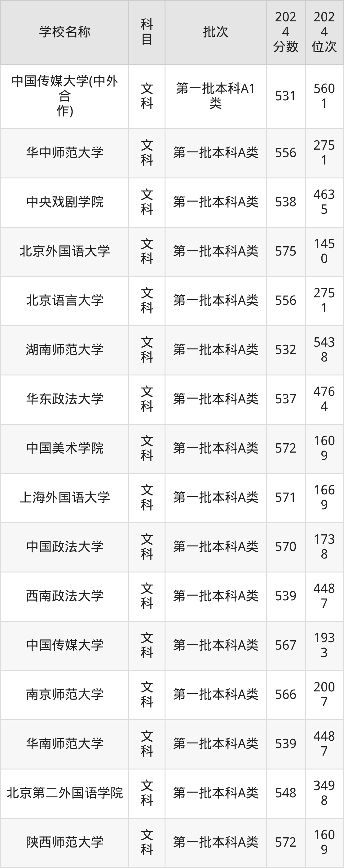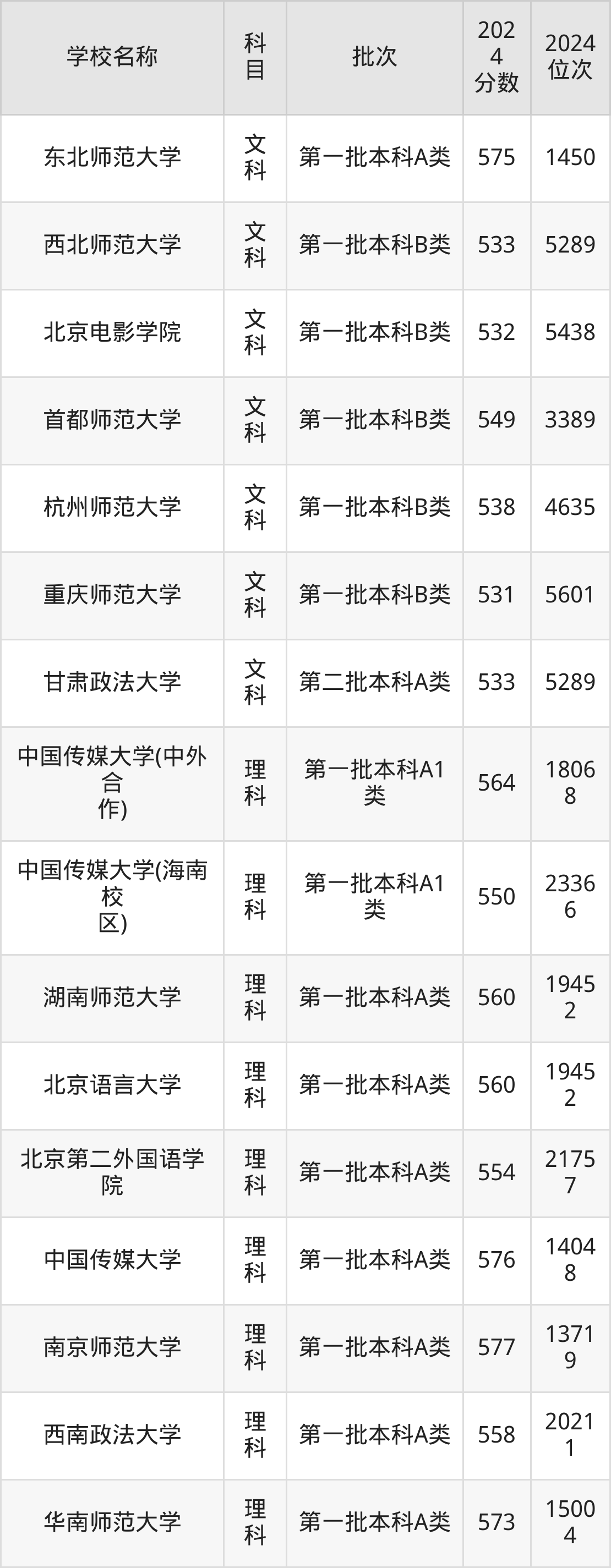 山西高考理科共有13所文科大学在530到580分之间录取,包含东北师范大学、南京师范大学、中国传媒大学、华南师范大学、华东政法大学、中国传媒大学(中外合作)、湖南师范大学、北京语言大学、西南政法大学、北京第二外国语学院。