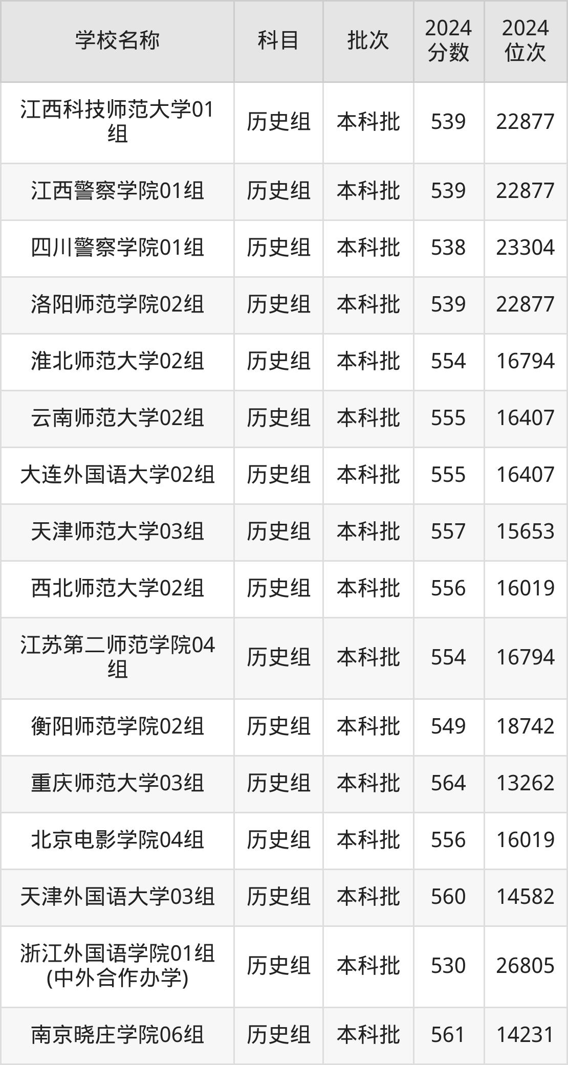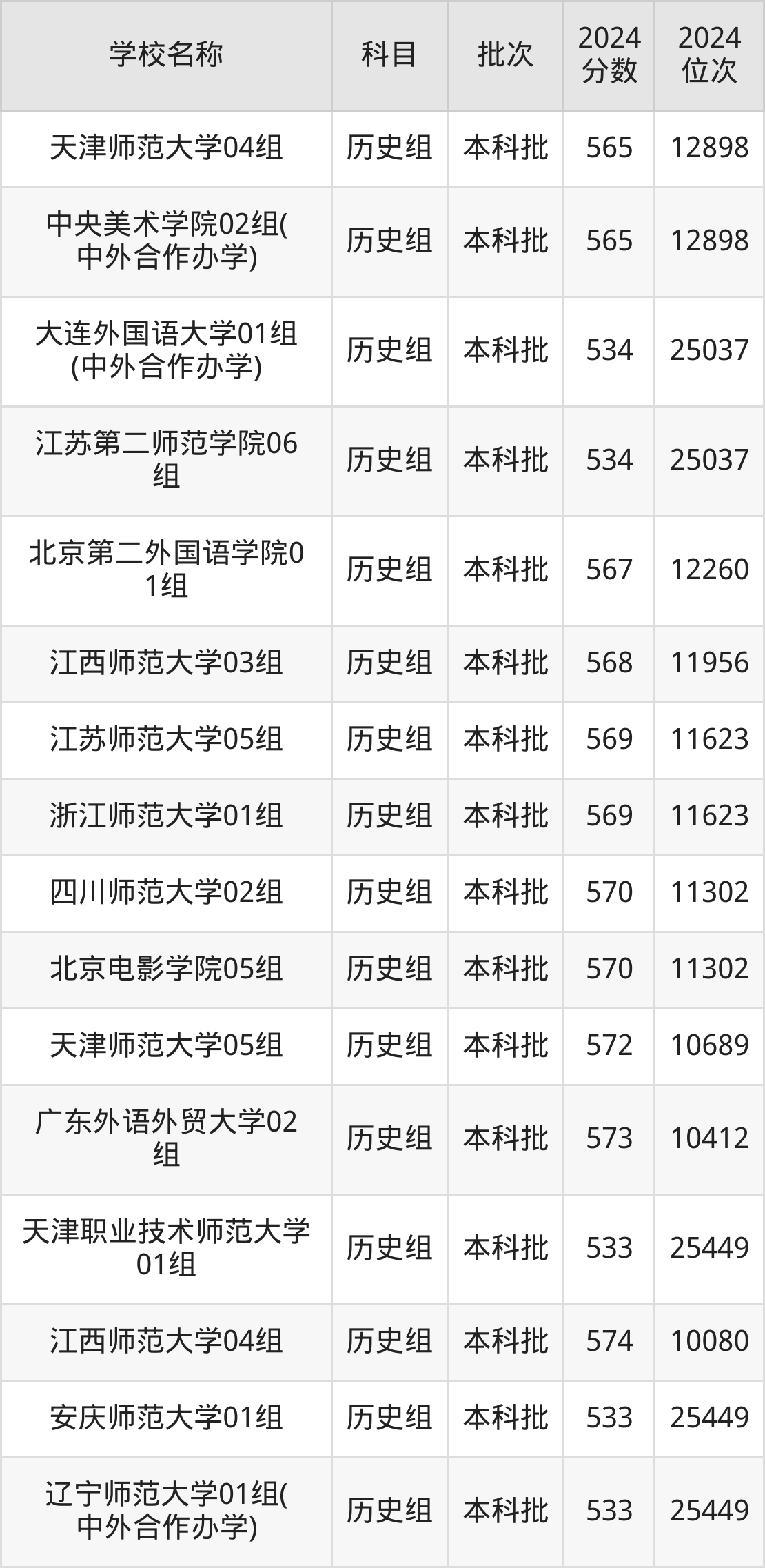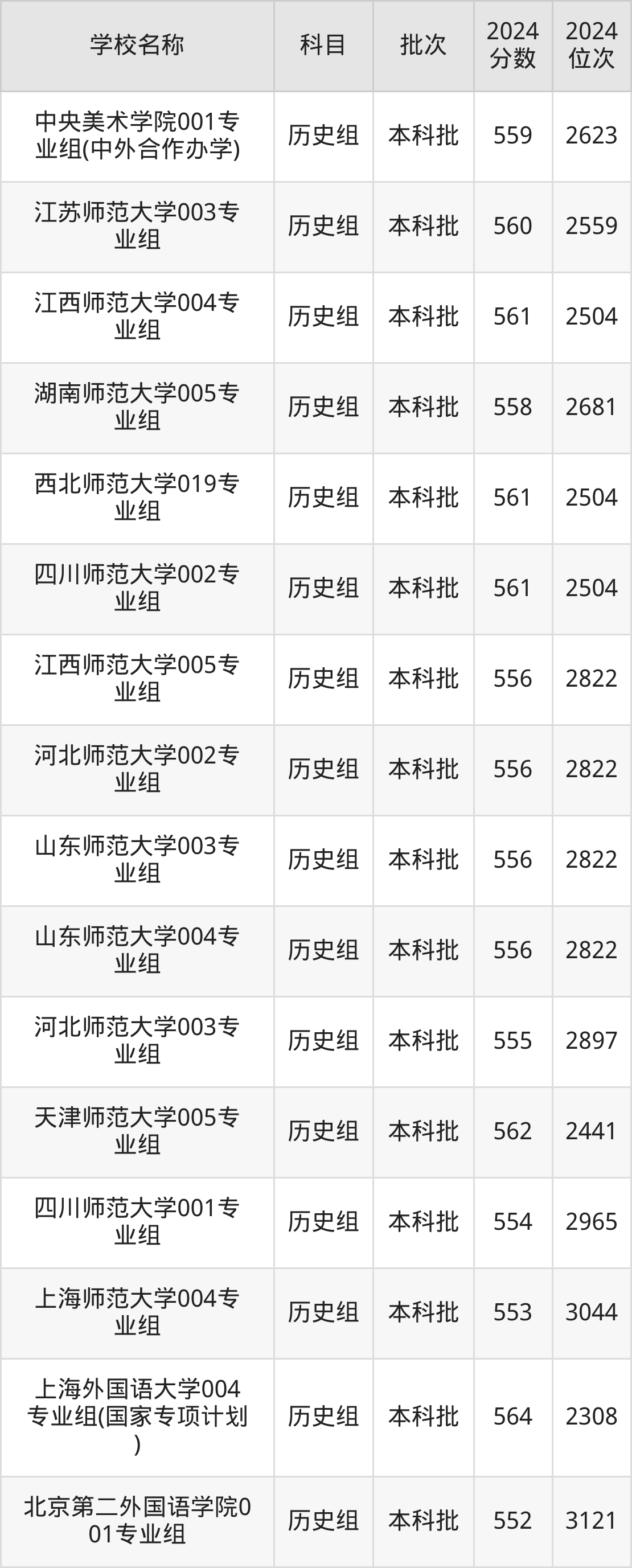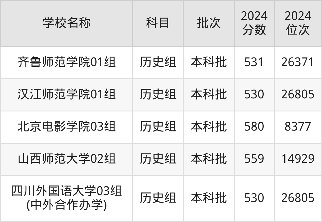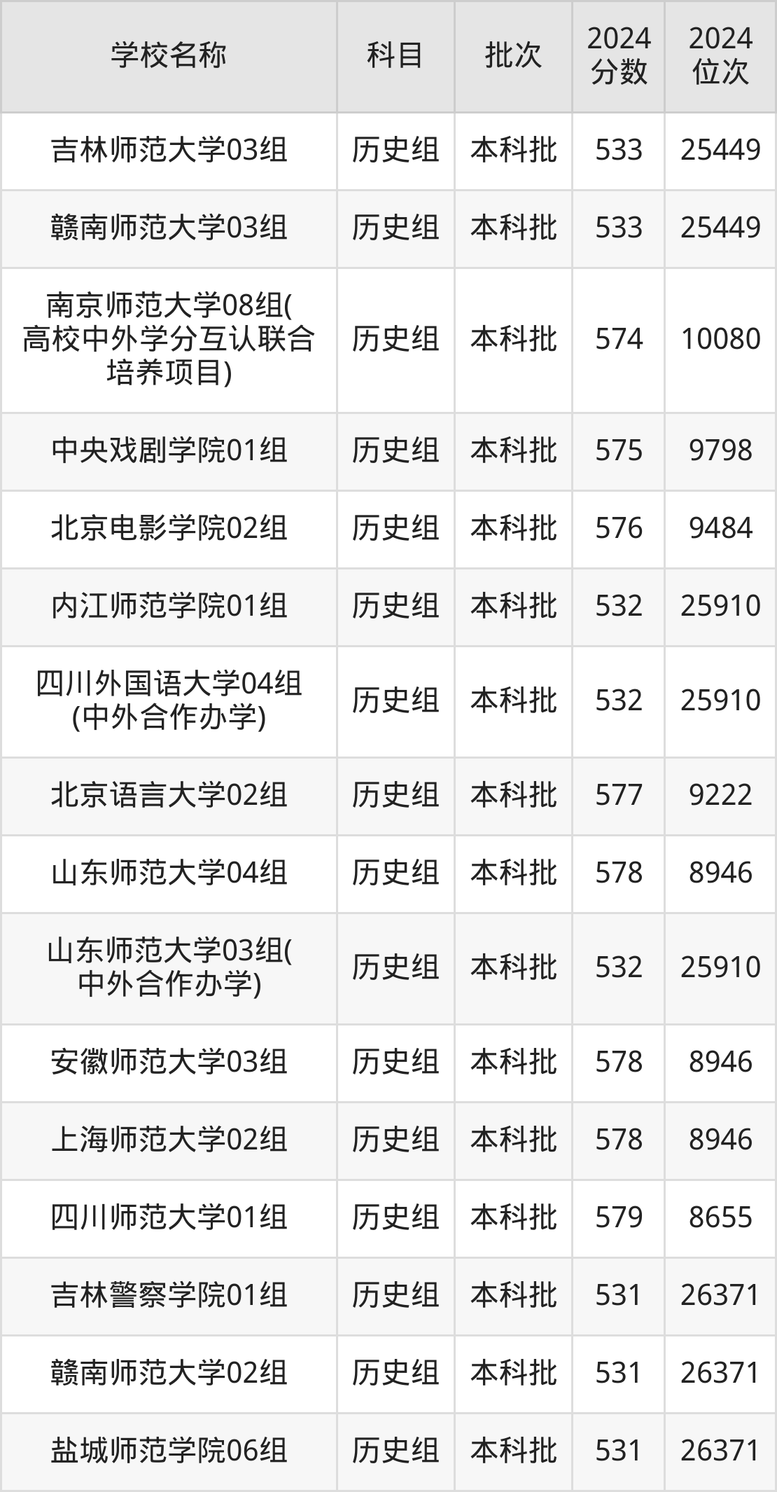 江苏高考历史组共有60所文科大学在530到580分之间录取,包含北京电影学院、四川师范大学、上海师范大学、安徽师范大学、山东师范大学、北京语言大学、中央戏剧学院、南京师范大学、江西师范大学、广东外语外贸大学。