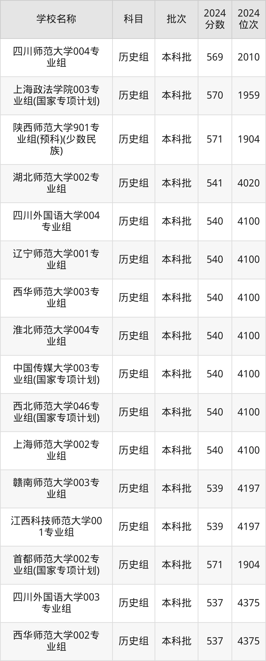 福建高考历史组共有37所文科大学在530到580分之间录取,包含上海政法学院、江西师范大学、中国传媒大学(中外合作)、北京语言大学、福建师范大学、北京电影学院(艺术类)、山西师范大学、首都师范大学、四川师范大学、重庆师范大学。