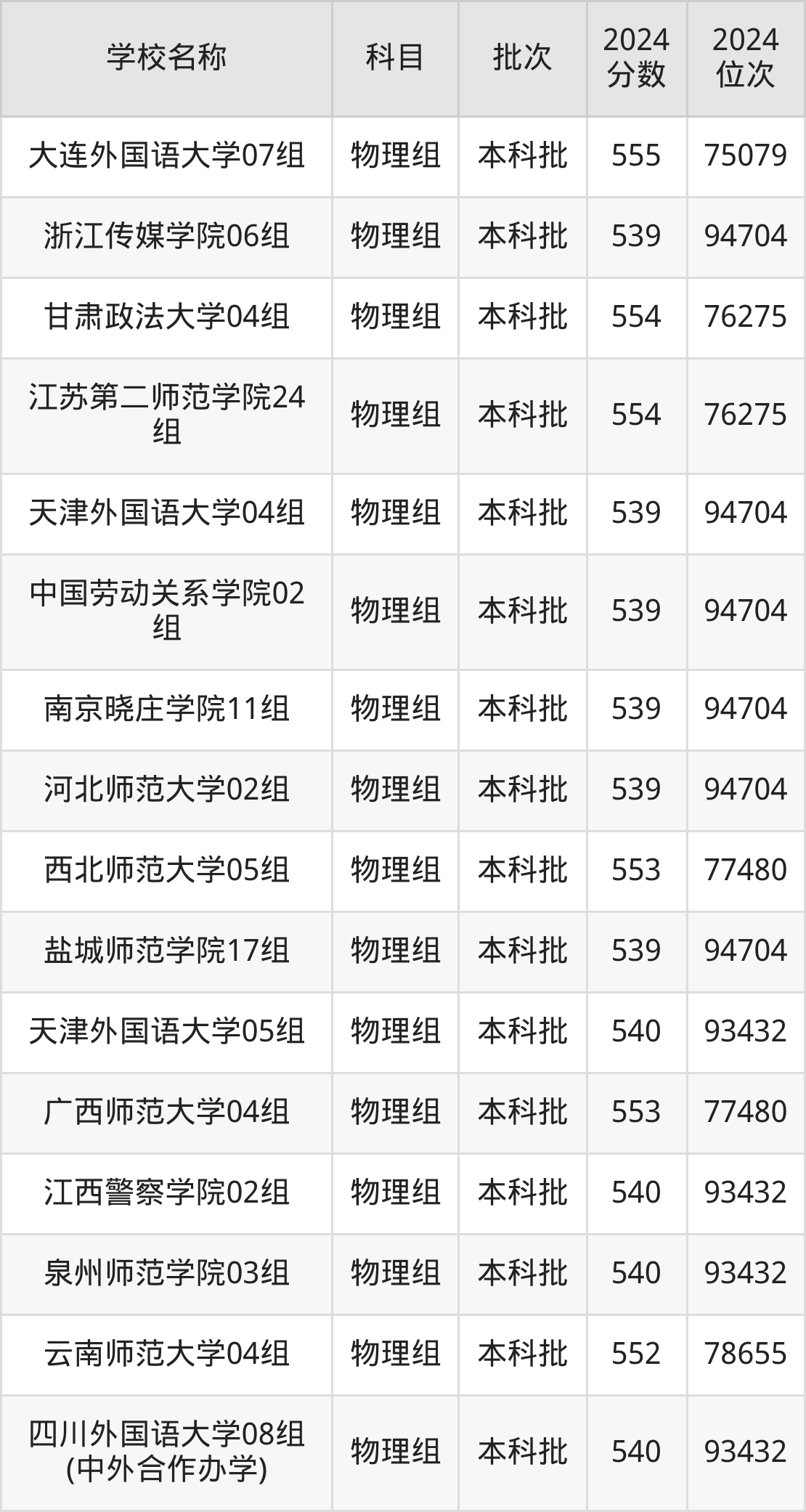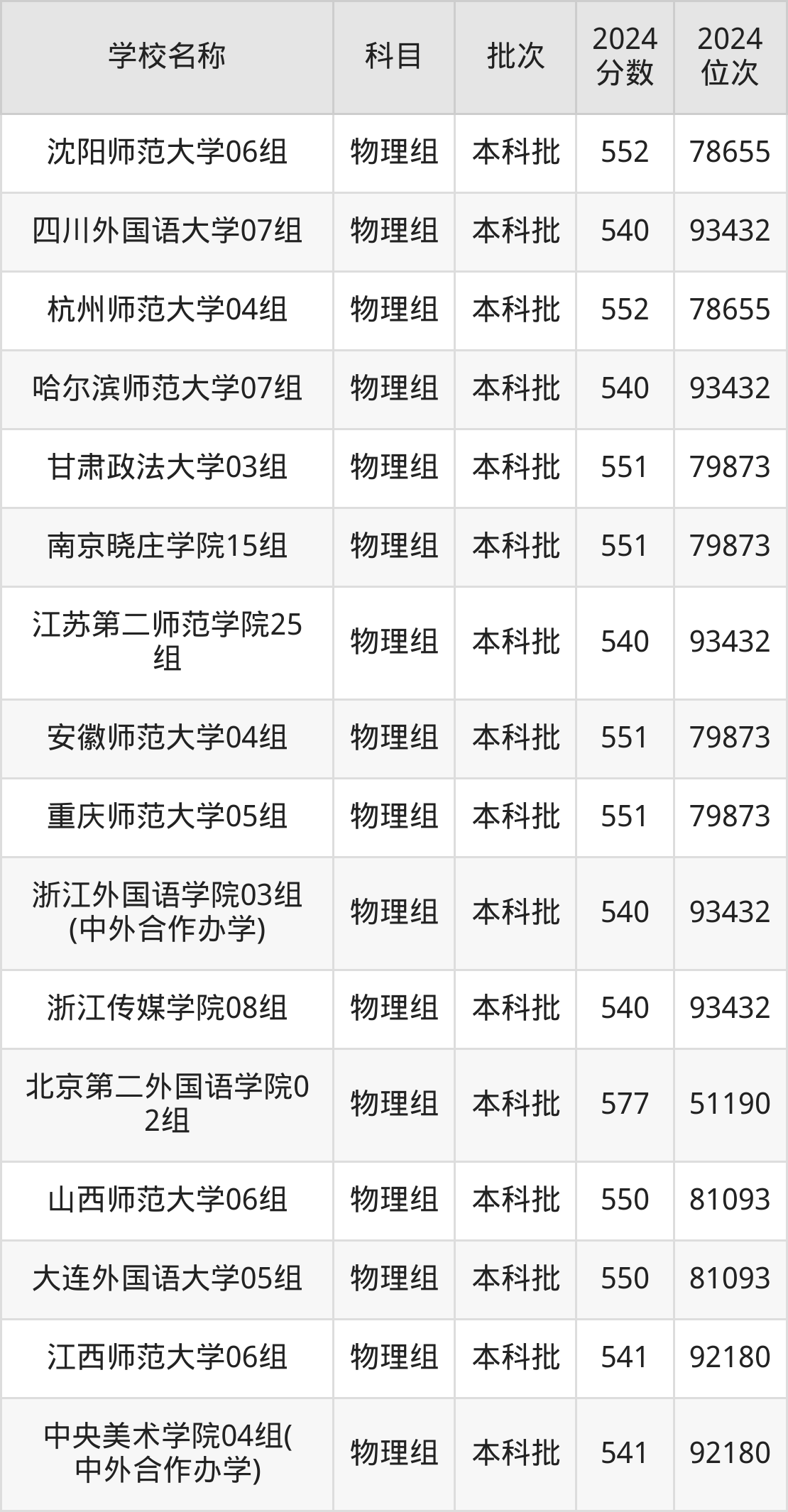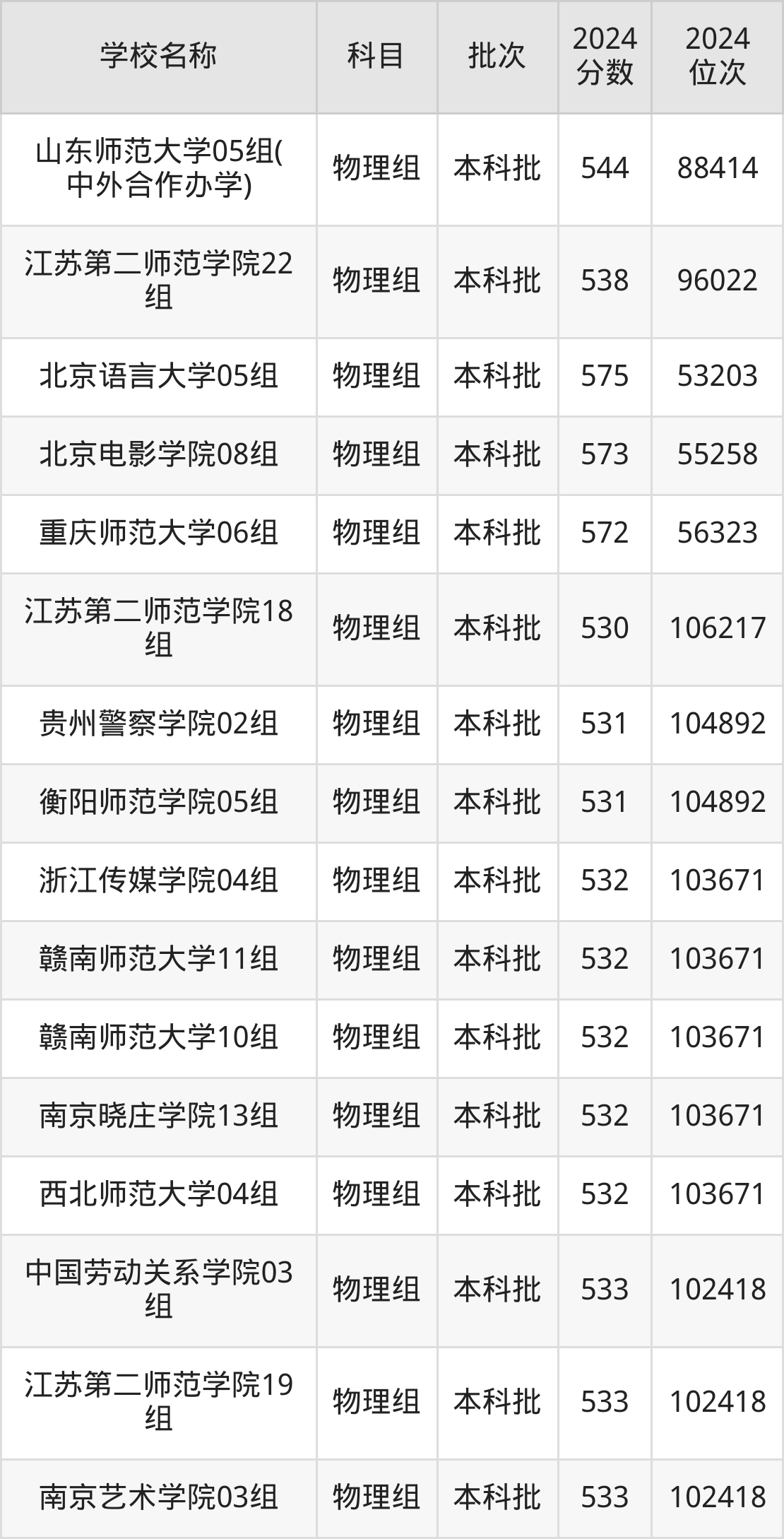 江苏高考物理组共有58所文科大学在530到580分之间录取,包含北京第二外国语学院、上海师范大学、北京语言大学、北京电影学院、重庆师范大学、曲阜师范大学、广州美术学院、四川师范大学、江苏师范大学、天津师范大学。