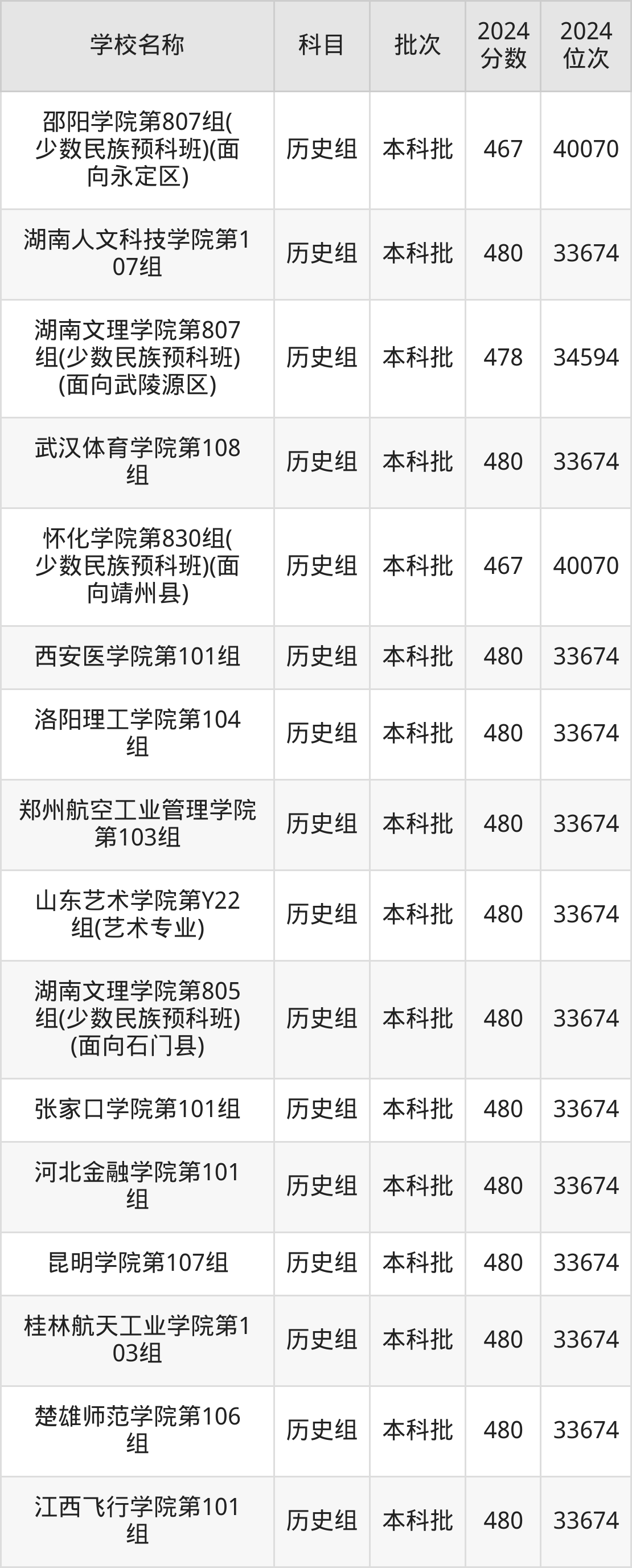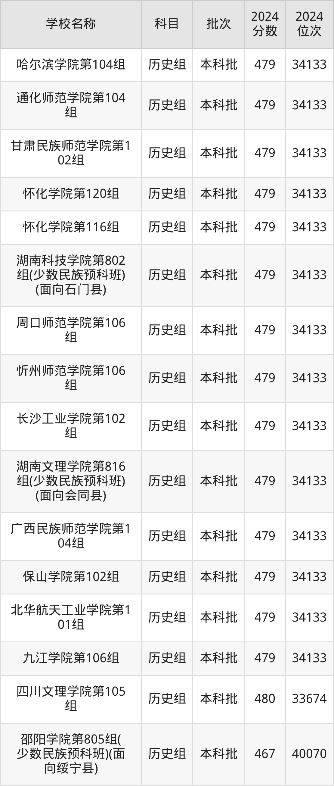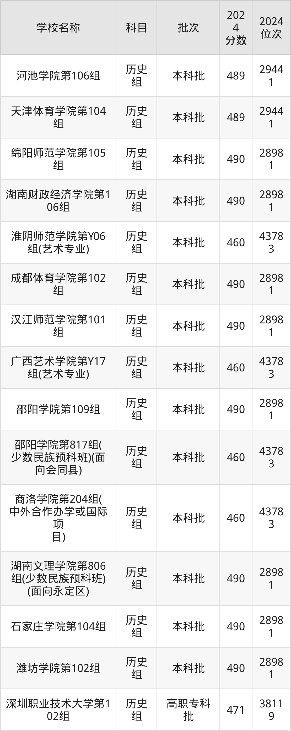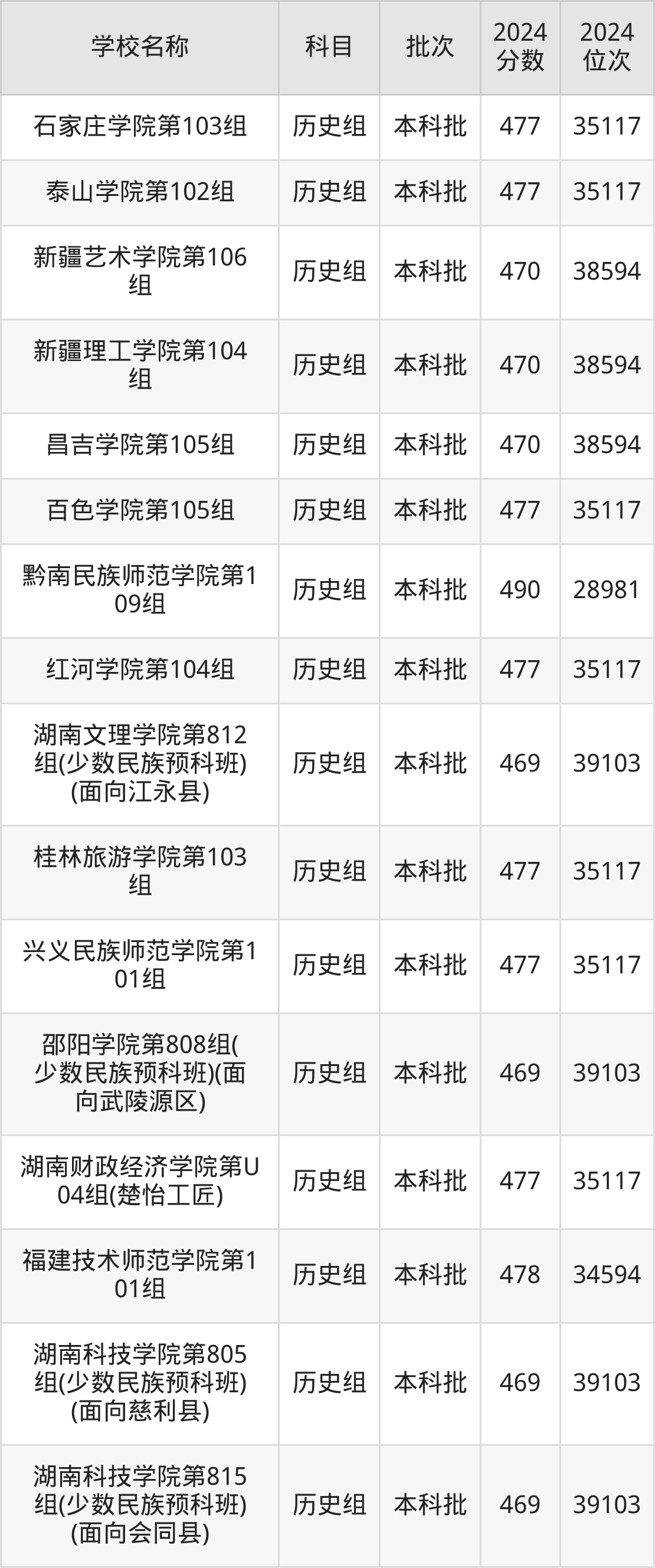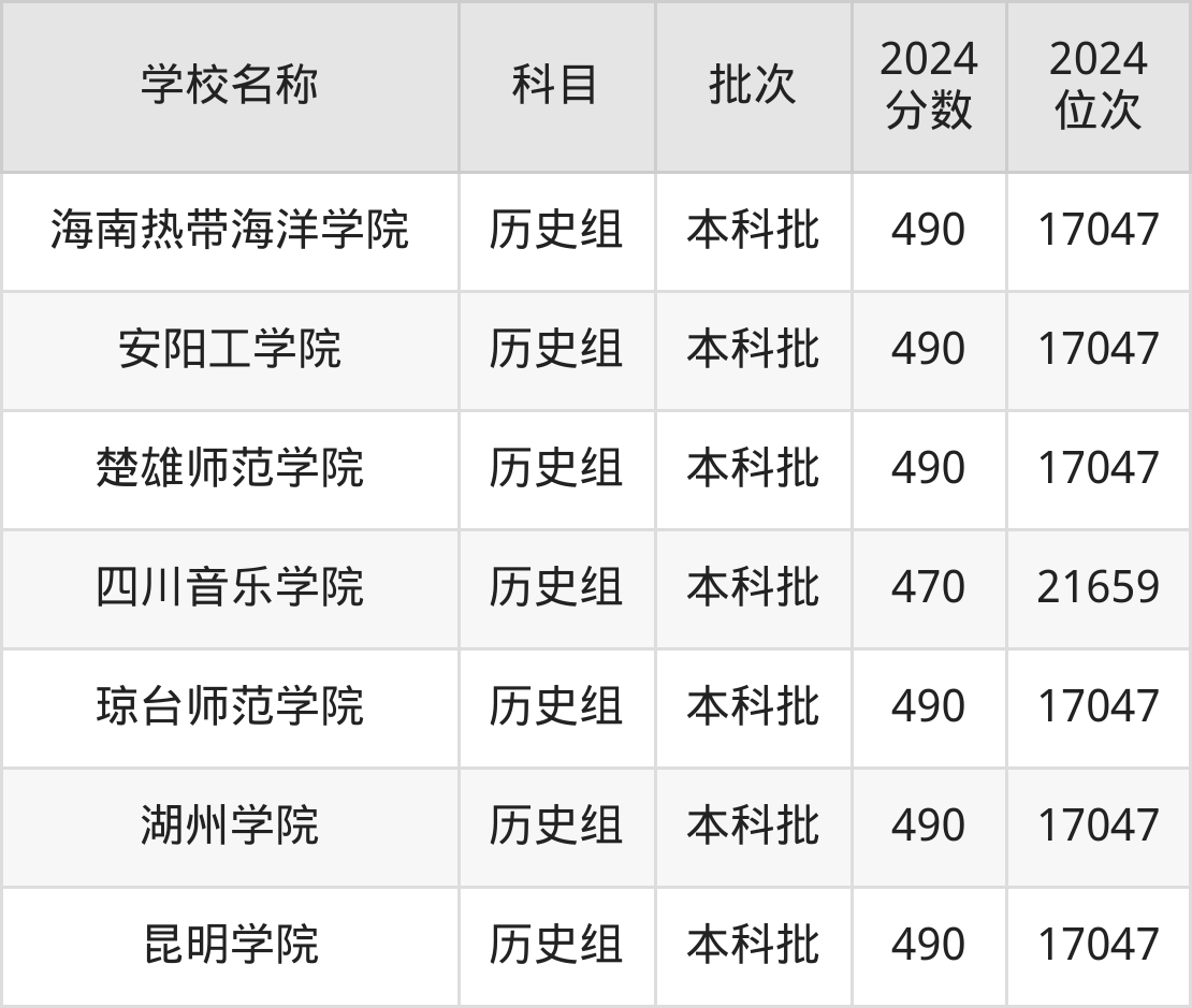 湖南高考历史组共有190所二本公办大学在460到490分之间录取,包含黔南民族师范学院、铜仁学院、昆明学院、潍坊学院、石家庄学院、湖南文理学院、邵阳学院、汉江师范学院、成都体育学院、湖南财政经济学院。