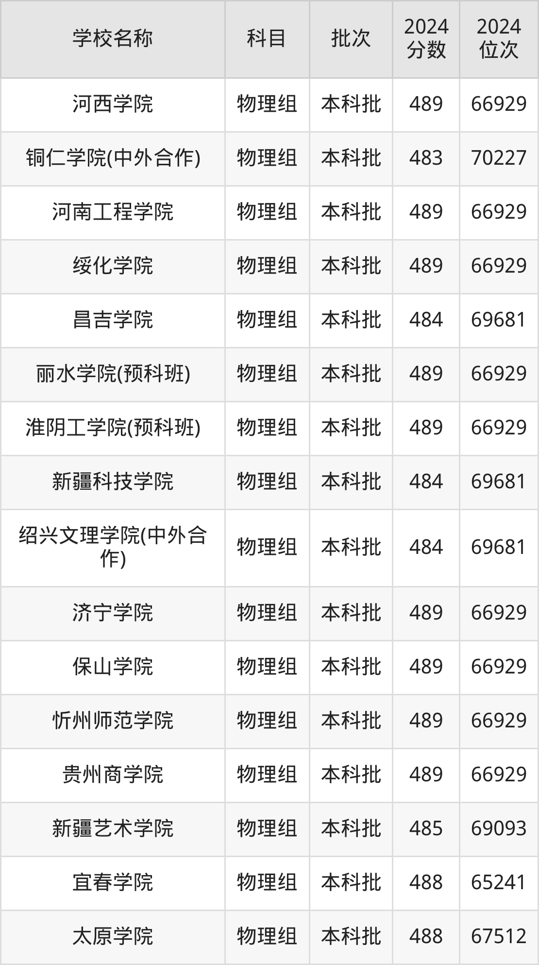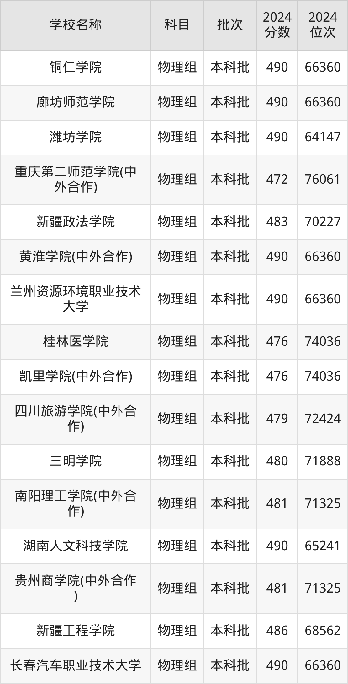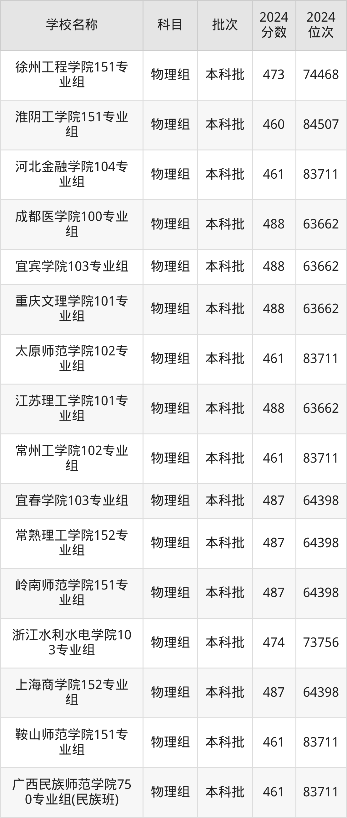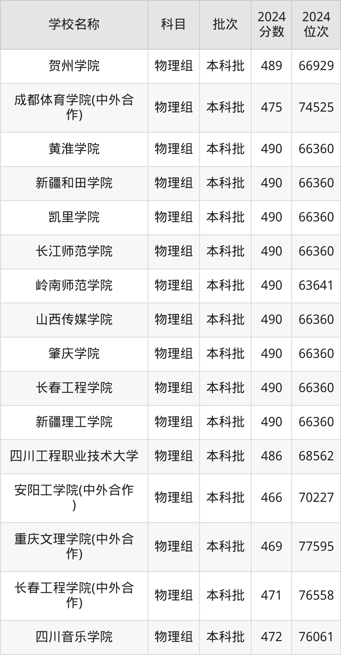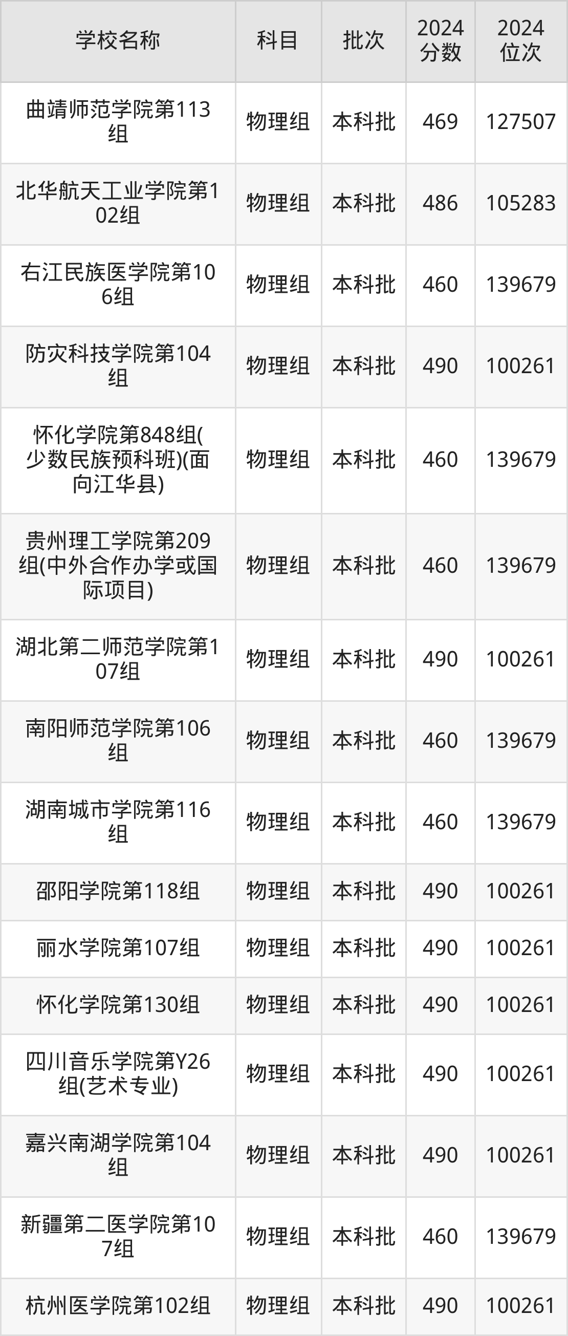 一、460到490分的二本公办大学最低分一览表