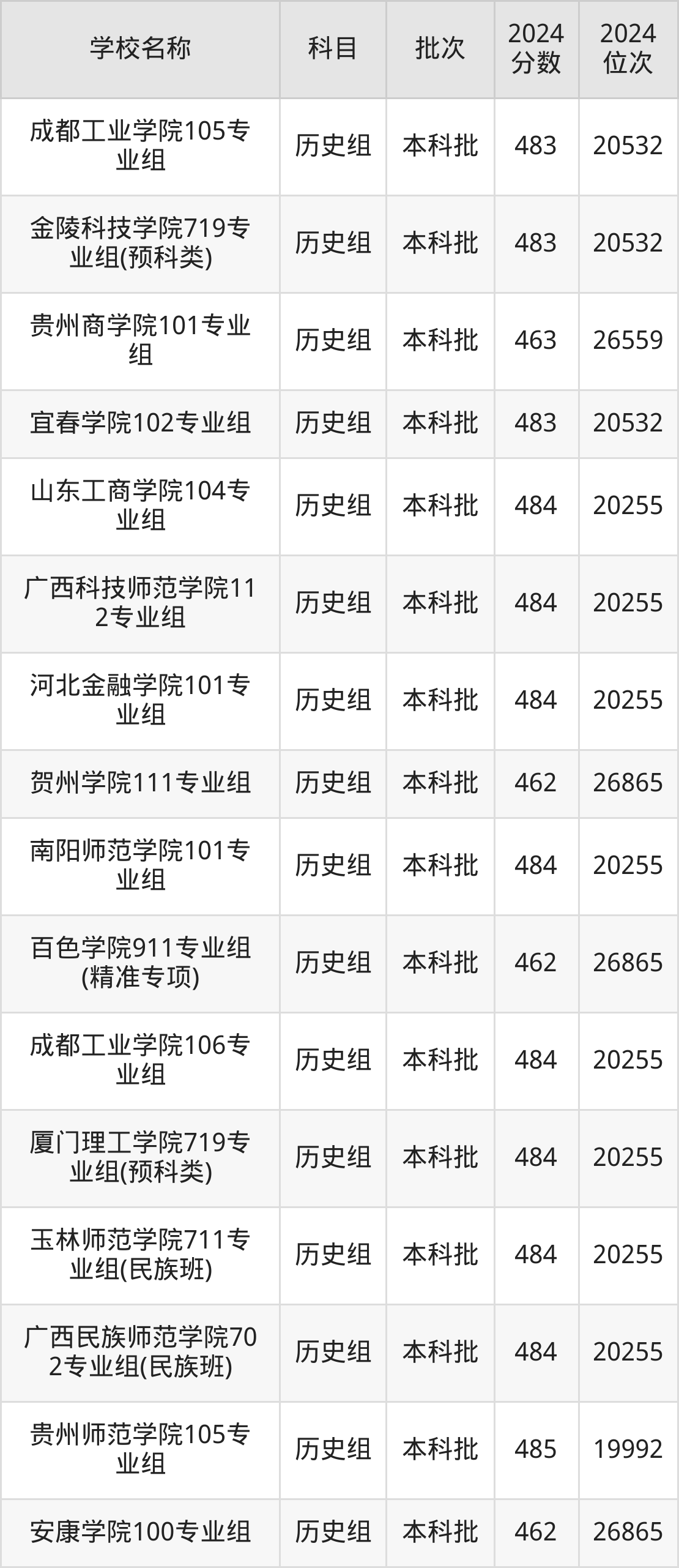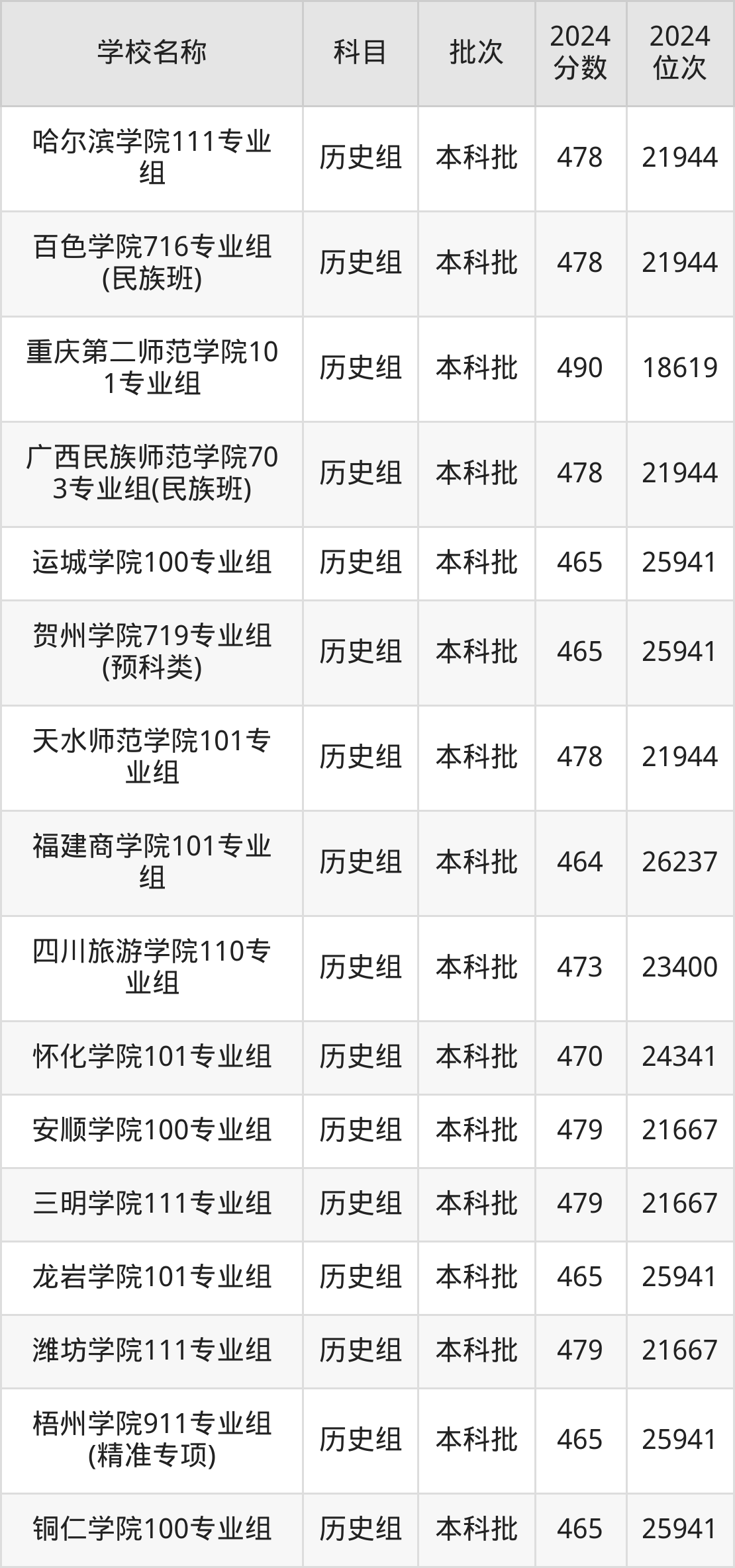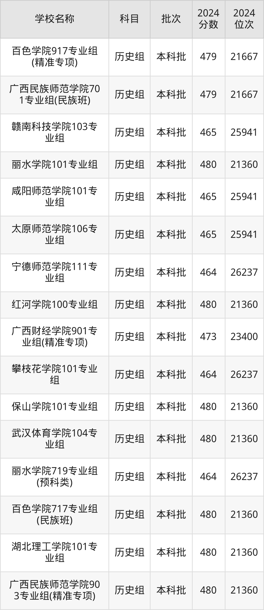 广西高考历史组共有116所二本公办大学在460到490分之间录取,包含重庆第二师范学院、湖州师范学院、徐州工程学院、贵州师范学院、山东交通学院、盐城师范学院、肇庆学院、绍兴文理学院、阿坝师范学院、乐山师范学院。